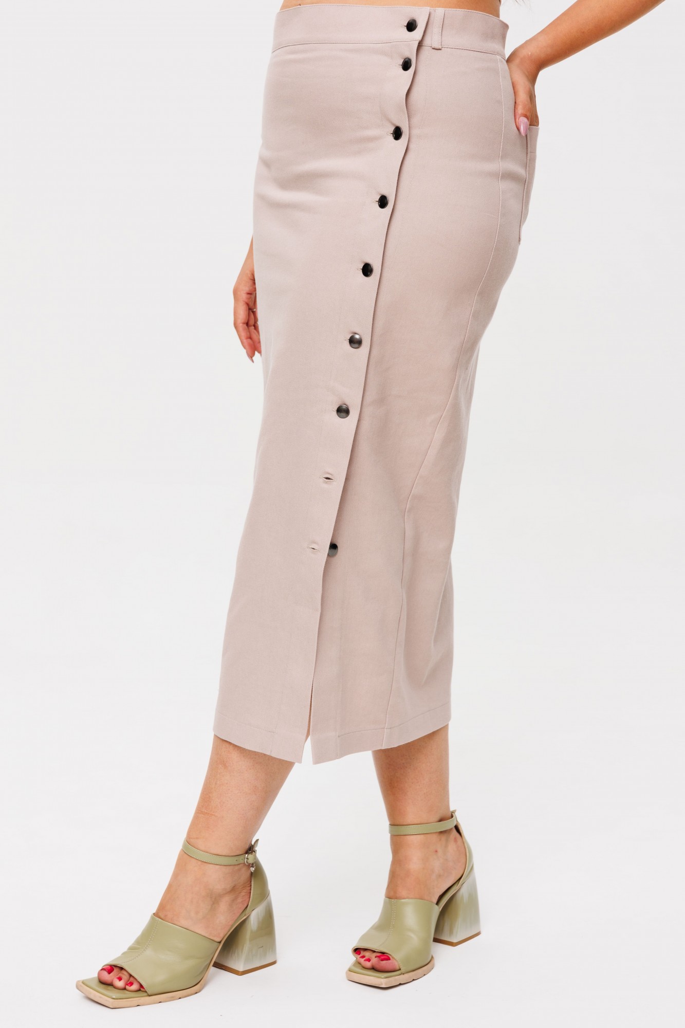 Кнопки спереди позволяют регулировать длину выреза, добавляя образу уникальность и удобство. Два кармана сзади не только придают юбке стильный вид, но и обеспечивают функциональность.