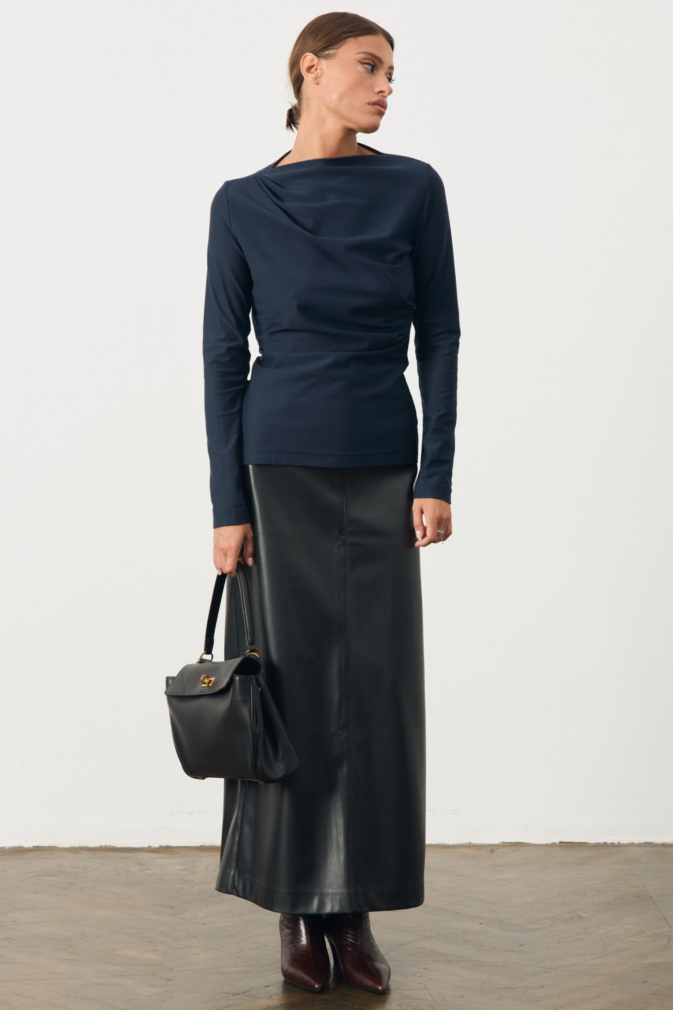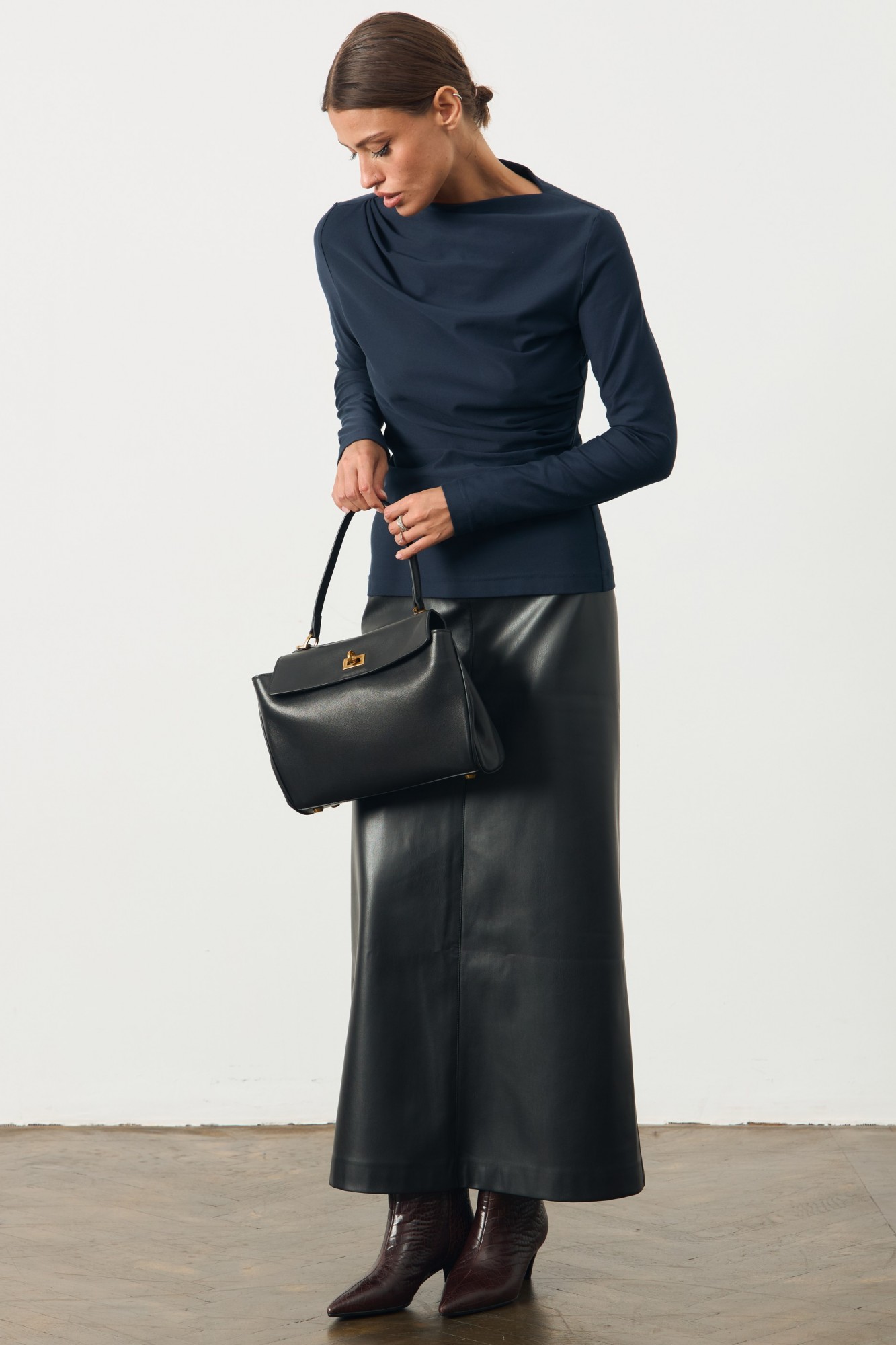 Юбка в длине миди из экокожи в глубоком сером цвете. Юбка на поясе, по переду потайная молния.