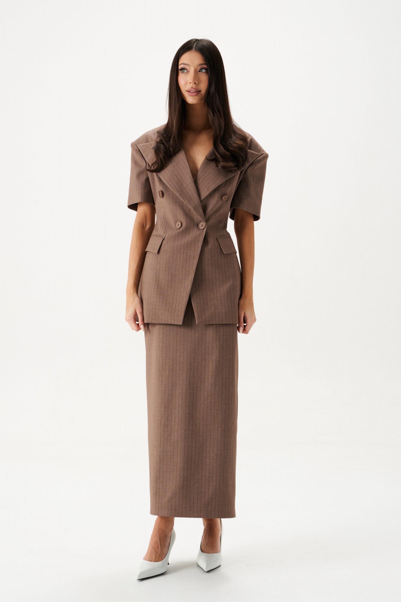Юбка-миди полуприлегающего силуэта. Выполнена из костюмной ткани цвета капучино в тонкую полоску. Прямой крой, пояс стабильный. Есть подкладка. Застёжка потайная тесьма молния. В среднем шве заднего полотна изделия разрез 50 см.