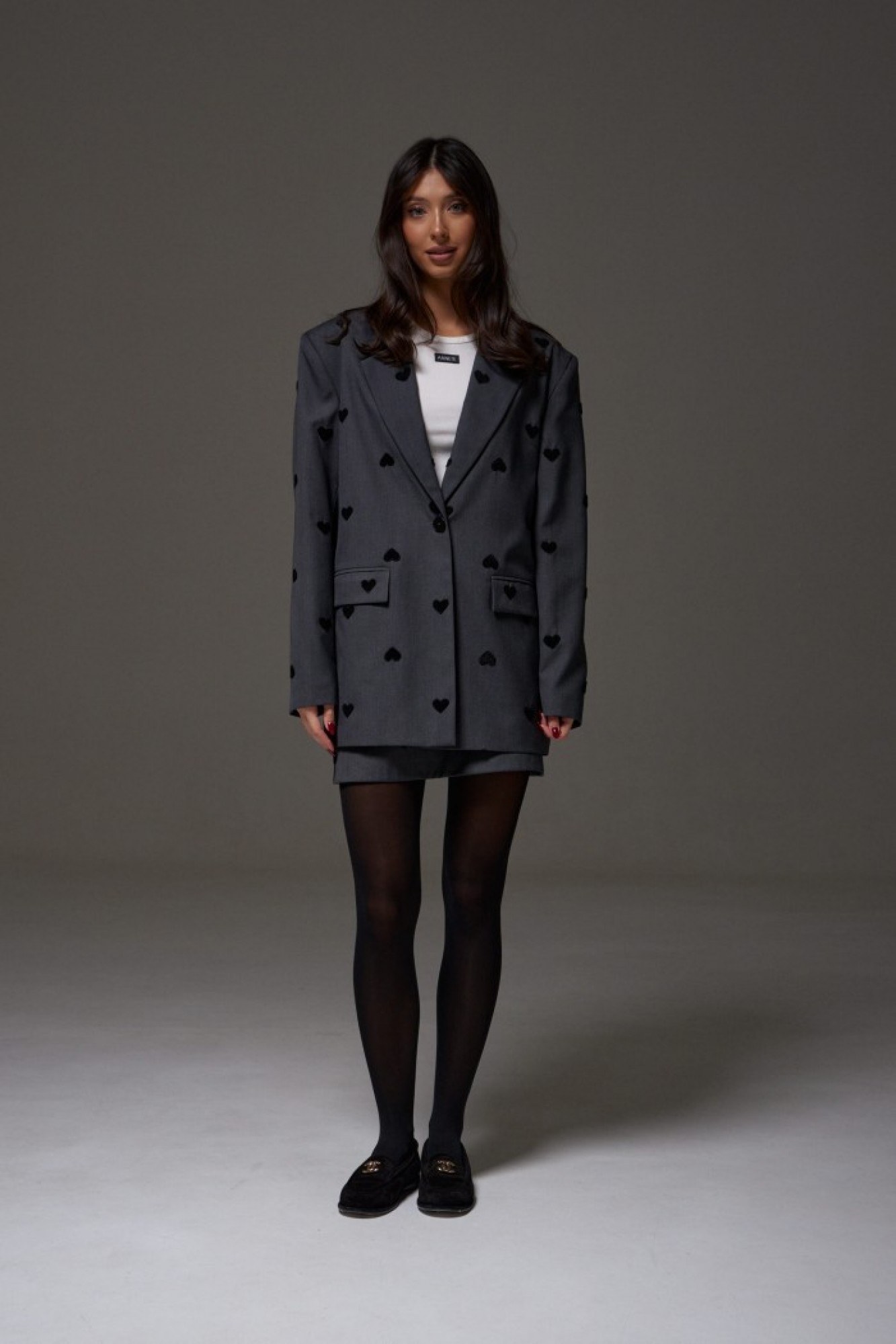 Юбка-мини прямого кроя. Выполнена из костюмной ткани серого цвета, декорированной черными сердечками. Силуэт - трапеция, брендированная подкладка. Застежка - потайная молния в шве заднего полотна изделия.