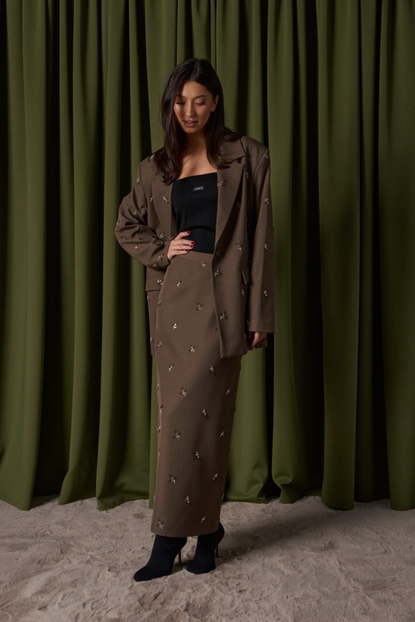 Юбка прямого кроя. Выполнена из костюмной ткани цвета хаки с декоративной вышивкой. На брендированной подкладке. Пояс стабильный. В среднем шве заднего полотна разрез (49 см). Застёжка молния в среднем шве заднего полотна.