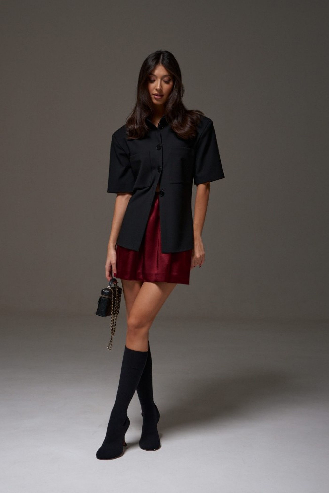 Юбка прямого кроя, выполнена из струящейся ткани бордового цвета. Характеристики: прямой крой, на подкладке, пояс на резинке.