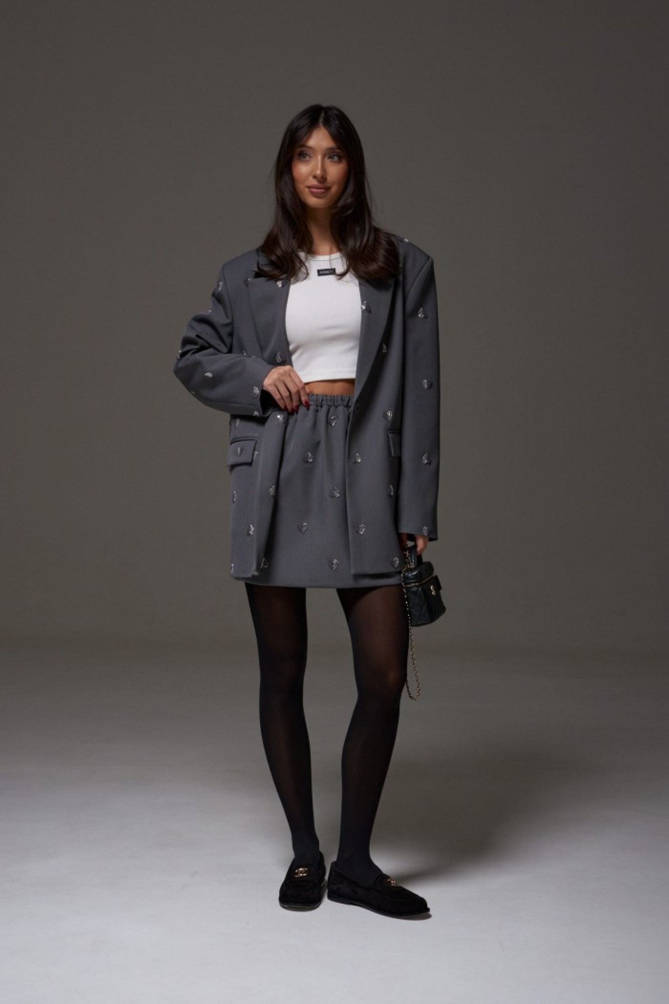 Юбка прямого кроя, выполнена из костюмной ткани серого цвета, с декоративной вышивкой в виде сердечек. Характеристики: прямой крой, на брендированной подкладке, пояс на резинке.