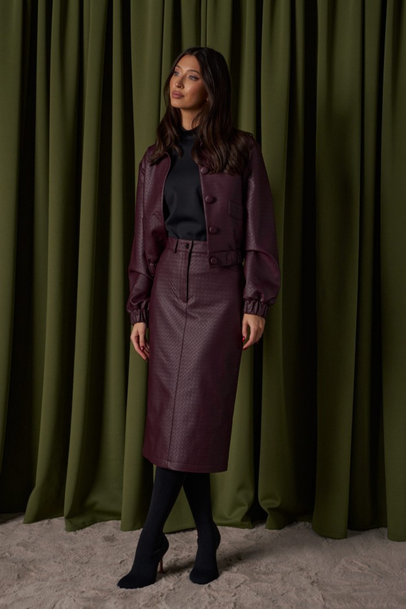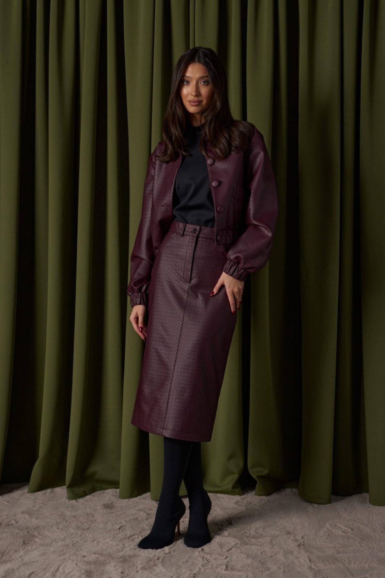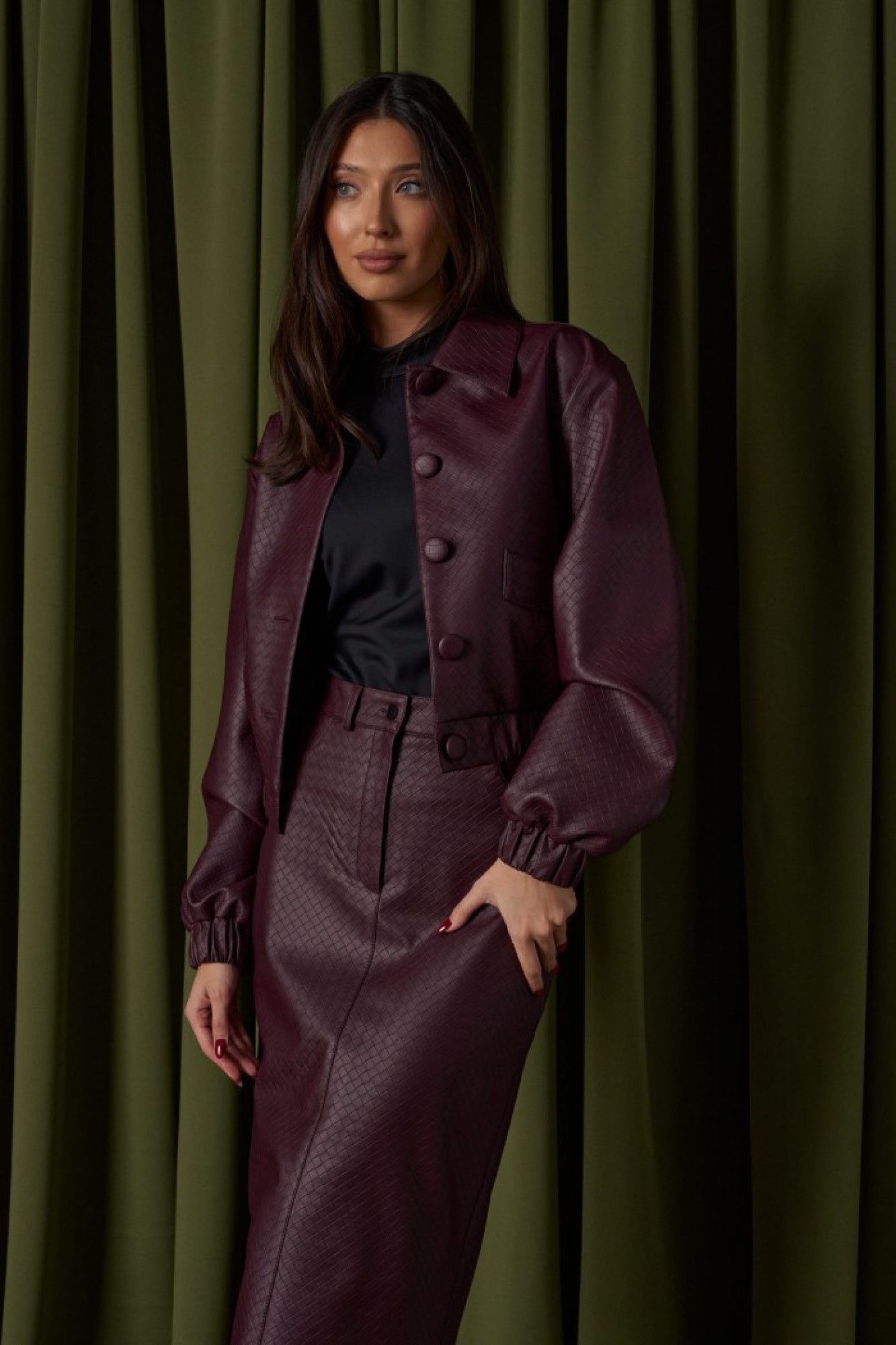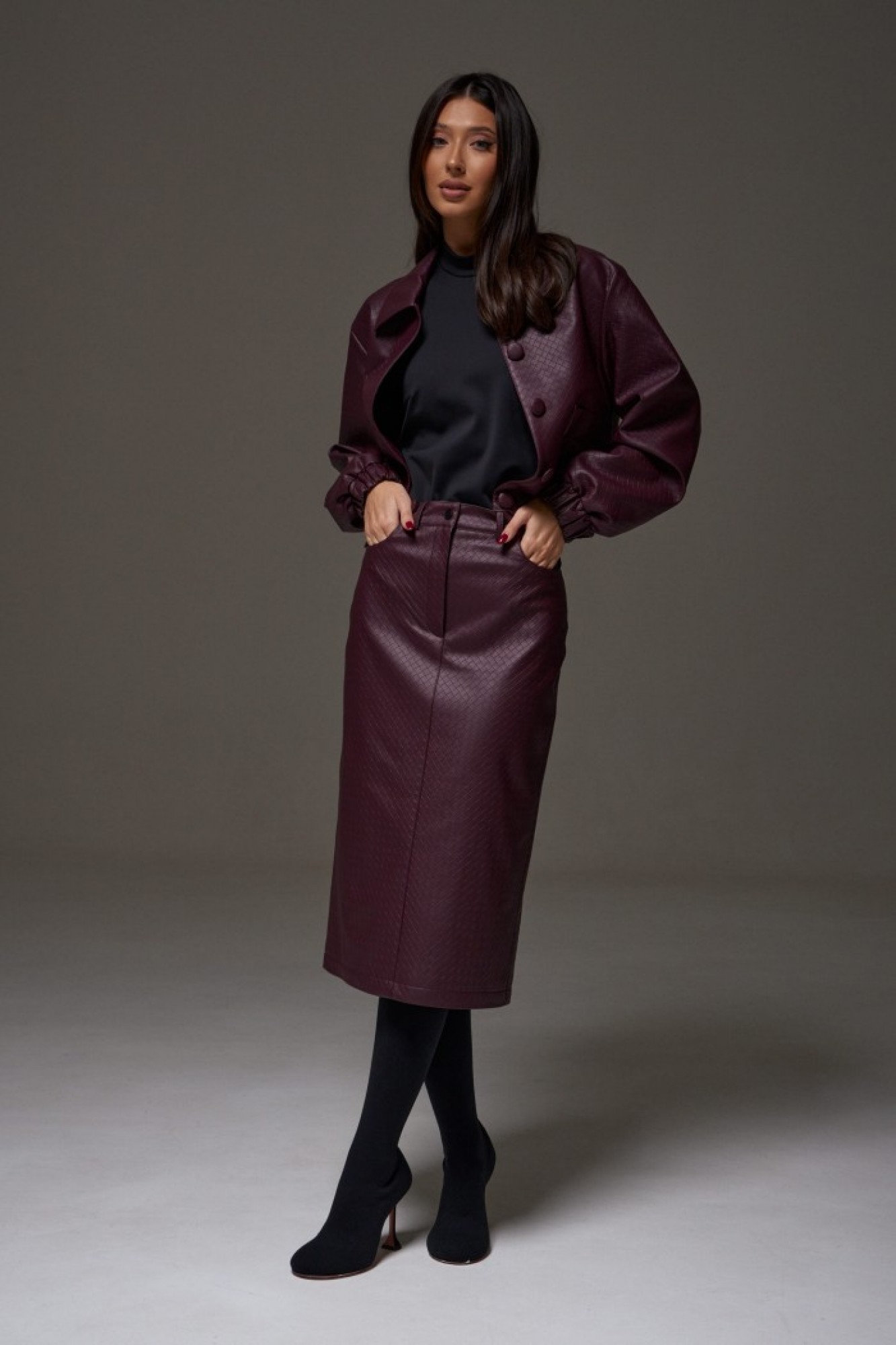 Юбка прямого кроя выполнена из фактурной эко-кожи бордового цвета. Характеристики: прямой крой, пояс стабильный со шлевками, на брендированной подкладке, застёжка центральная пуговица, молния, по передней части изделия прорезные карманы, по заднему полотну накладные карманы.