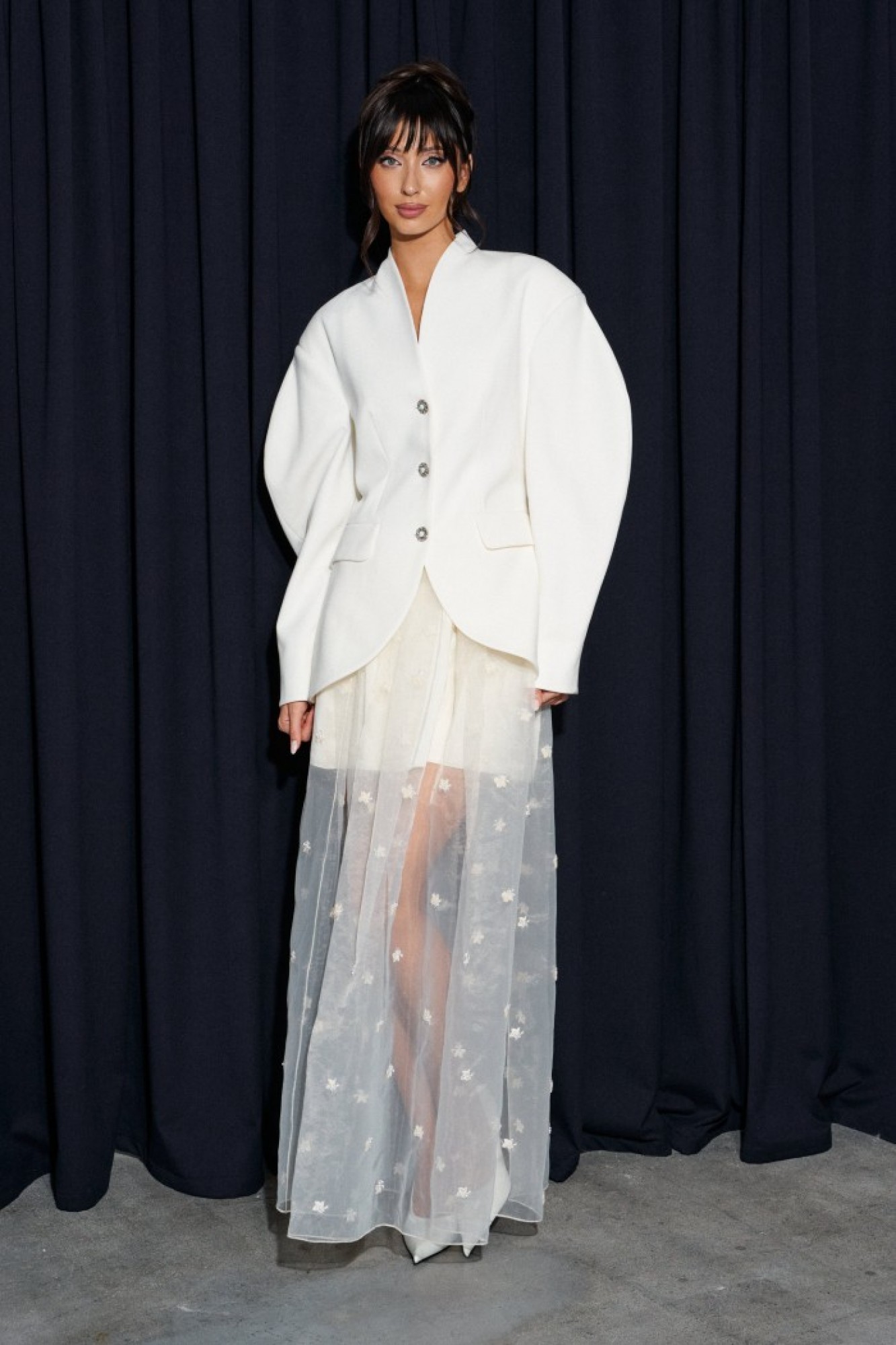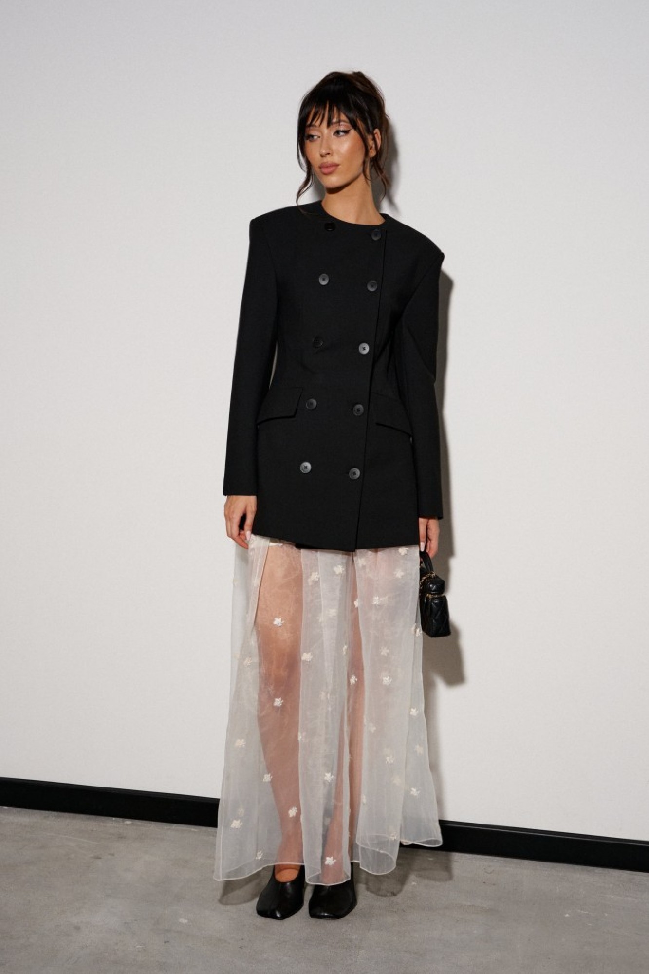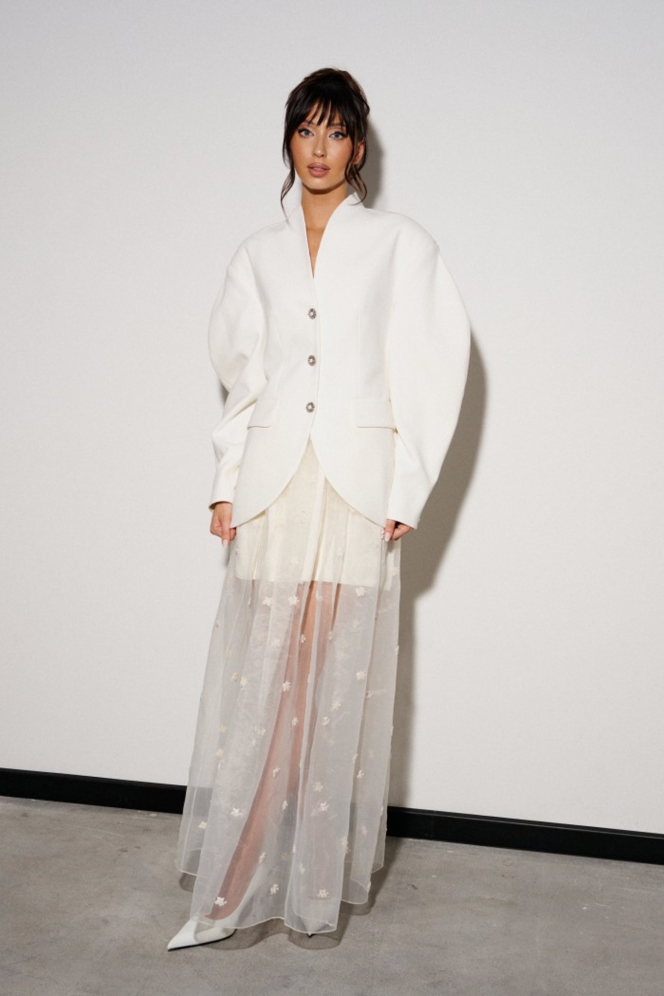 Юбка кроя полусолнце, выполнена из прозрачной ткани молочного оттенка с декоративной вышивкой. Характеристики: крой полусолнце, подкладка юбочка, пояс на резинке со сборкой.