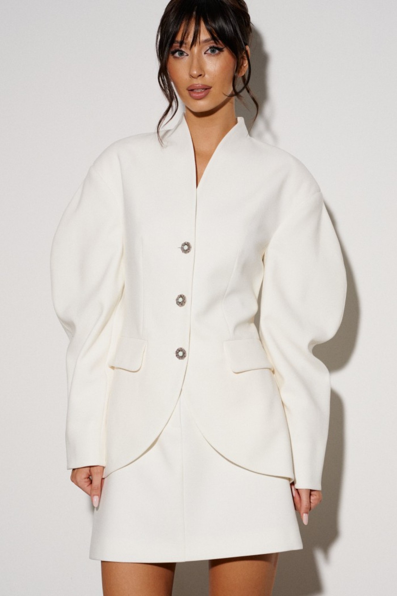 Юбка А-силуэта, выполнена из костюмной ткани белого цвета. Характеристики: пояс стабильный, застёжка центральная пуговица и потайная молния, по переду выточки, на подкладке.