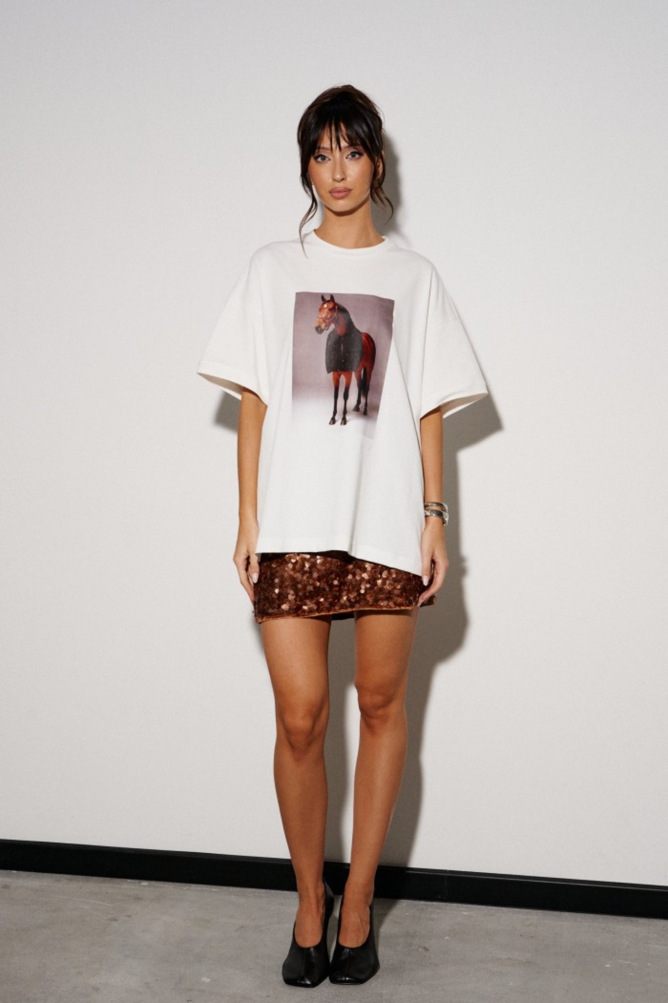Юбка прямого кроя выполнена из бархатного полотна светло-коричневого цвета с пайетками. Характеристики: прямой крой, подкладка, пояс на резинке.