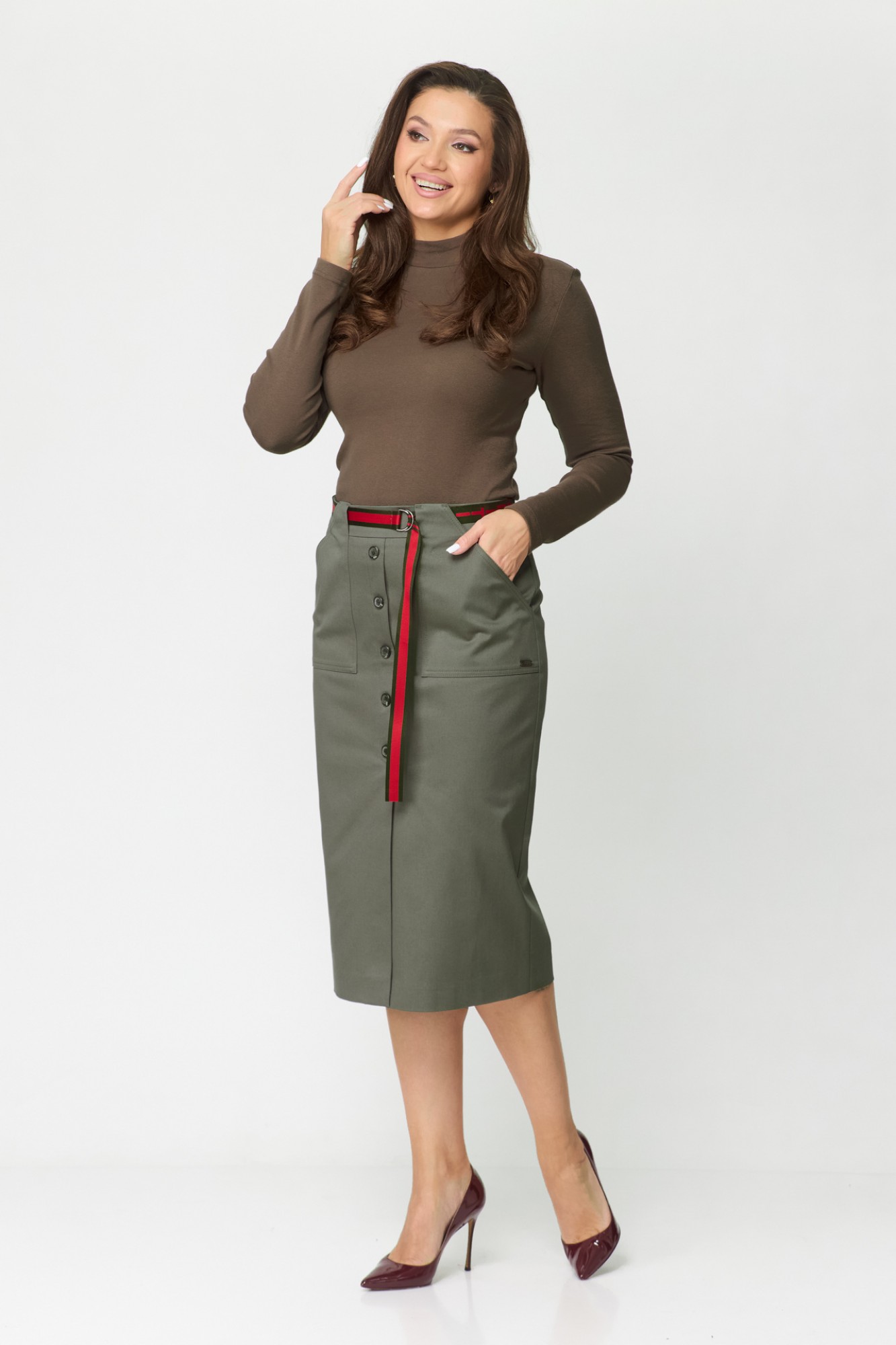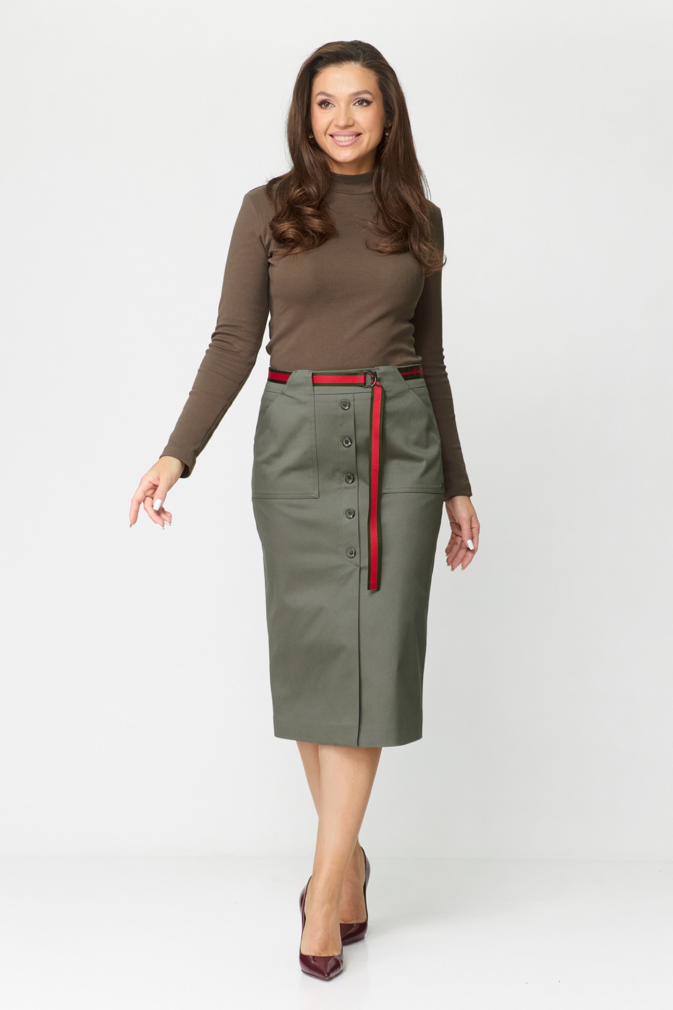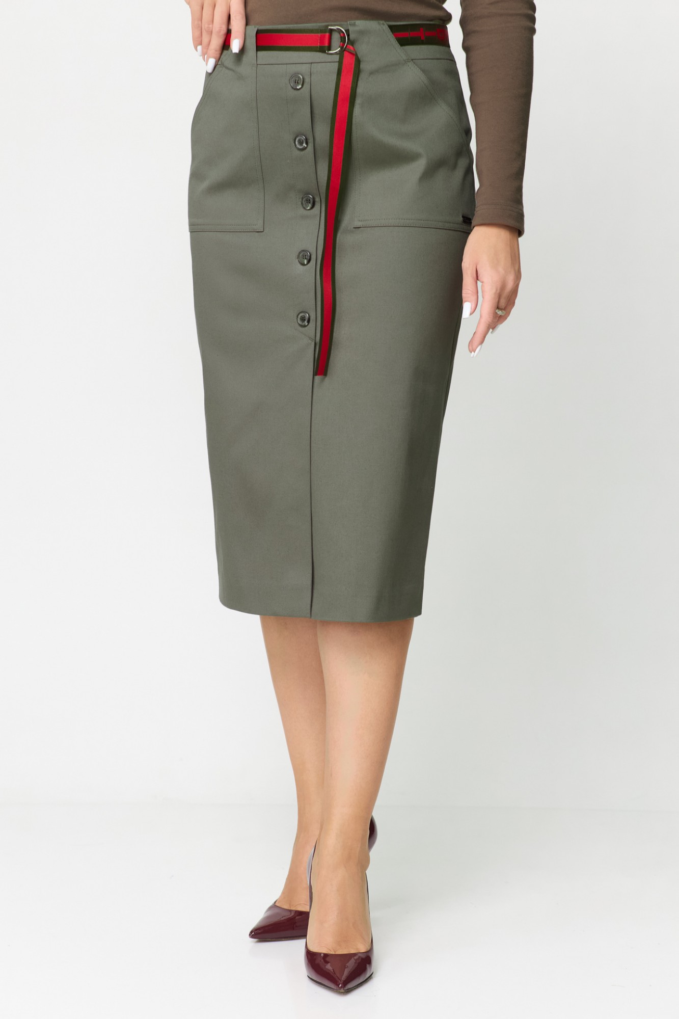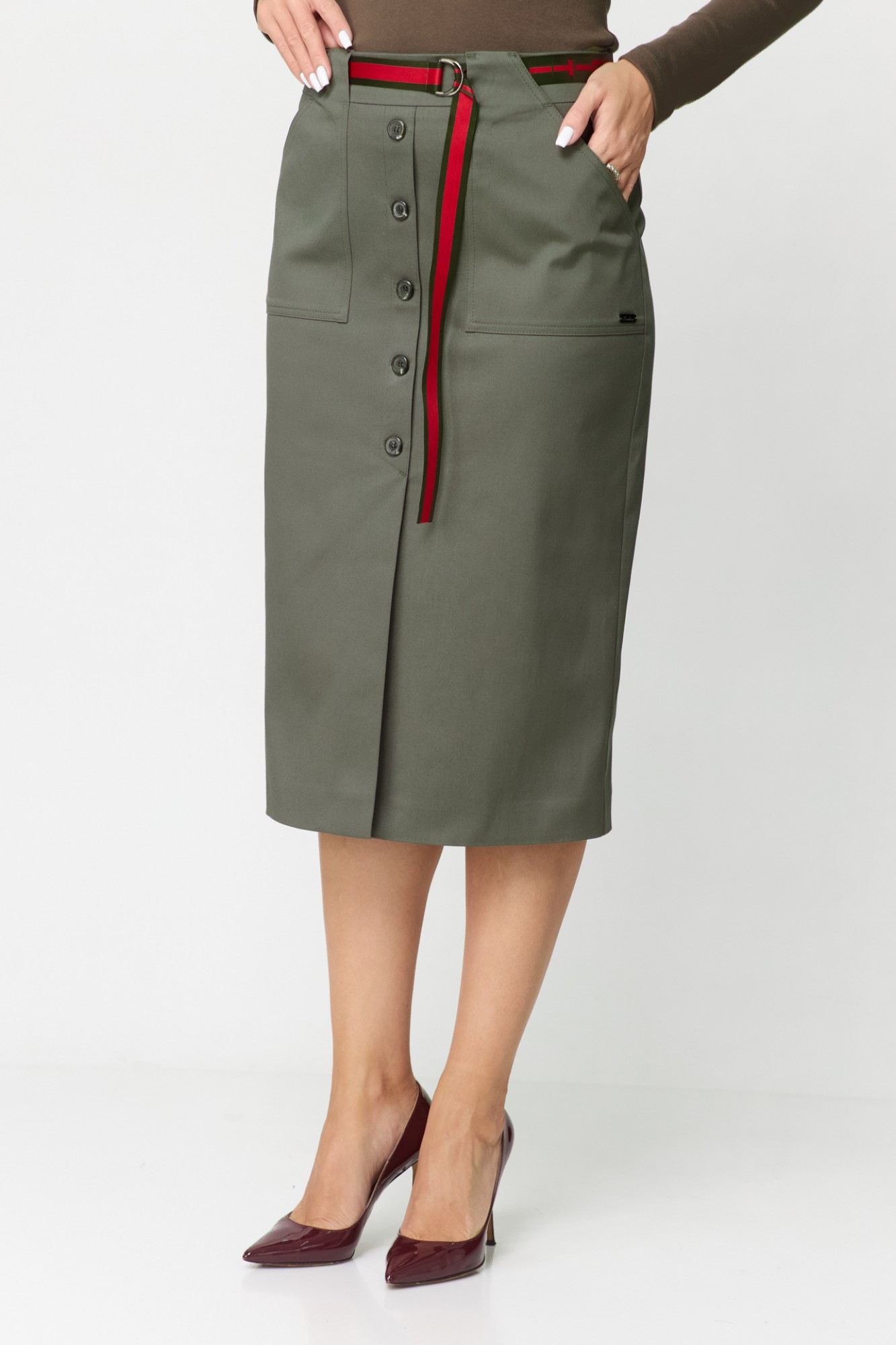 Юбка женская из хлопковой ткани. На подкладке, прямого силуэта, заужена к низу. Притачной пояс-кокетка, настрочены по переду накладные карманы и обработана по центру планка, которая заканчивается шлицей. Спинка со средним швом и талиевыми вытачками. В среднем шве застежка на потайную тесьму-молнию. К юбке прилагается пояс.