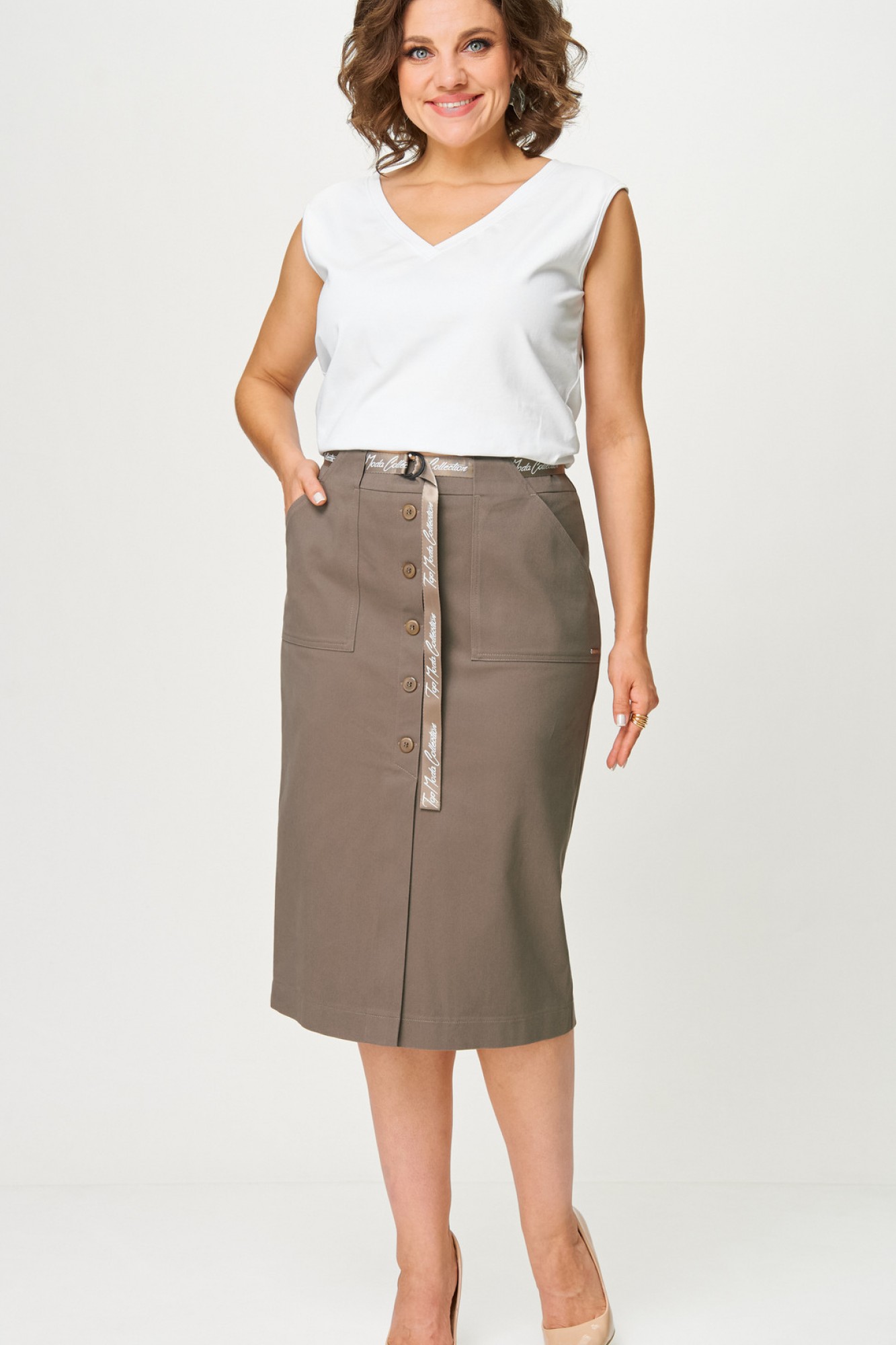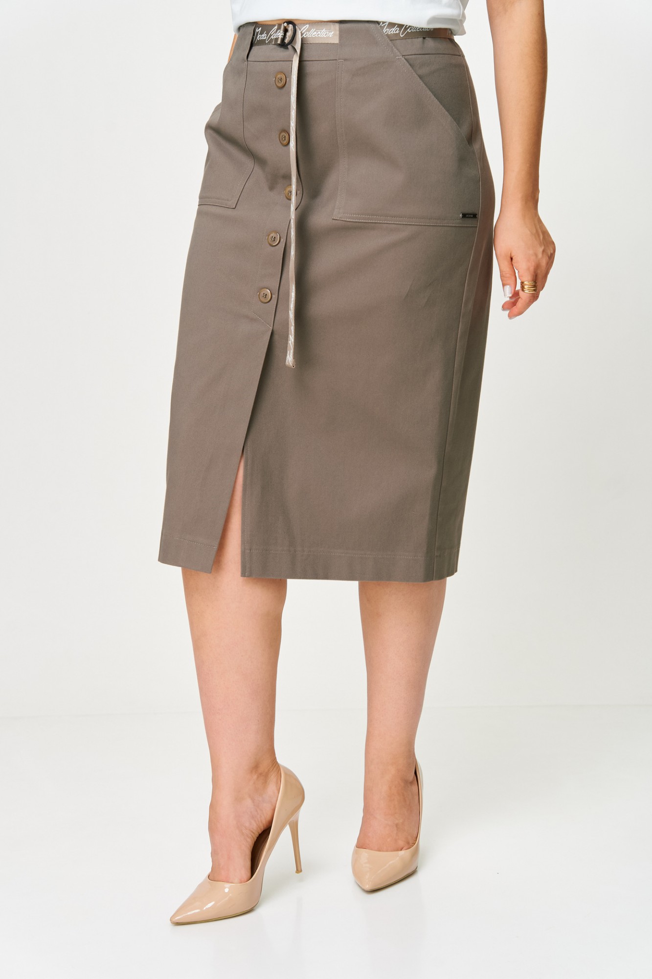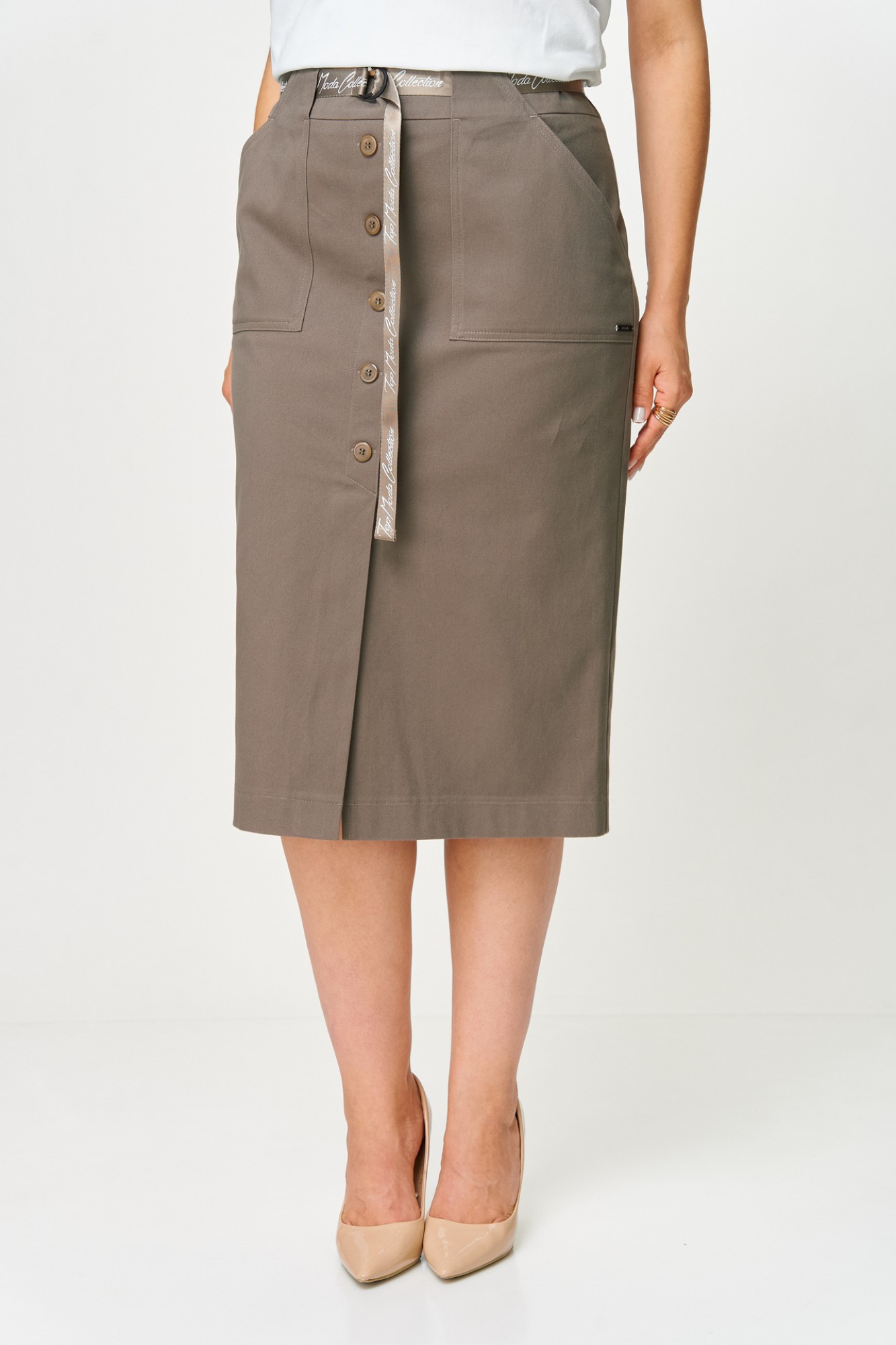 Юбка женская из хлопковой ткани. На подкладке, прямого силуэта, заужена к низу. Притачной пояс-кокетка, настрочены по переду накладные карманы и обработана по центру планка, которая заканчивается шлицей. Спинка со средним швом и талиевыми вытачками. В среднем шве застежка на потайную тесьму-молнию. К юбке прилагается пояс.