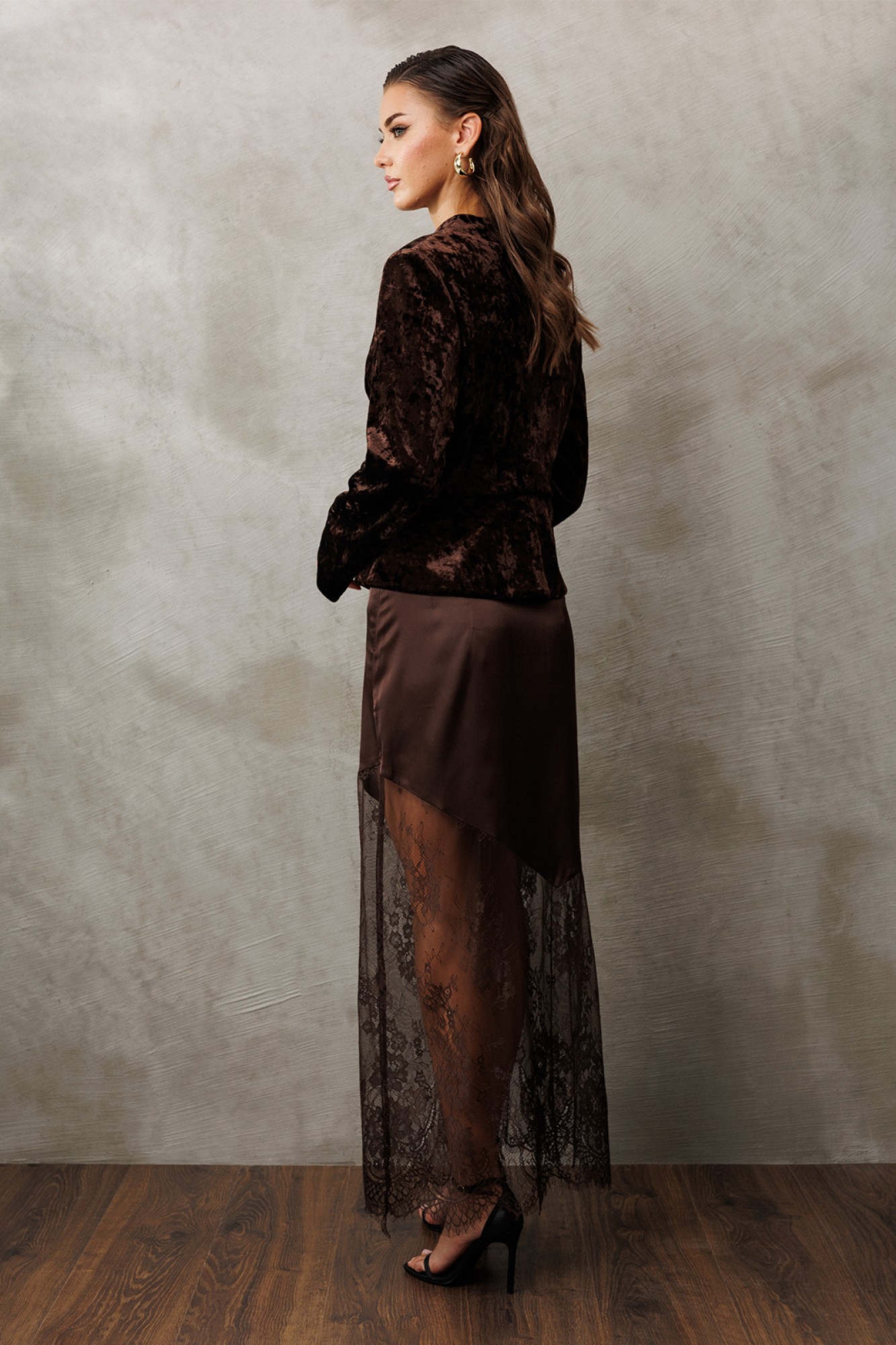 Юбка прямого силуэта из атласа и кружева. Юбка на обтачке. По переднему и заднему полотнищам юбки - вытачки. Юбка с застежкой в боковом шве на потайную тесьму-молнию. Верхняя часть юбки из атласа с асимметричный краем, нижняя часть юбки из кружева с ажурным низом. Юбка без подкладки.