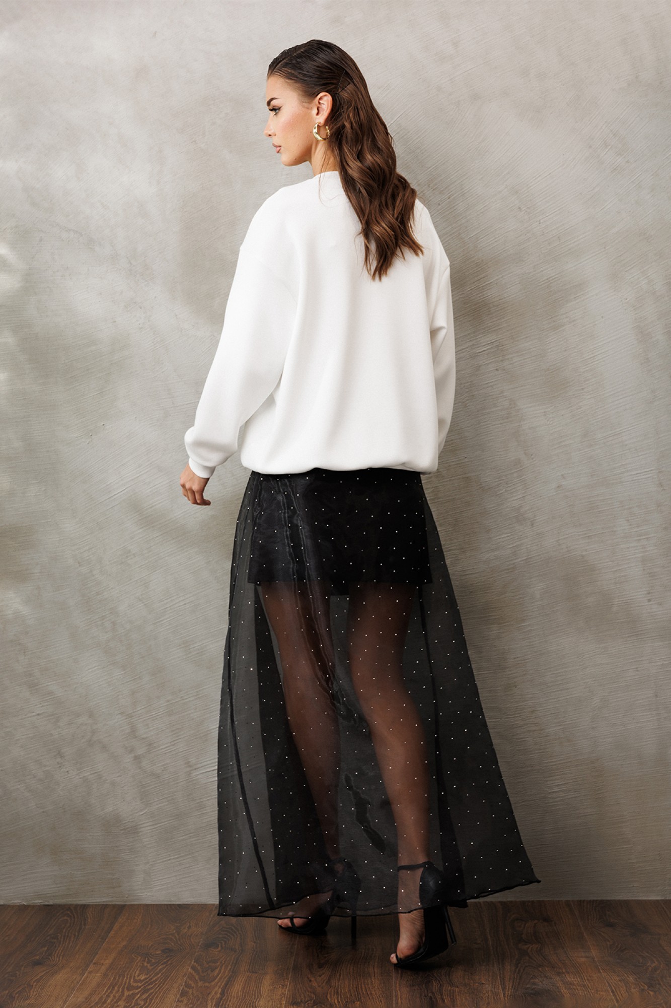 Юбка А-образного силуэта, длинная с застежкой на потайную тесьму-молнию в боковом шве. Верхняя юбка из органзы со стразами, нижняя короткая юбка из костюмной ткани. Верх юбки на обтачке.