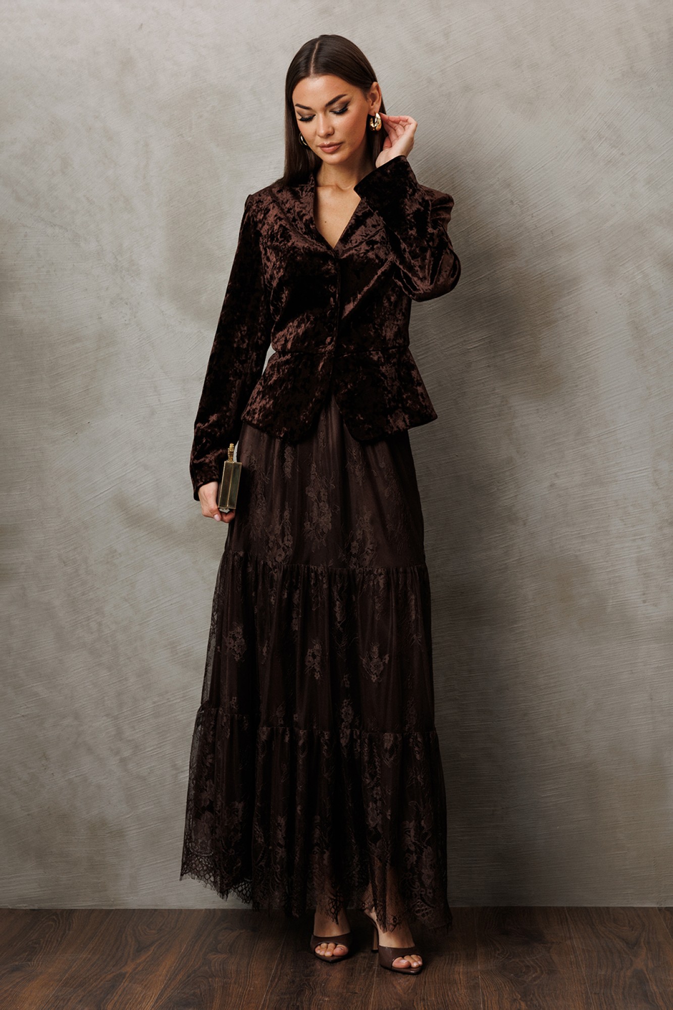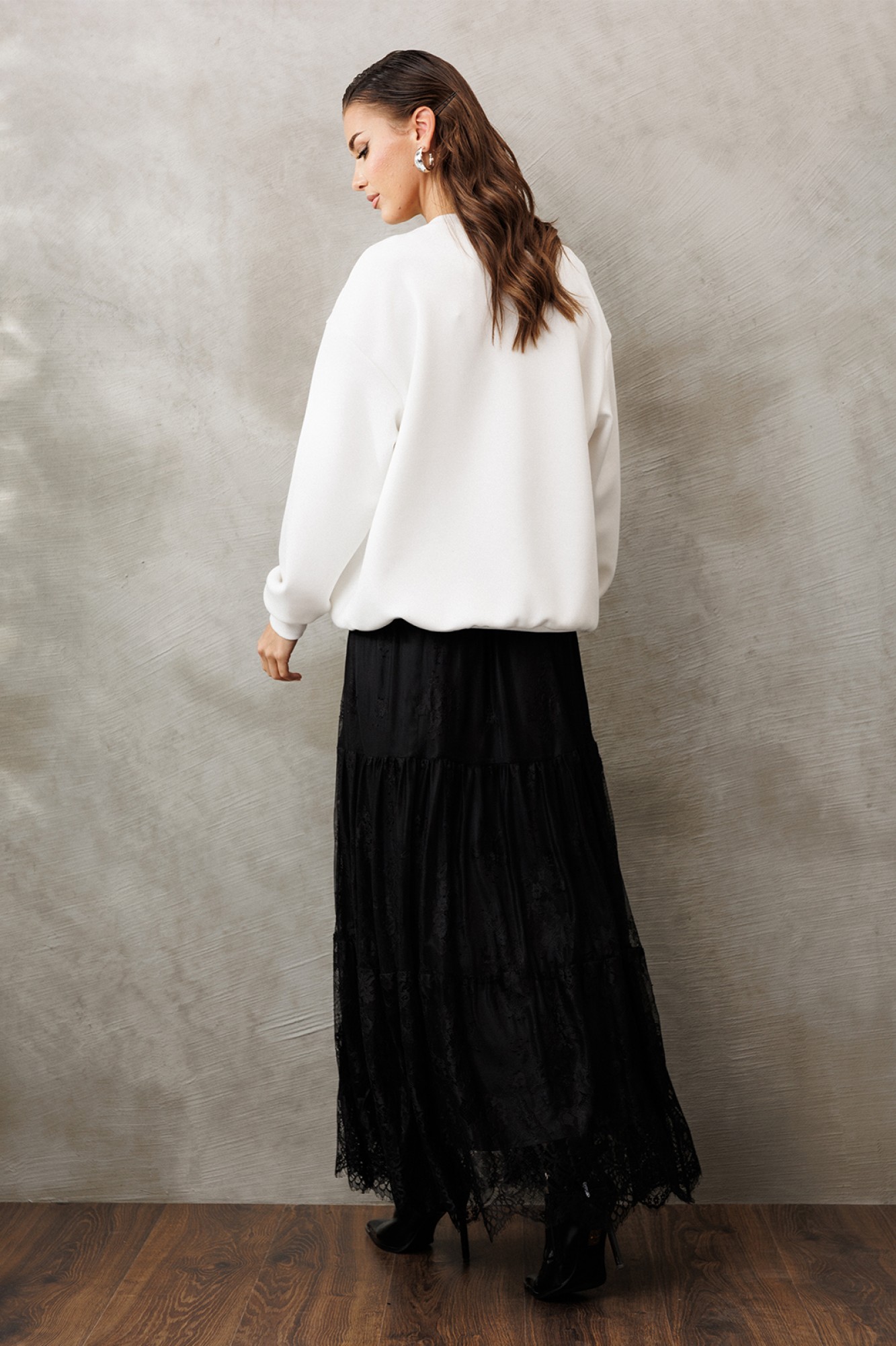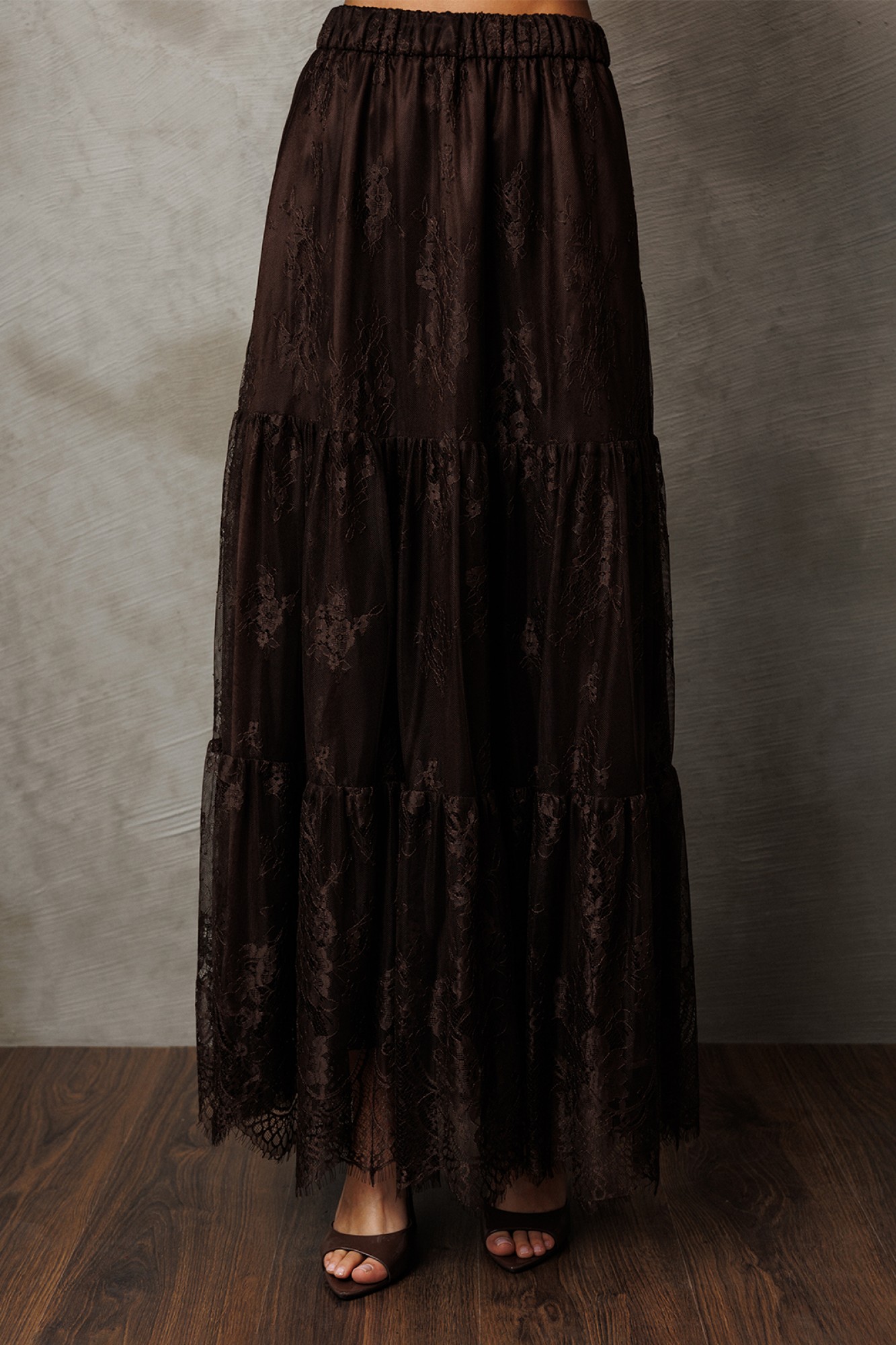 Юбка из кружева длинная на притачном поясе из кружева со вставленной в него резинкой. Юбка с 2-мя притачными слегка присборенными воланами. Юбка на подкладке.