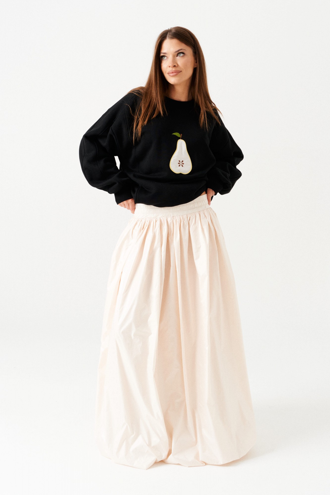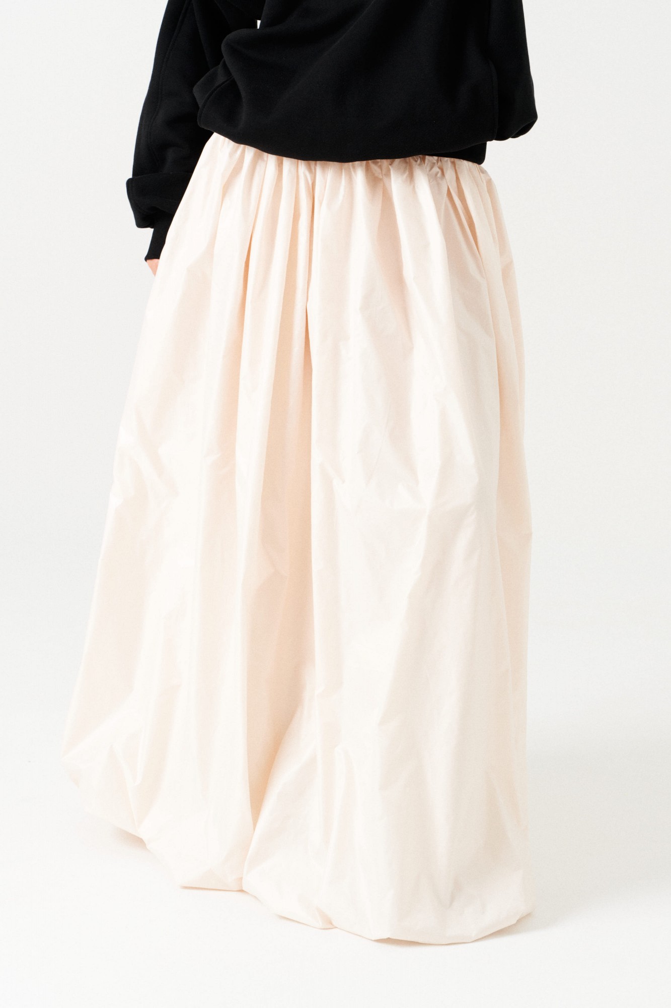 Юбка-баллон большого объема, расширенная книзу, со сборкой по верхнему и нижнему срезу, на притачной подкладке. Пояс на резинке. Длина – макси.