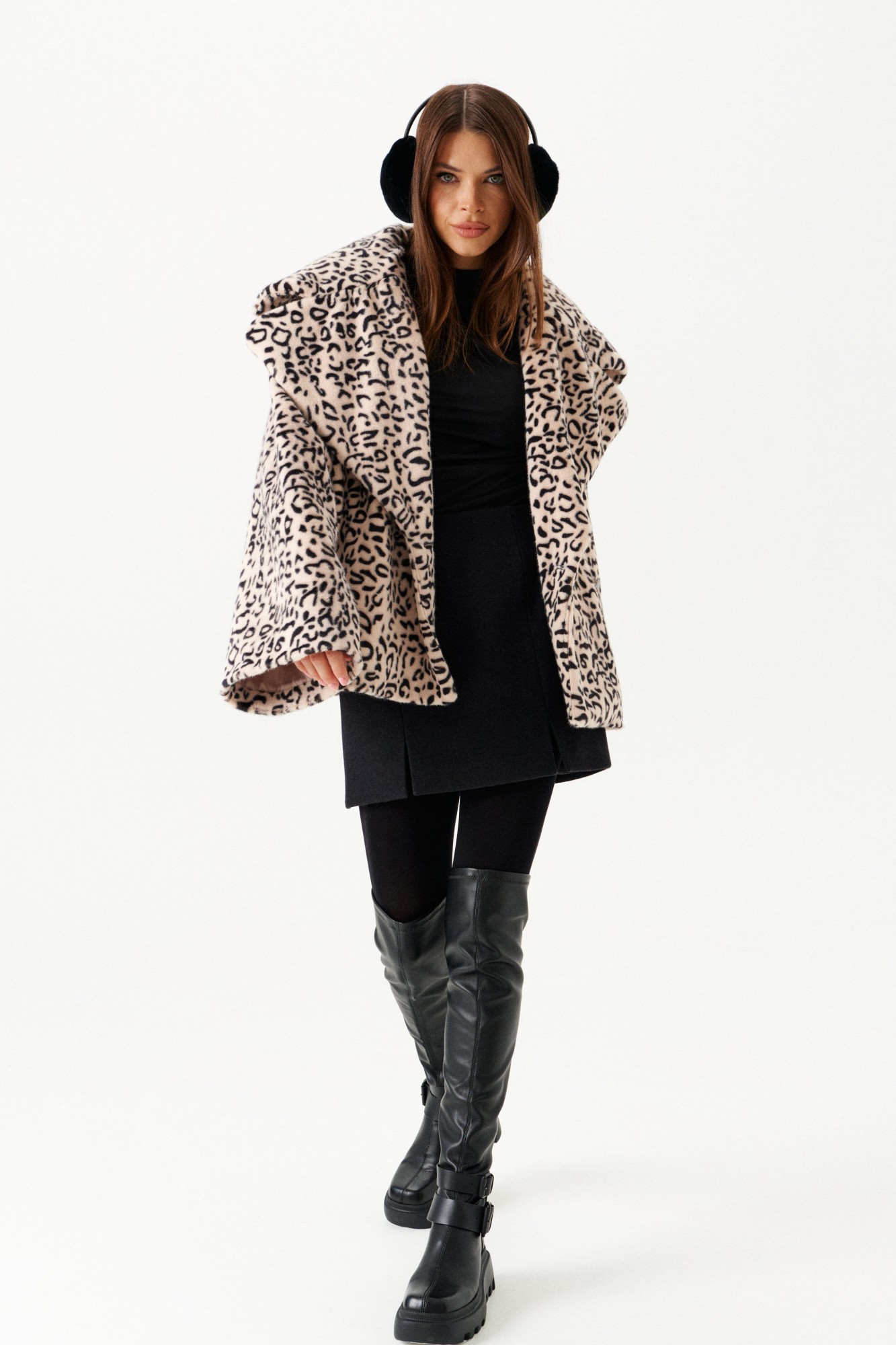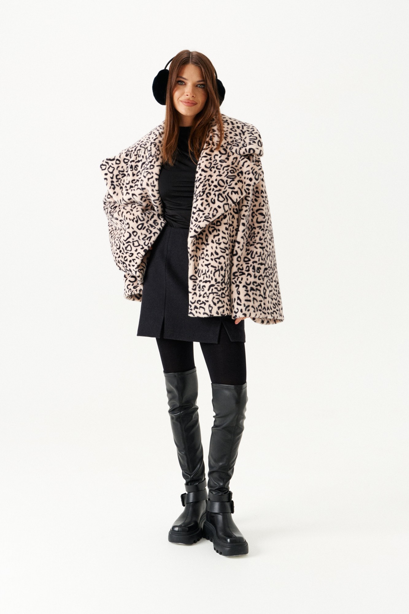 Юбка из пальтовой ткани прямого силуэта, на подкладке, с застежкой на потайную молнию в среднем шве заднего полотнища. Переднее полотнище с вертикальными рельефами и разрезами. Юбка без пояса, на цельнокроеной обтачке. На заднем полотнище две таллиевые вытачки.