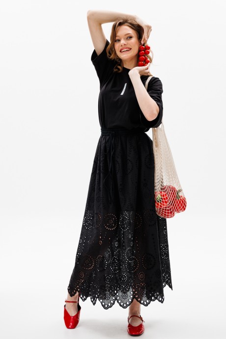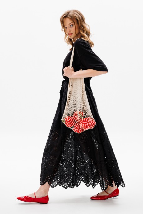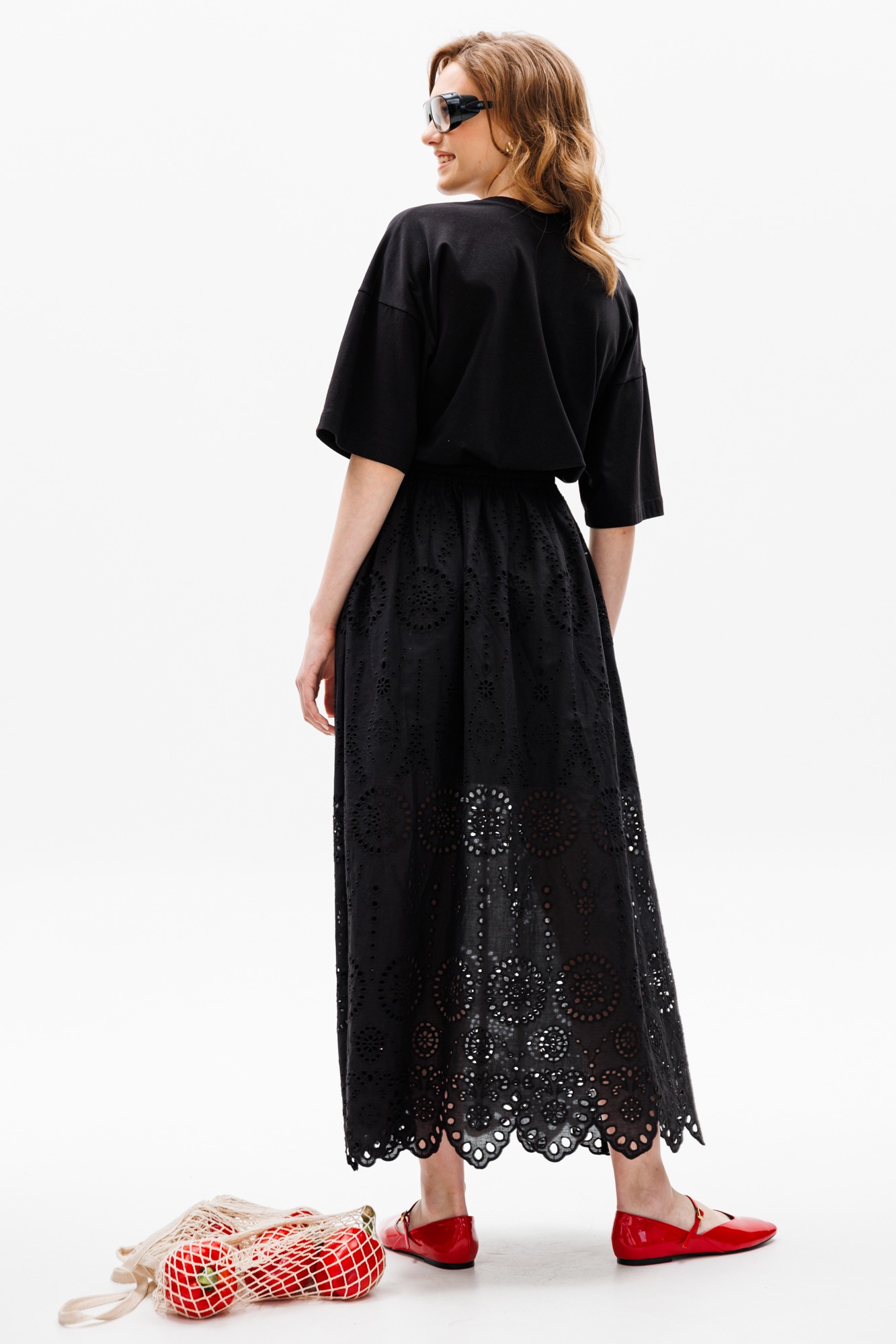 Юбка выполнена из хлопка с вышивкой. Юбка А-образного силуэта, длиной миди на притачном поясе. Переднее и заднее полотнище цельные, расширенные к низу. В боковых швах обработаны карманы. По центру пояса петли, в пояс втянут в шнур. По низу фестоны. Юбка на отлетной по низу подкладке.