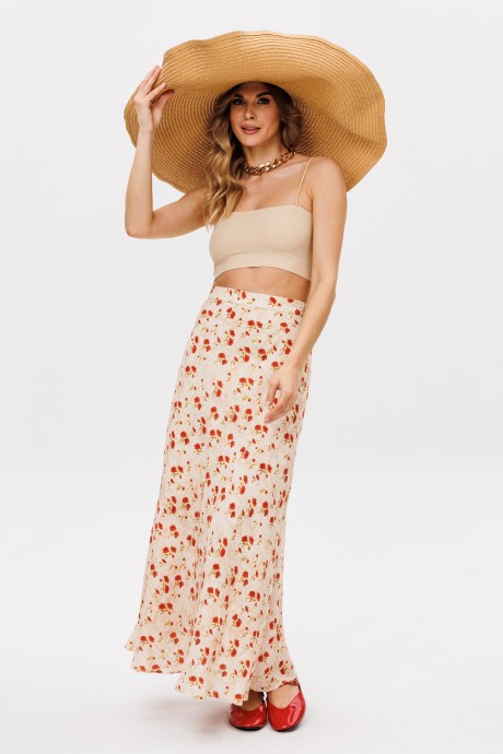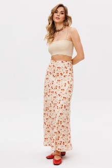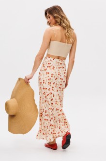 Юбка выполнена из плательной ткани с цветочным принтом. Юбка А-образного силуэта, длиной миди, на притачном поясе. Переднее и заднее полотнище выкроены по косой. В левом боковом шве застежка на потайную молнию. Пояс застегивается на пуговицу. Юбка на отлетной по низу подкладке.