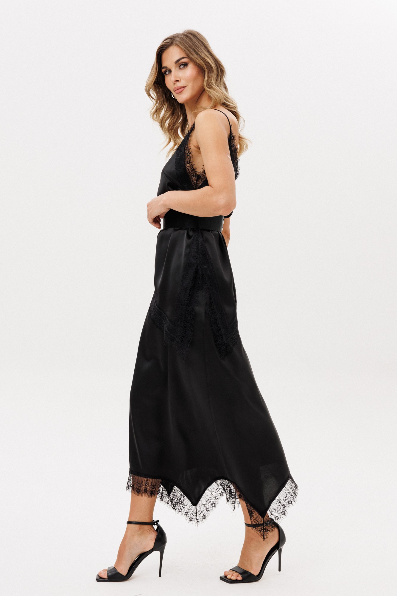 Юбка выполнена из атласа. Юбка А-образного силуэта, длиной миди. Переднее и заднее полотнище цельные и расширены к низу. Низ юбки фигурной формы, обработан кружевом. Застежка в левом боковом шве на потайную молнию и пуговицу. Юбка без подкладки.