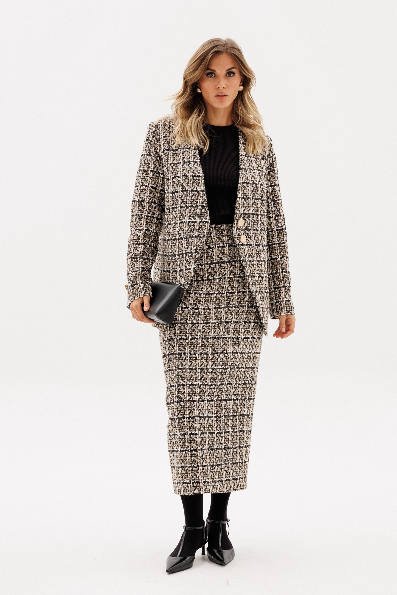 Юбка выполнена из твида. Юбка заужена к низу, длиной миди. Юбка на притачном поясе. Сзади в среднем шве разрез и застежка на потайную молнию и пуговицу. Юбка на отлетной по низу подкладке.