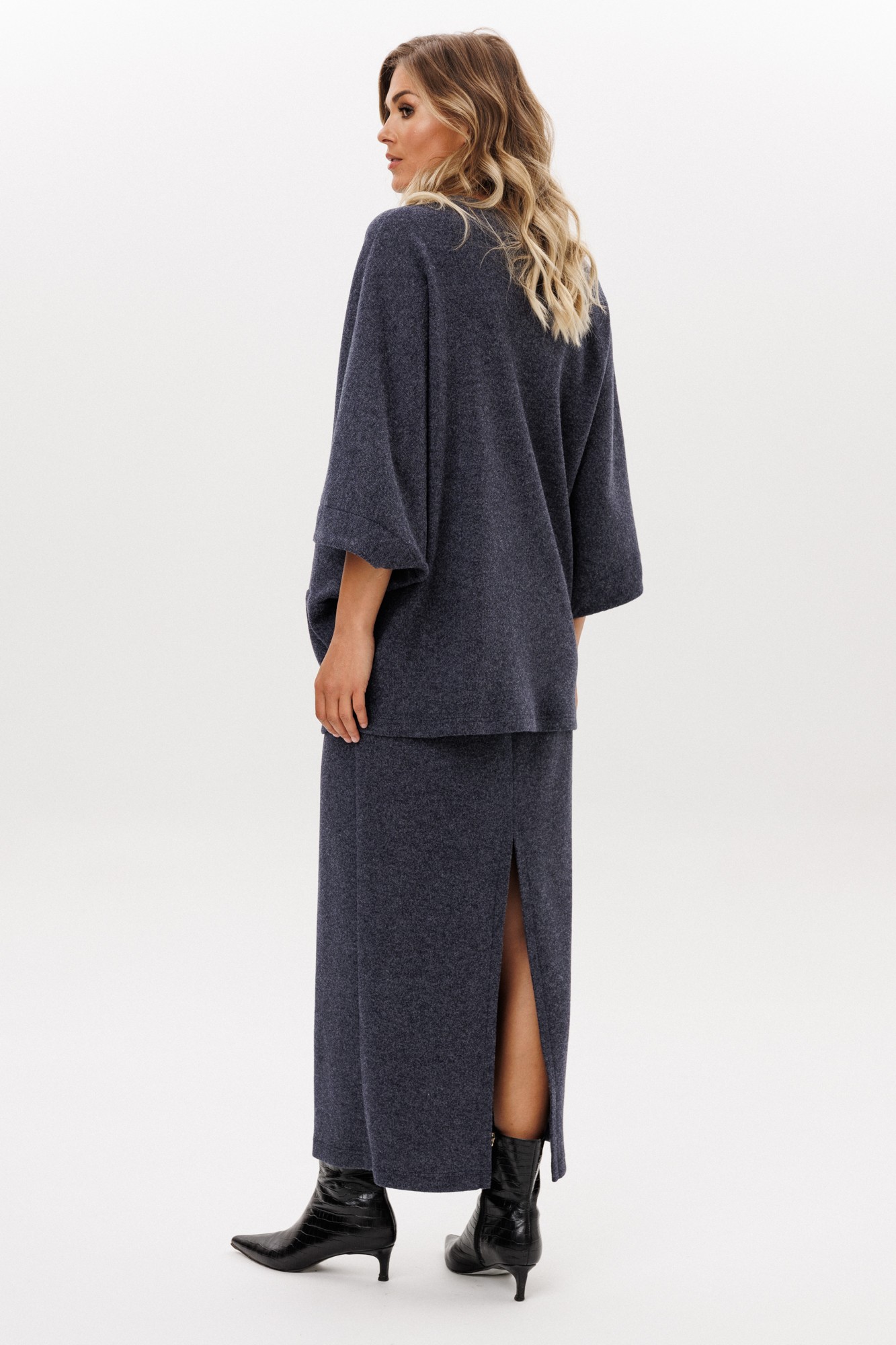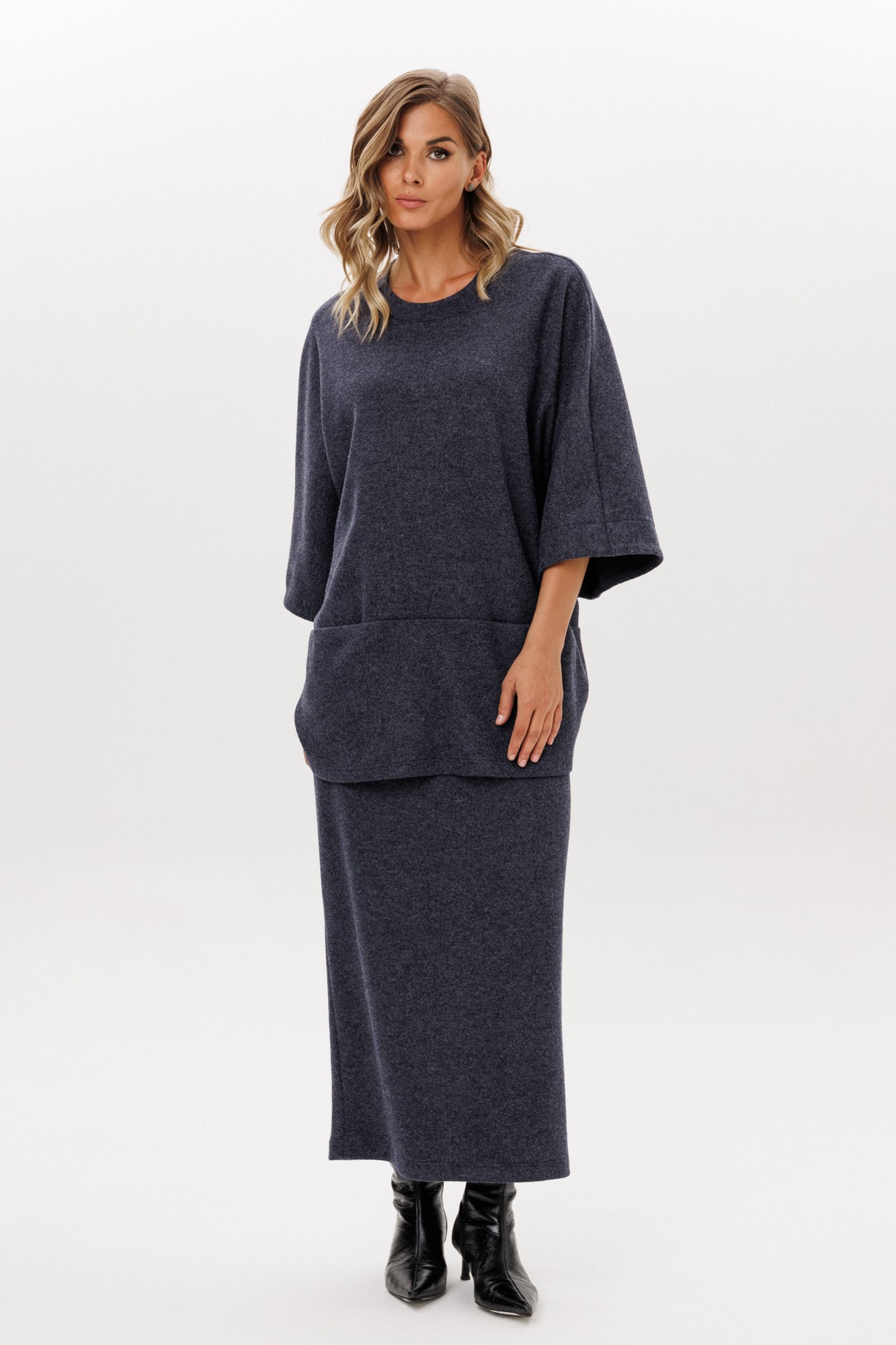 Юбка выполнена из трикотажного полотна. Юбка прямого силуэта, длиной миди, на цельнокроеном поясе с эластичной тесьмой. Сзади разрез в среднем шве.