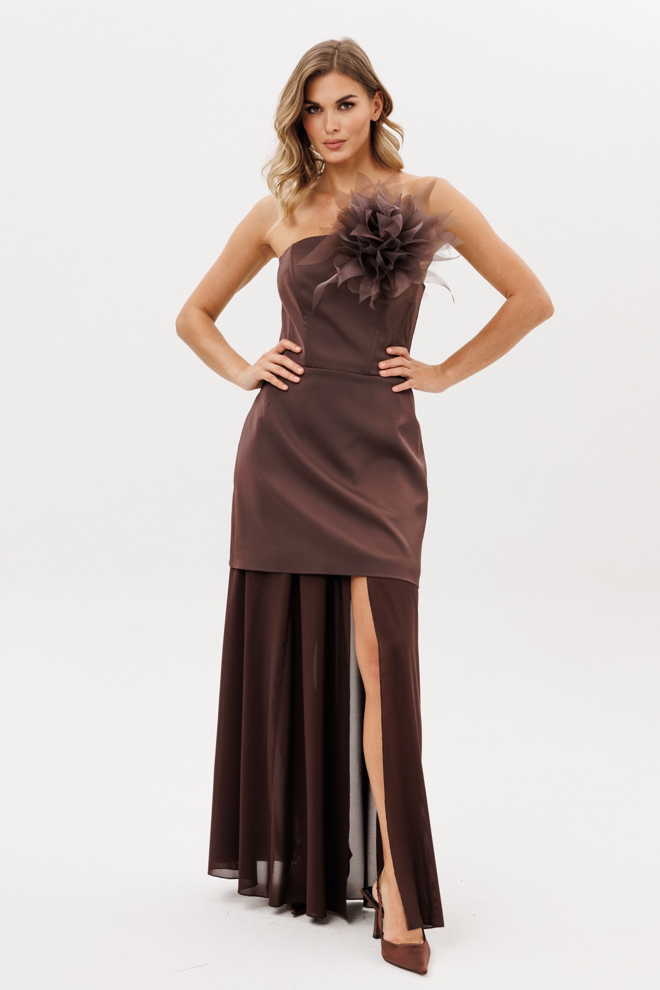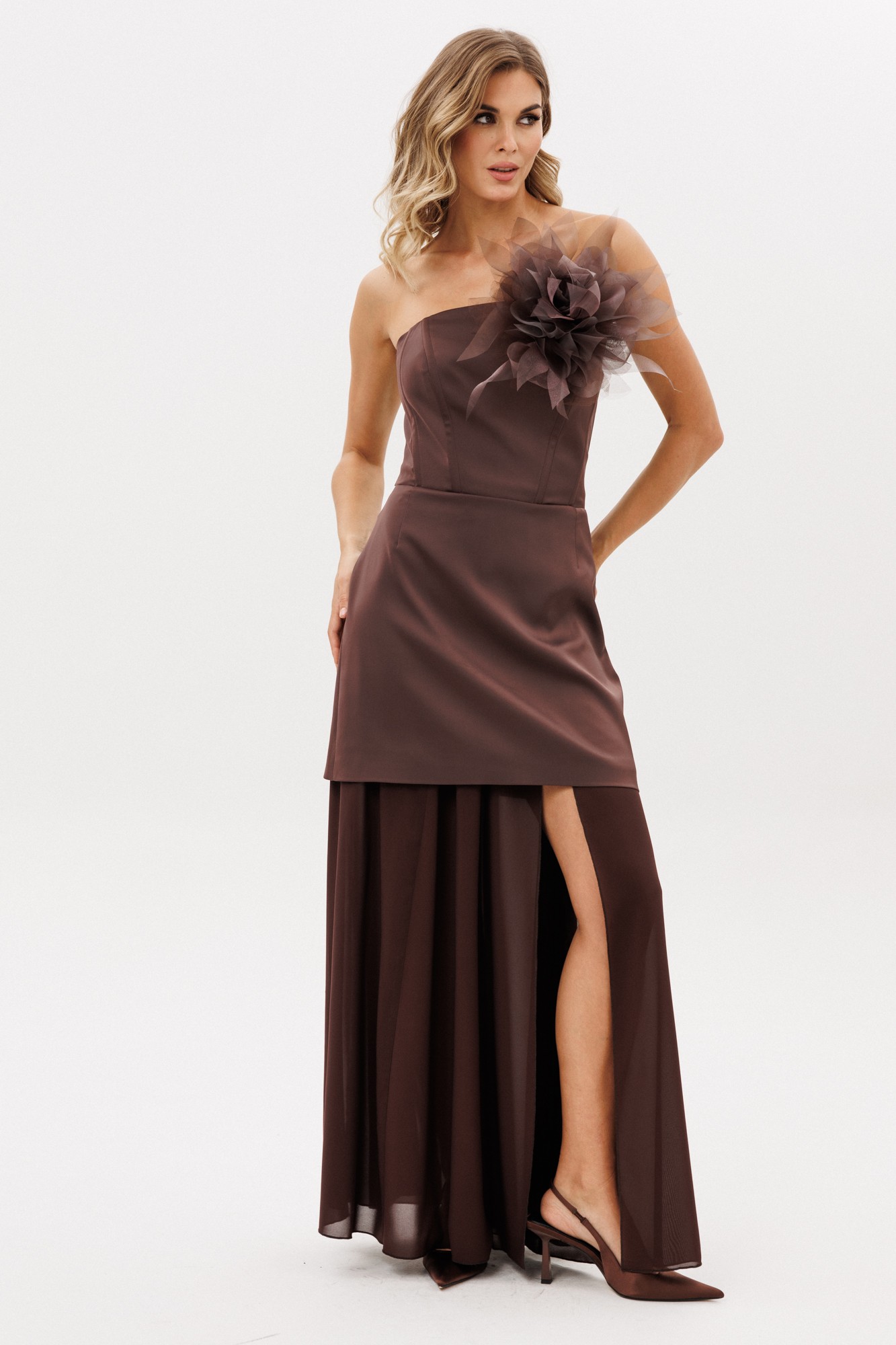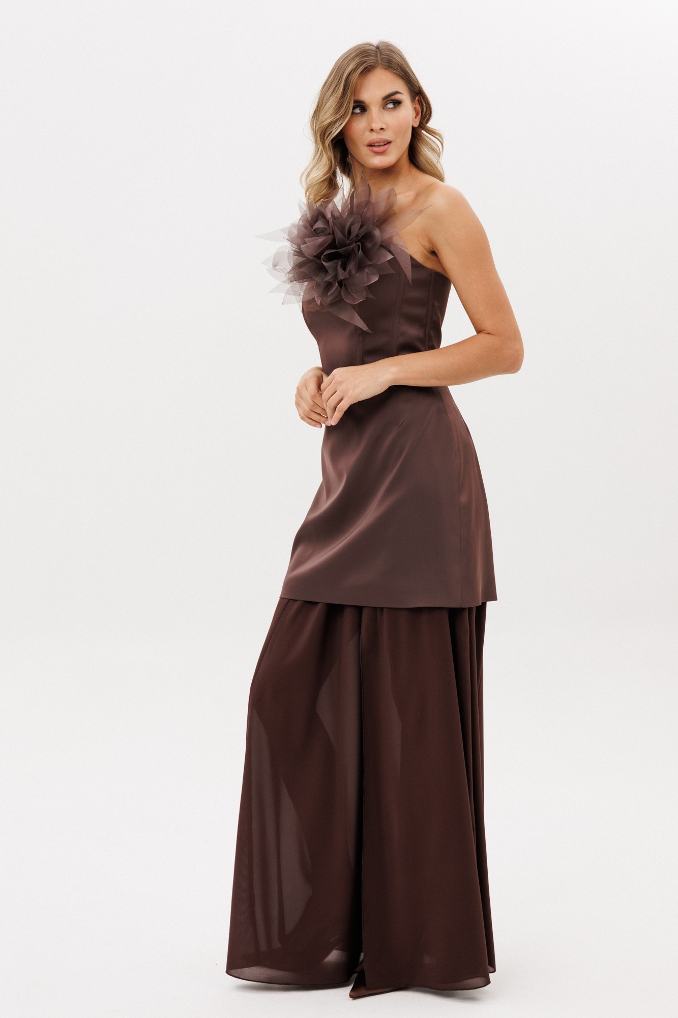 Юбка выполнена из шифона. Юбка А-образного силуэта, длиной в пол. Юбка на притачном поясе с эластичной тесьмой. Юбка состоит из 6 клиньев. Спереди слева разрез. Юбка без подкладки.