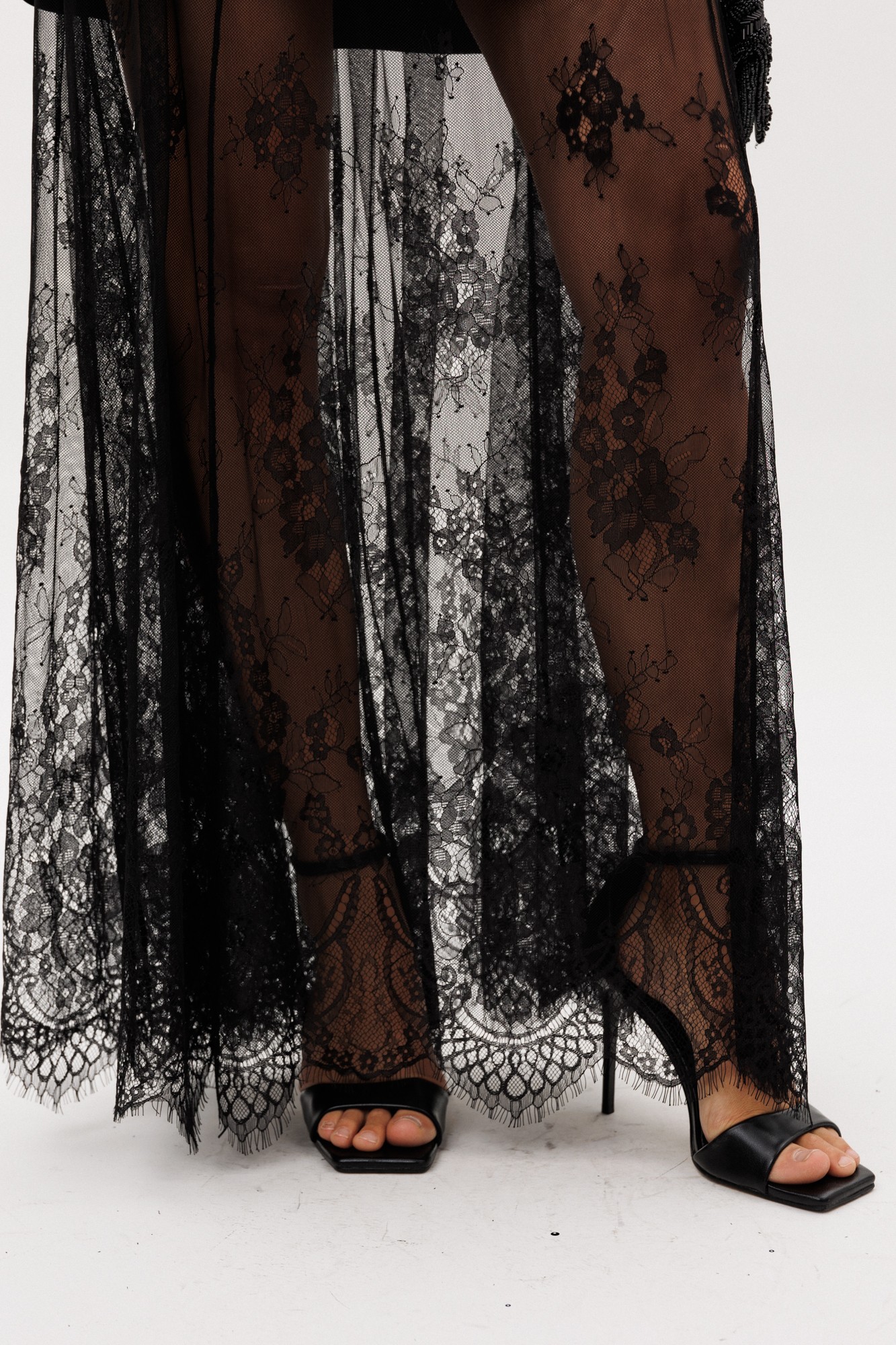 Юбка выполнена из гипюра. Юбка А-образного силуэта, длиной в пол. Юбка на притачном поясе с эластичной тесьмой. Юбка состоит из 6 клиньев. По низу юбки фестоны. Юбка без подкладки.