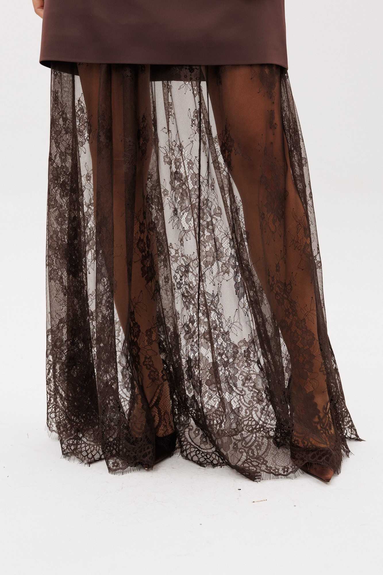Юбка выполнена из гипюра. Юбка А-образного силуэта, длиной в пол. Юбка на притачном поясе с эластичной тесьмой. Юбка состоит из 6 клиньев. По низу юбки фестоны. Юбка без подкладки.