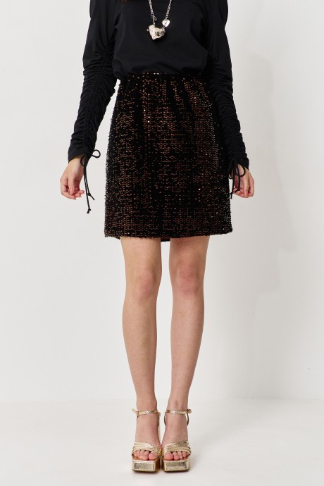 Юбка прямого силуэта в длине мини. Характеристики: выполнена из пайеточной ткани в коричневом цвете, пояс обработан эластичной тесьмой (резинкой).