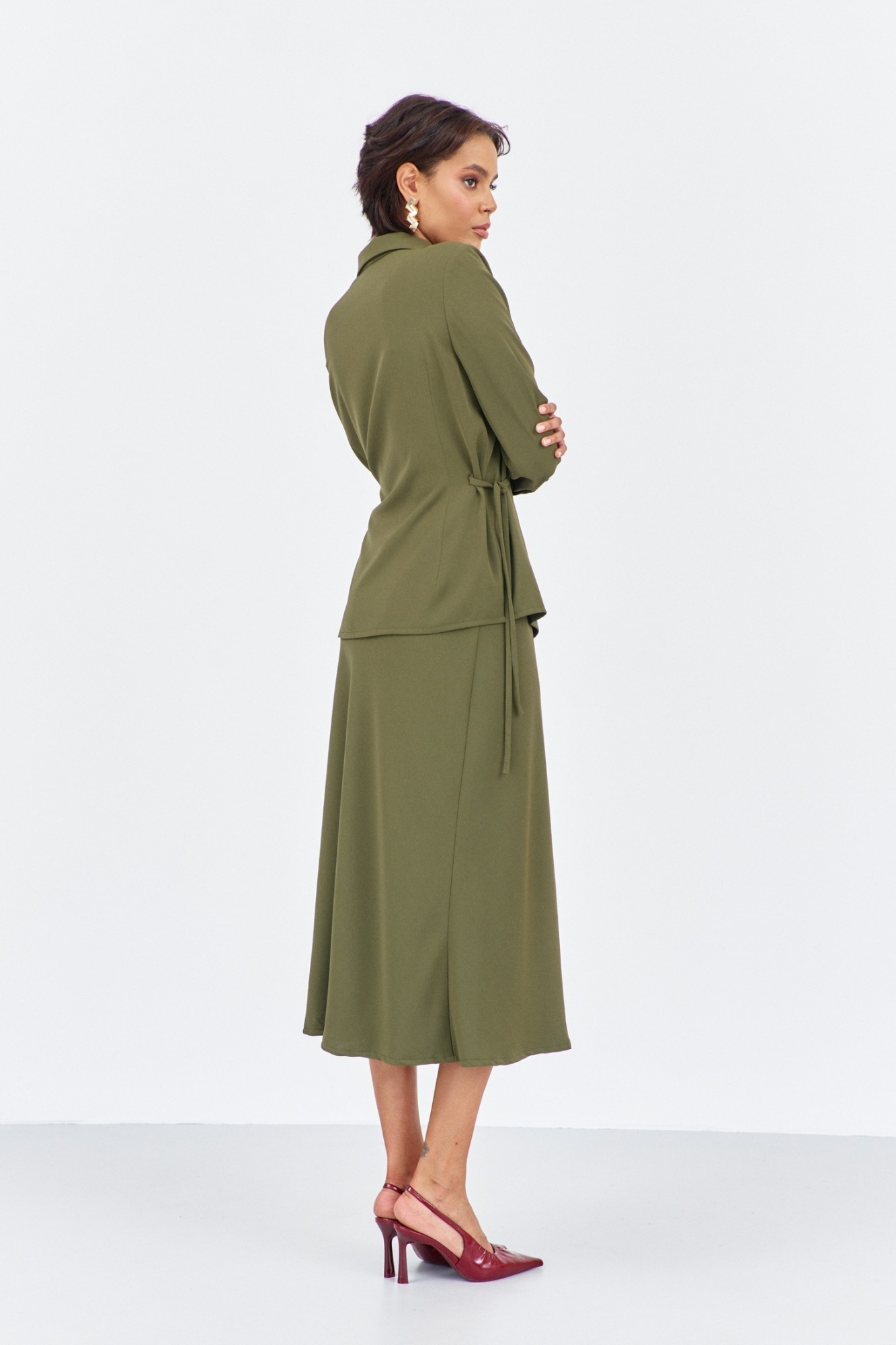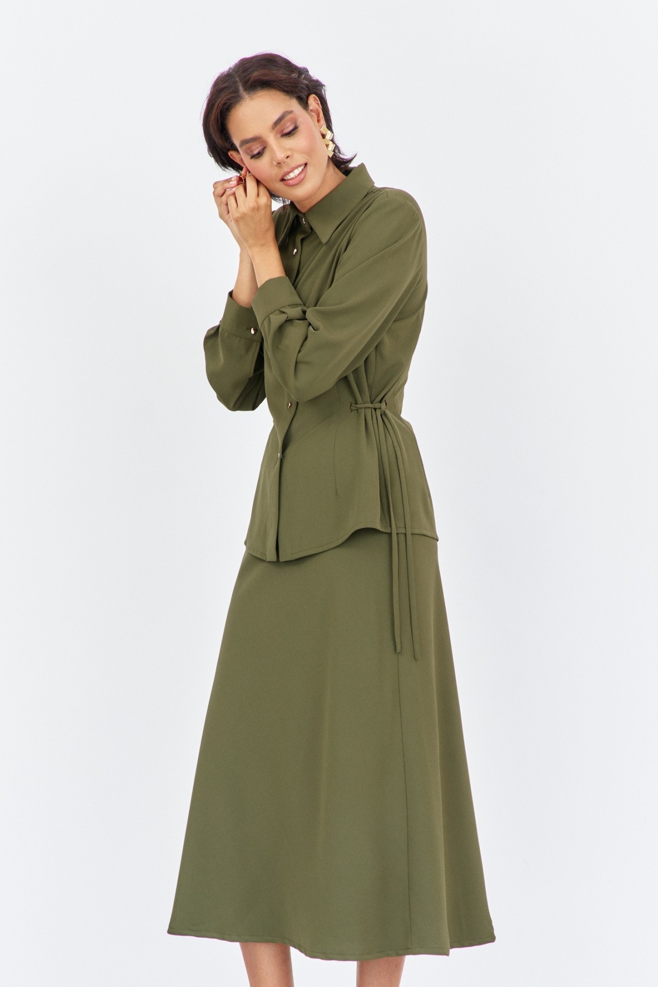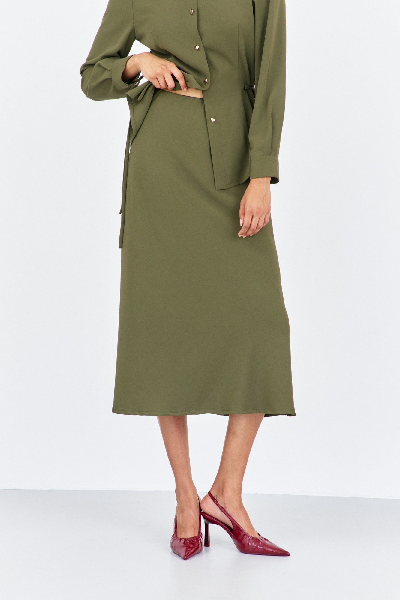 Юбка А-силуэта. Характеристики: выполнена из плательной ткани в цвете хаки, верх юбки обработан эластичной тесьмой.
