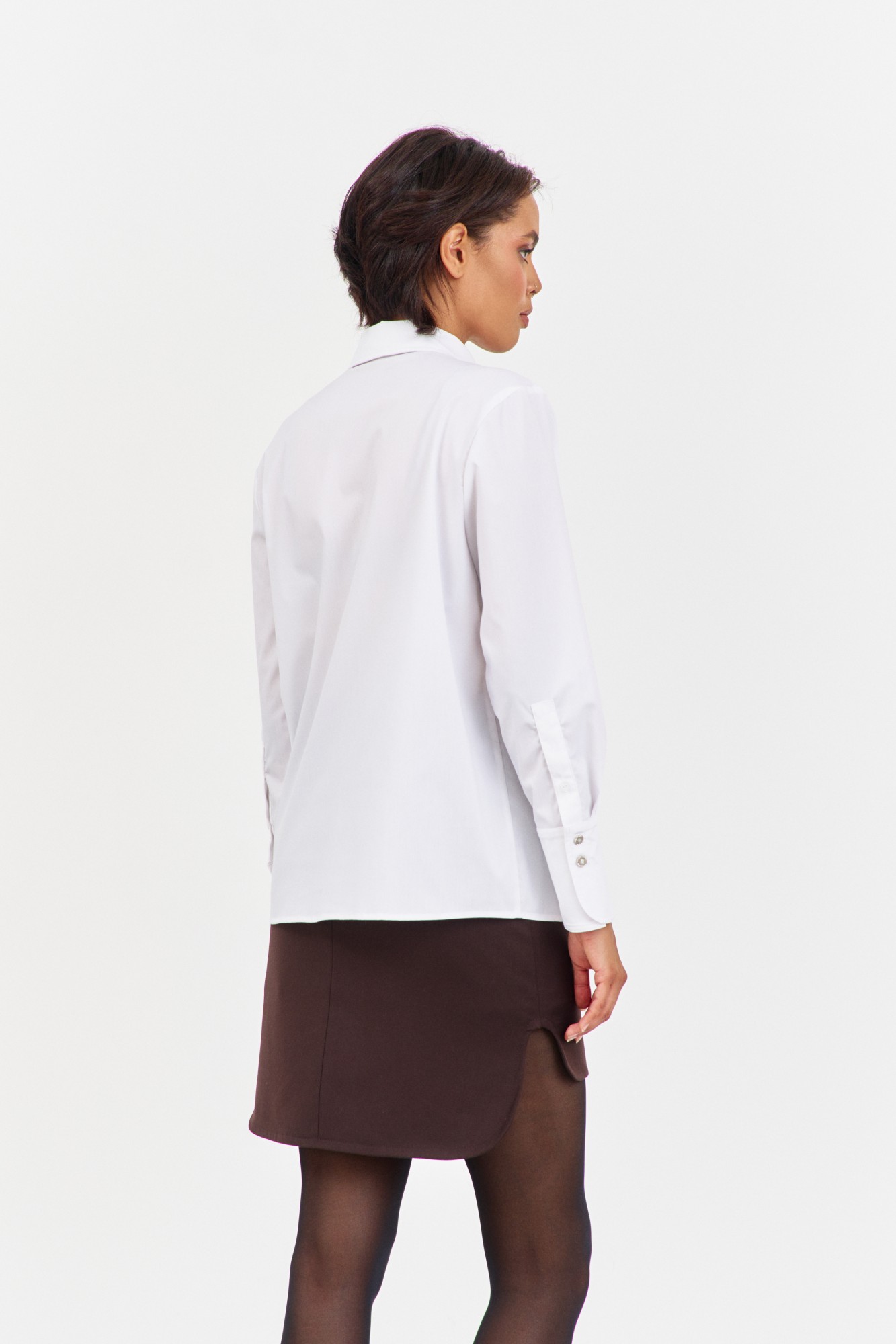 Юбка приталенного силуэта. Выполнена из плательной ткани в цвете шоколад. Низ юбки фигурный, по заднему полотнищу юбки застежка-молния.