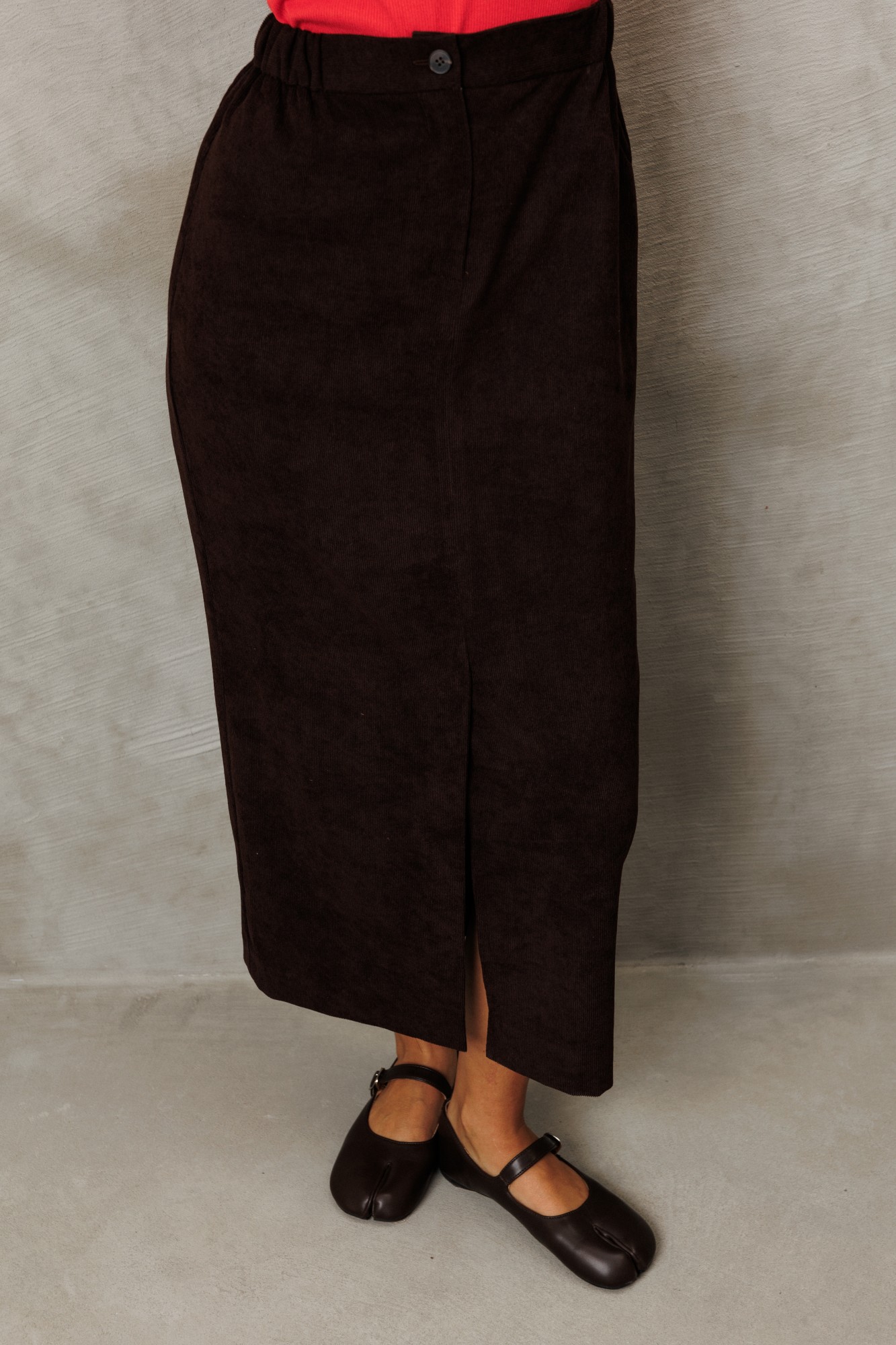 Юбка прямого силуэта выполненная из мягкой вельветовой ткани. Передняя честь юбки с вытачками, со средним швом и застежкой гульфиком на молнии и щпицей спереди. Задняя часть юбки с вытачками. Юбка на притачном поясе с застёжкой на петлю и пуговицу спереди и резинками по бокам. Юбка на подкладке.