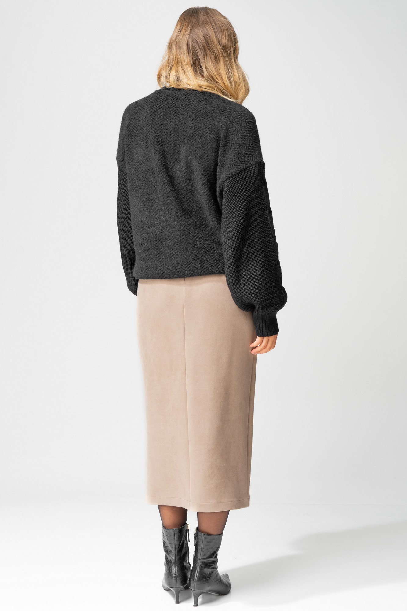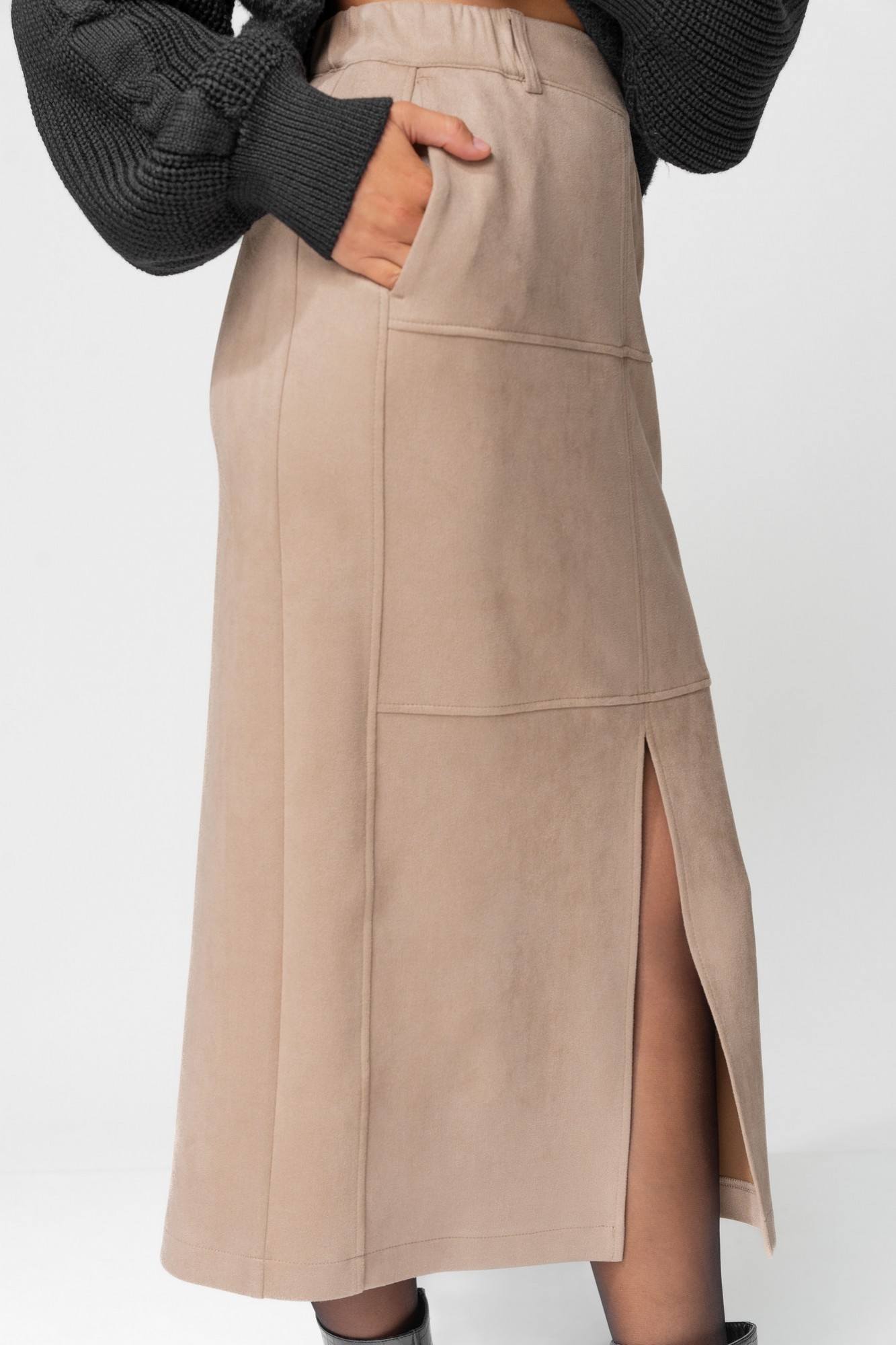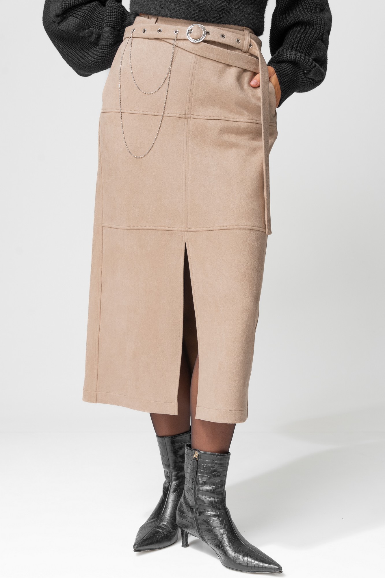 Юбка от LAIKONY из экозамши длиной до середины икр. Плотно облегает вверху и прямая к низу. Пояс притачной, в который частично вставлена эластичная тесьма, застежка на потайную тесьму-молнию в среднем шве заднего полотнища. Переднее полотнище юбки со средним швом который заканчивается разрезом, с 2-мя горизонтальными подрезами и с рельефными швами, в которых обработаны карманы. Заднее полотнище со средним швом, на каждой половинке обработаны вытачки. По поясу прикреплены 4 шлевки. Юбка выполнена из мягкой экозамши. Декор может отличаться от представленного на фотографии. Пояс в комплекте. Шикарная юбка для офиса и повседневного использования. Образ на фото с нашим джемпером L-093.