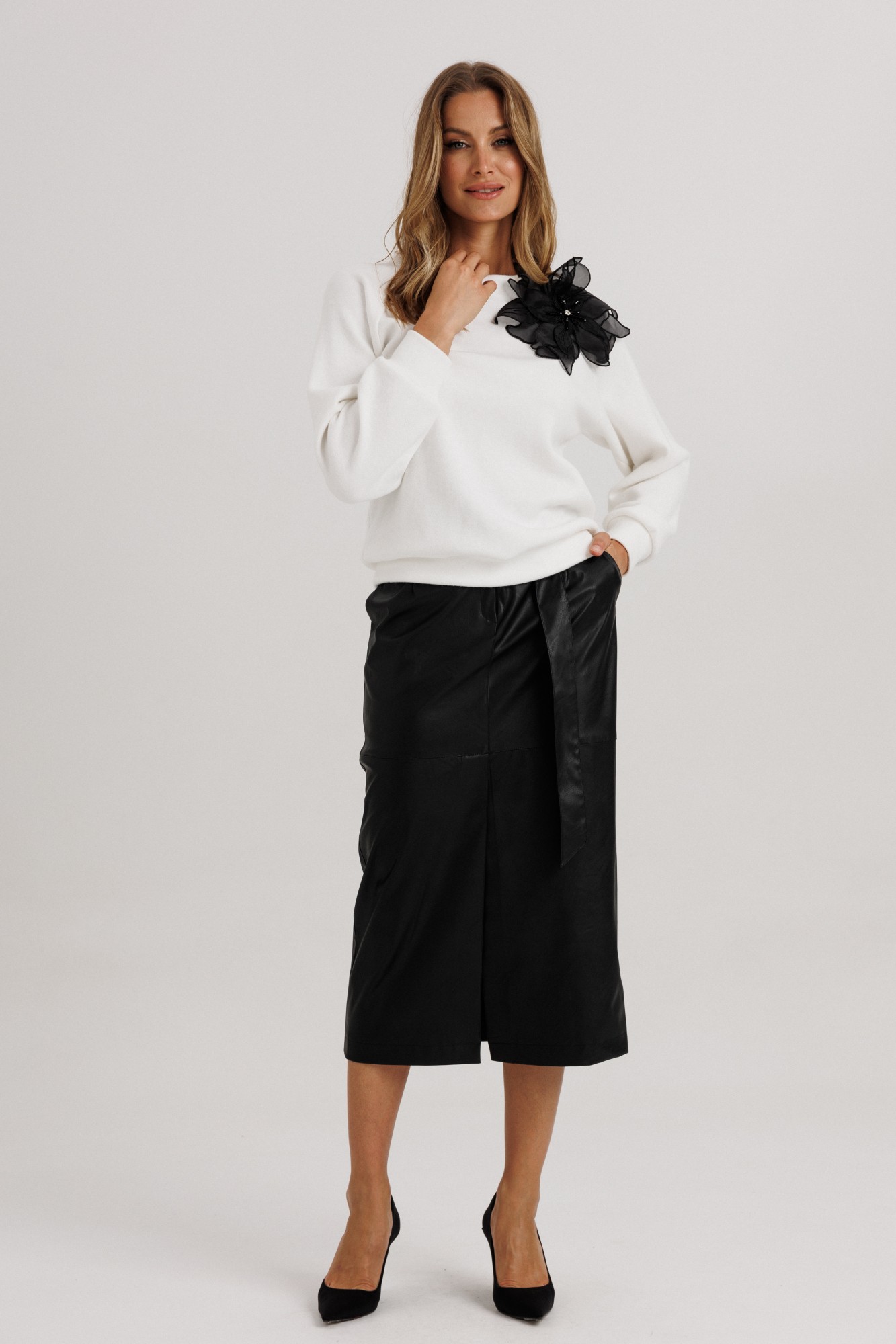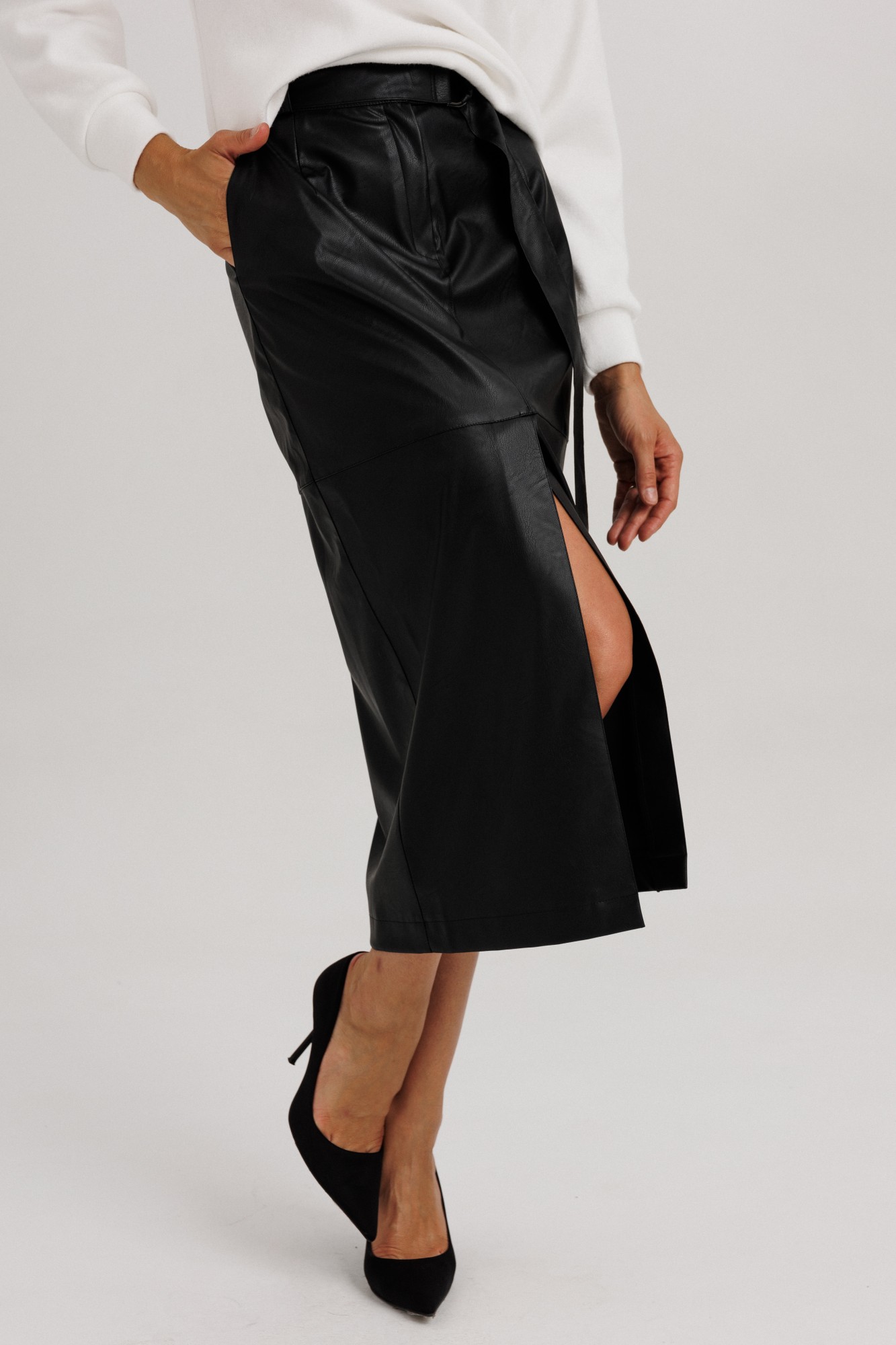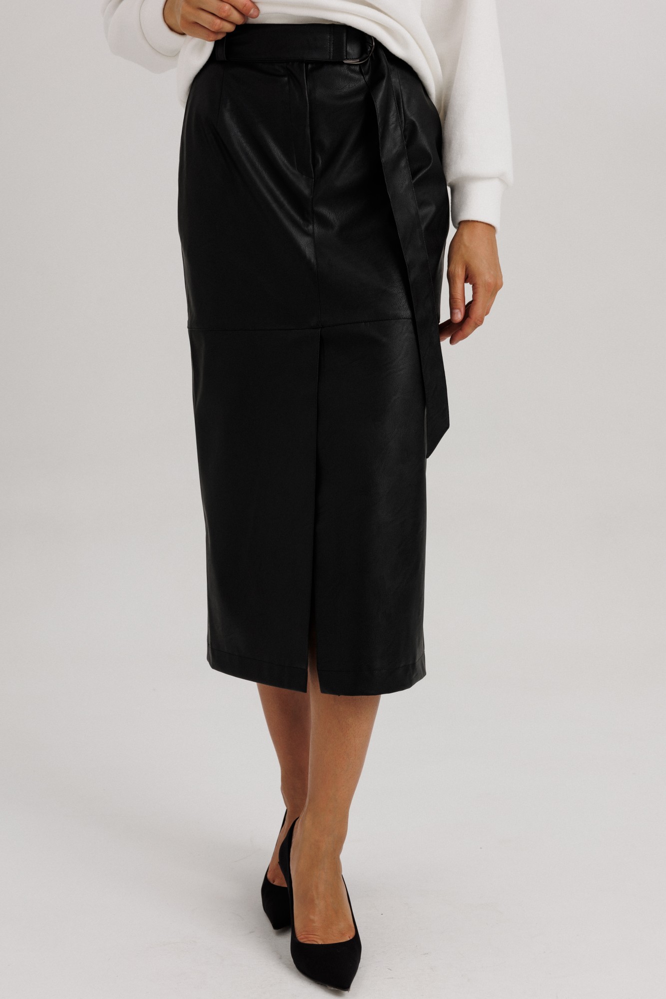 Юбка выполнена из эко-кожи прямого силуэта. Спереди: центральный разрез - шлица высотой 46 см. Также в центральном шве расположена застежка на молнию. Также юбка имеет горизонтальные линии с декоративной строчкой, высота кокетки 34 см. Линия талии обработана притачным поясом со шлевочными держателями. В боковых сегментах пояса вставлена эластичная тесьма для дополнительного регулирования объема талии. Высота пояса 4,5 см. Застежка в поясе на две функциональные петли/пуговицы. На линии талии расположены таллиевые вытачки. В боковых швах: наклонные карманы. Дополнительно в шлевочные отверстия вставлен текстильный пояс с пряжкой. (фурнитура может отличаться от представленной на рекламном фотоматериале). Особые рекомендации: рекомендуется холодная деликатная ручная стирка, без использования отбеливающих СМС, без интенсивного трения. Сушка в вертикальном положении. ВТО с минимальным паром.