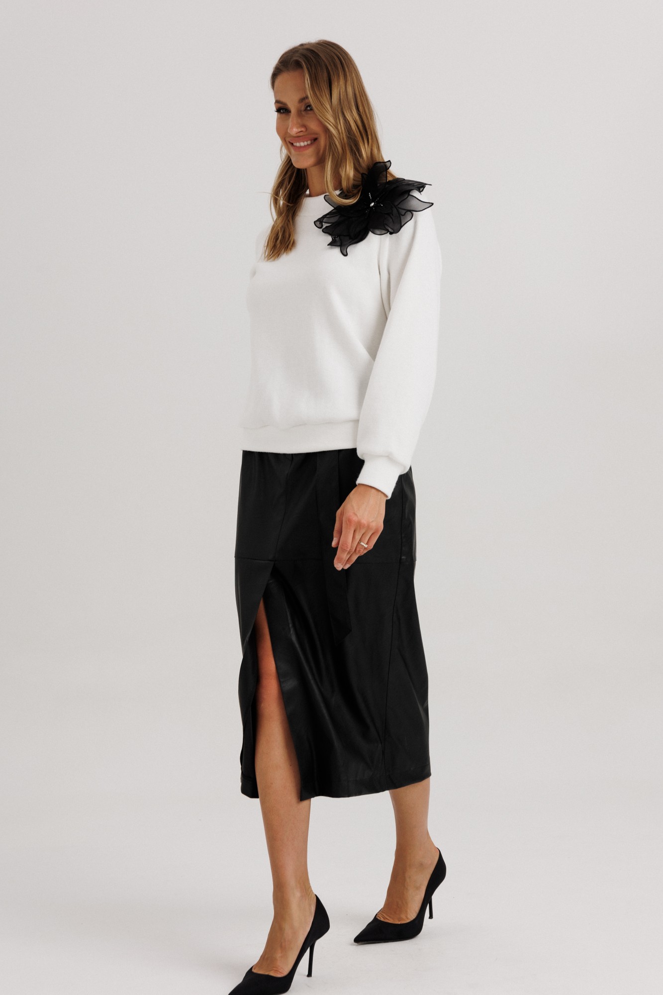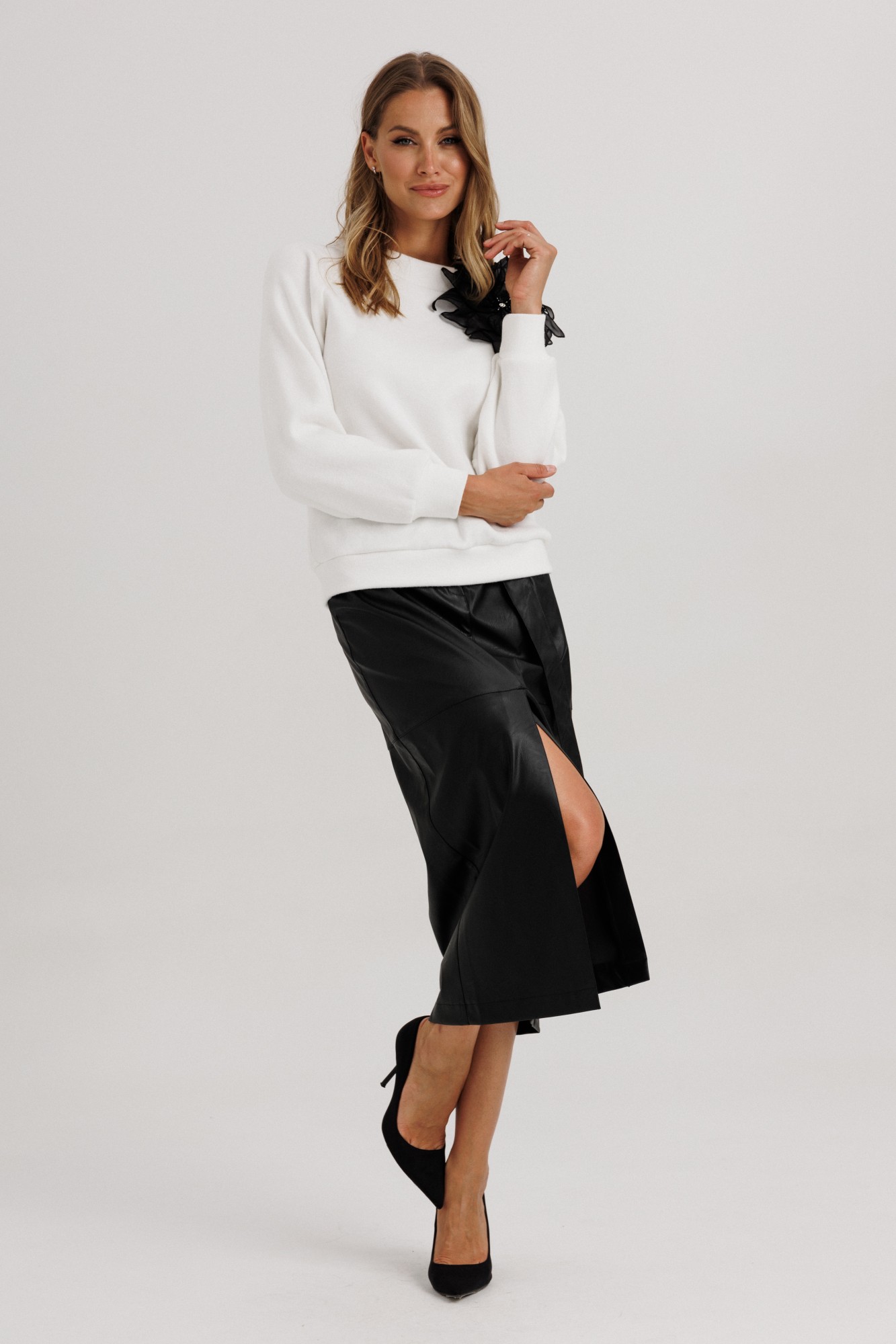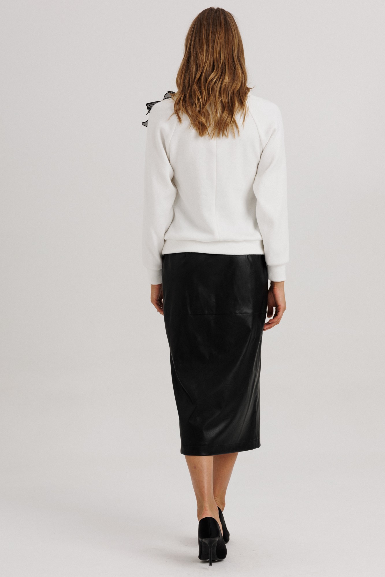 Юбка выполнена из эко-кожи прямого силуэта. Спереди: центральный разрез - шлица высотой 46 см. Также в центральном шве расположена застежка на молнию. Также юбка имеет горизонтальные линии с декоративной строчкой, высота кокетки 34 см. Линия талии обработана притачным поясом со шлевочными держателями. В боковых сегментах пояса вставлена эластичная тесьма для дополнительного регулирования объема талии. Высота пояса 4,5 см. Застежка в поясе на две функциональные петли/пуговицы. На линии талии расположены таллиевые вытачки. В боковых швах: наклонные карманы. Дополнительно в шлевочные отверстия вставлен текстильный пояс с пряжкой. (фурнитура может отличаться от представленной на рекламном фотоматериале). Особые рекомендации: рекомендуется холодная деликатная ручная стирка, без использования отбеливающих СМС, без интенсивного трения. Сушка в вертикальном положении. ВТО с минимальным паром.