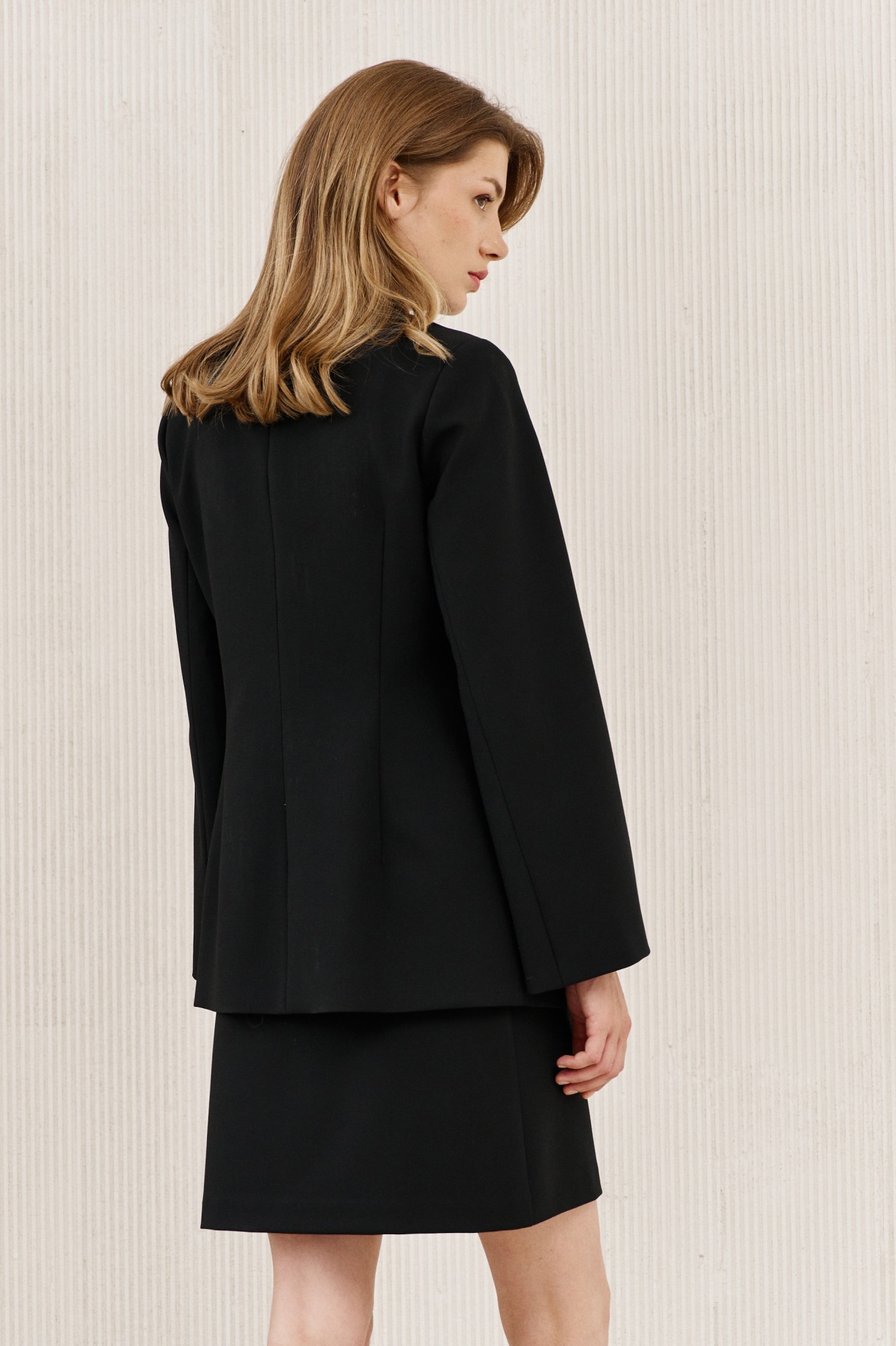Юбка короткая на подкладке немного расширенная к низу. По переду асимметричная кокетка с отлетным декоративным элементом фиксируемым на брошь. Застежка на потайную тесьму молнию в среднем шве заднего полотнища.