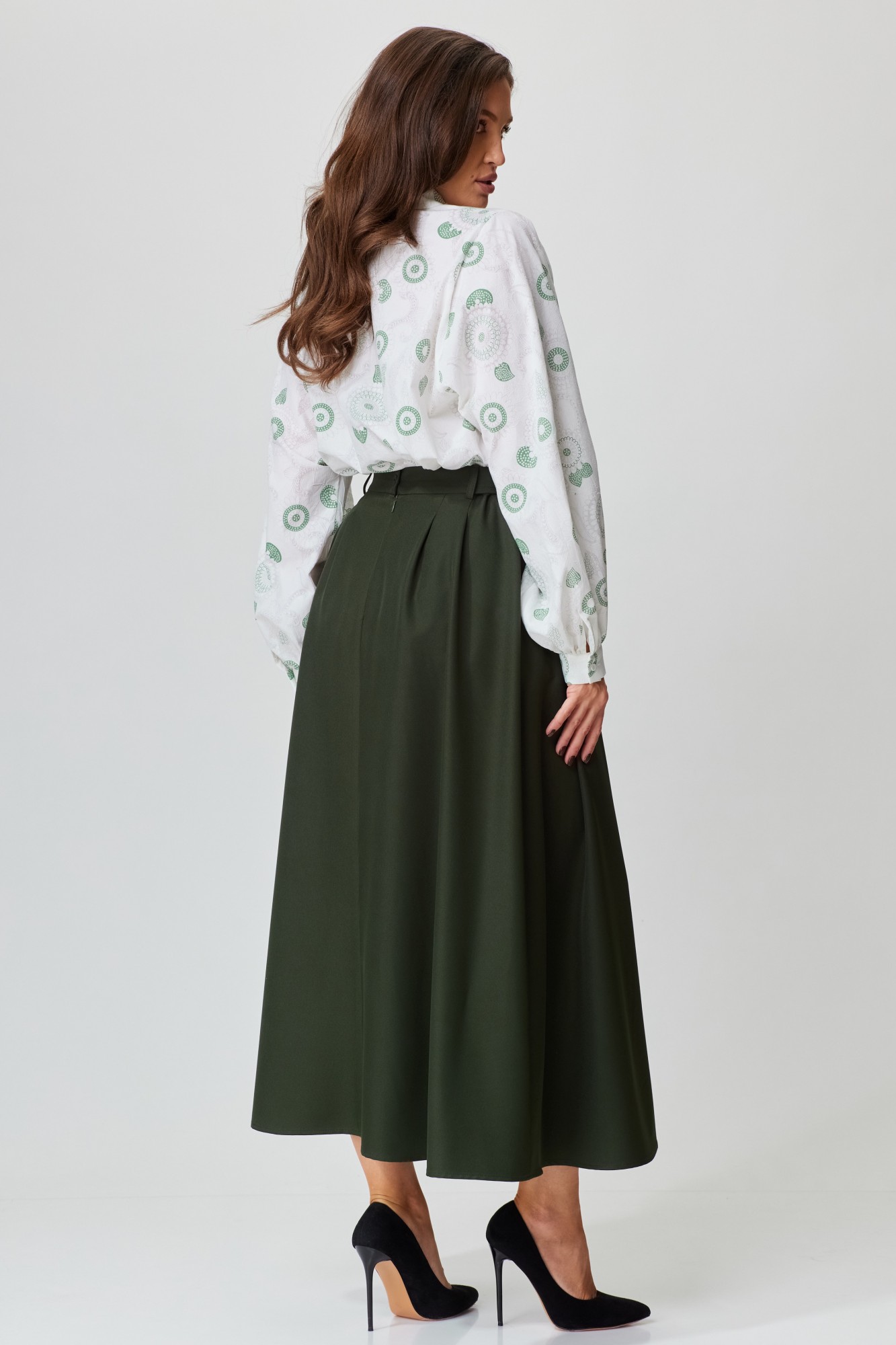 Юбка женская длиной макси, выполнена из костюмной ткани. Перед со складками и боковыми карманами. Спинка со швом посередине с застёжкой на тесьму-молнию и складками. Юбка на притачном поясе частично с эластичной тесьмой, с декоративным пояском с пряжкой спереди