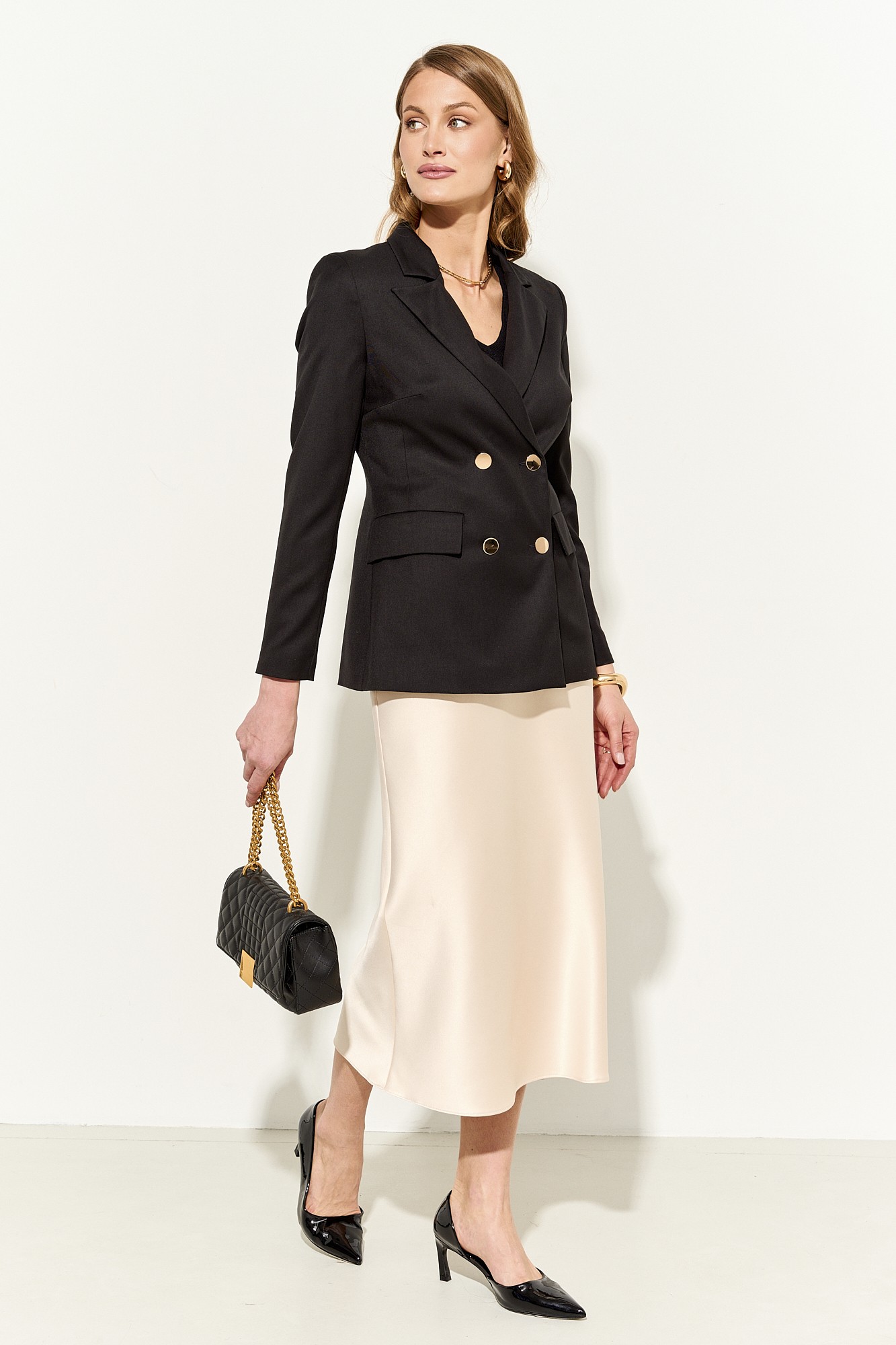 Юбка миди прилегающего силуэта из струящейся сатиновой ткани с добавлением шелка; пояс притачной, в боковые швы которого вставлена резинка для лучшего прилегания; застежка на молнию , петлю и пуговицу.