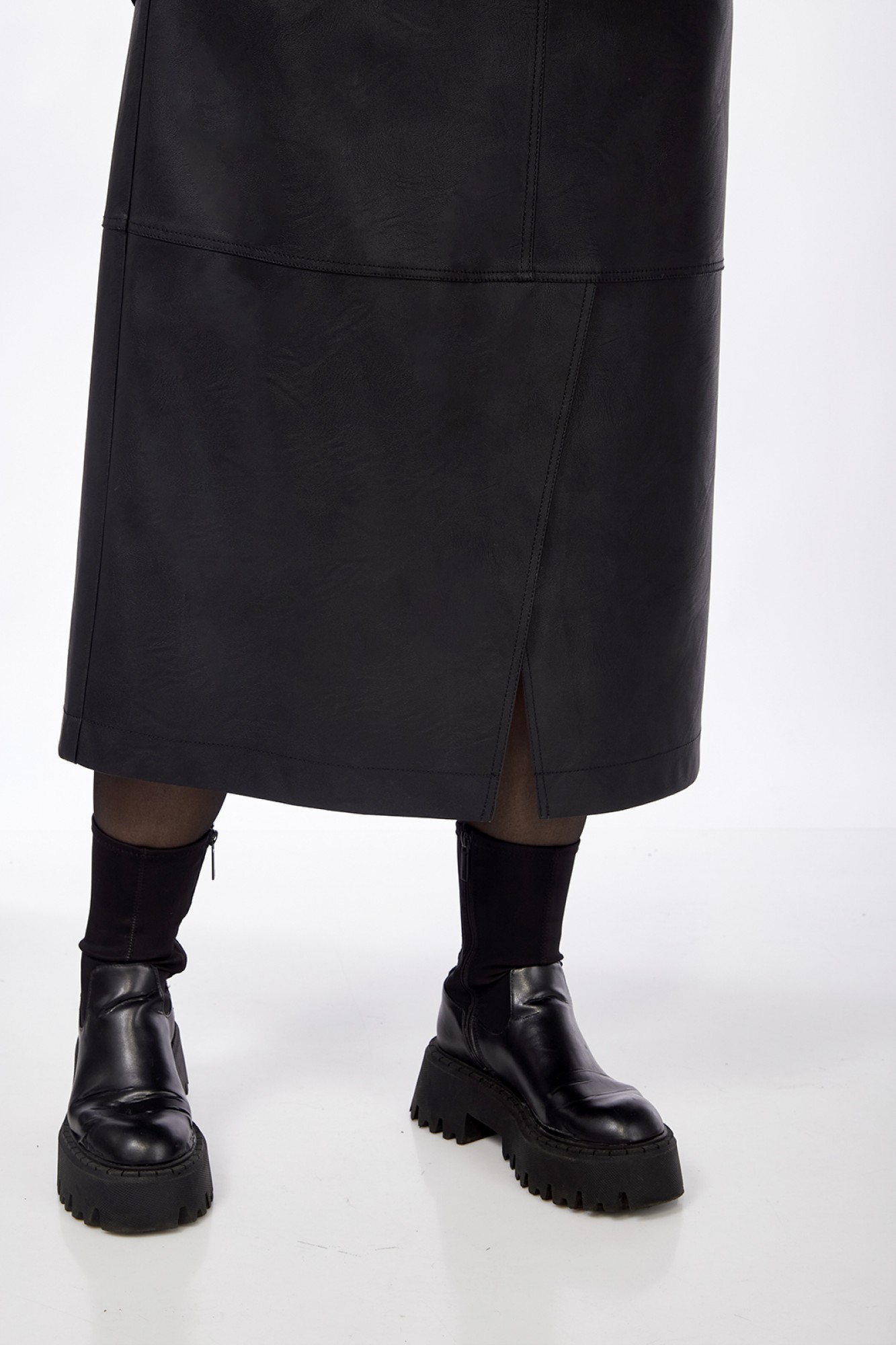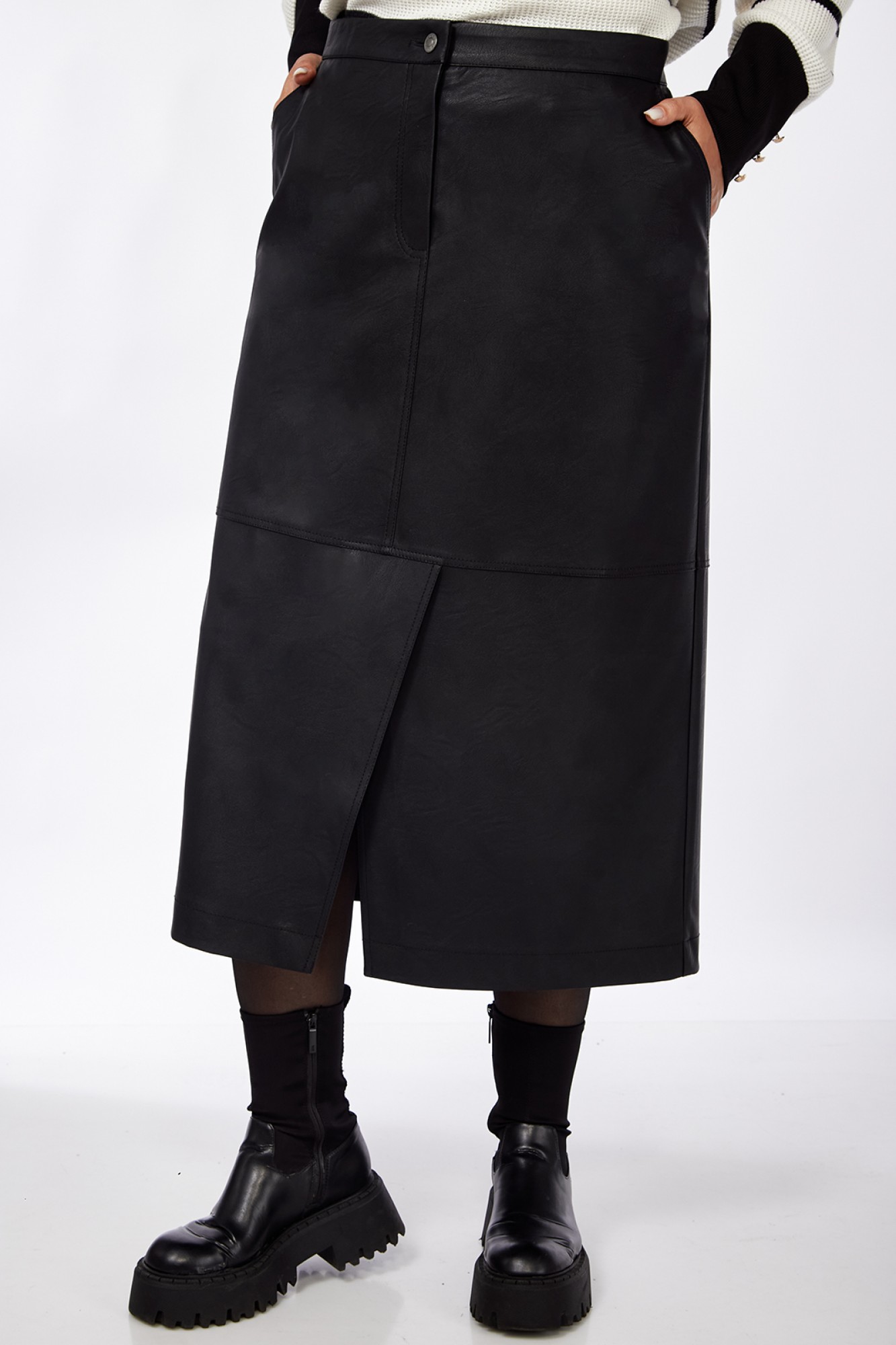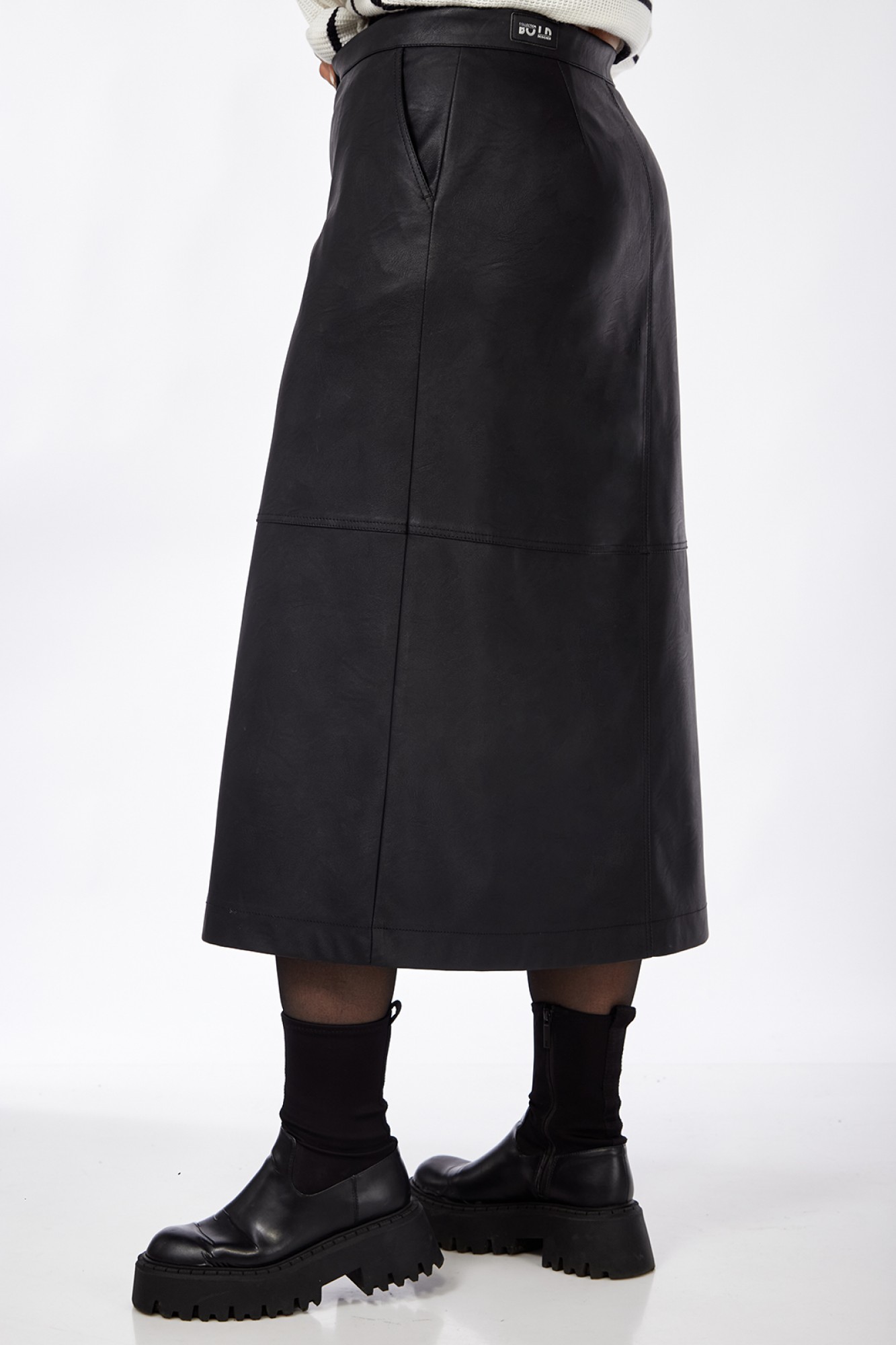 Юбка женская А — силуэта изготовлена из эко — кожи. Передние и задние детали юбки разрезные, отстрочены отделочной ниткой. На передних деталях обработаны косые карманы. Юбка на поясе, застежка на молнию петлю и пуговицу. Юбка на подкладке, декоративная нашивка настрочена на поясе.