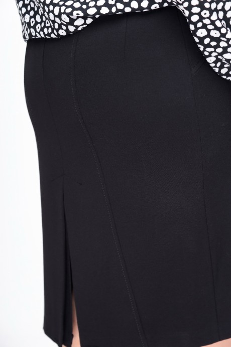 Юбка полуприлегающего силуэта на подкладке. По спинке юбки обработаны вытачки. Застежка на потайную молнию в среднем шве заднего полотнища юбки. Верх юбки обработан обтачкой. В среднем шве разрез. Длина 60 см (±1 см).