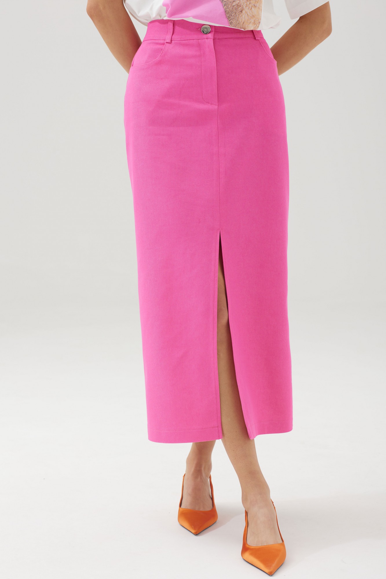 Юбка прямого силуэта длиной миди из джинсовой ткани. По верху юбки притачной пояс с застежкой на петлю и пуговицу и шлевками для ремня. На спинке в пояс вставлена эластичная тесьма (резинка).По переду обработаны карманы, застежка молния в среднем шве, по низу длинный разрез. На заднем полотнище юбки вытачки и декоративные карманы. Обращаем ваше внимание, что фурнитура может незначительно отличаться от фото.