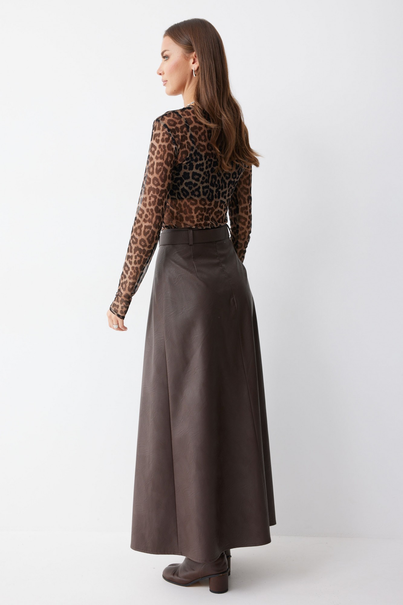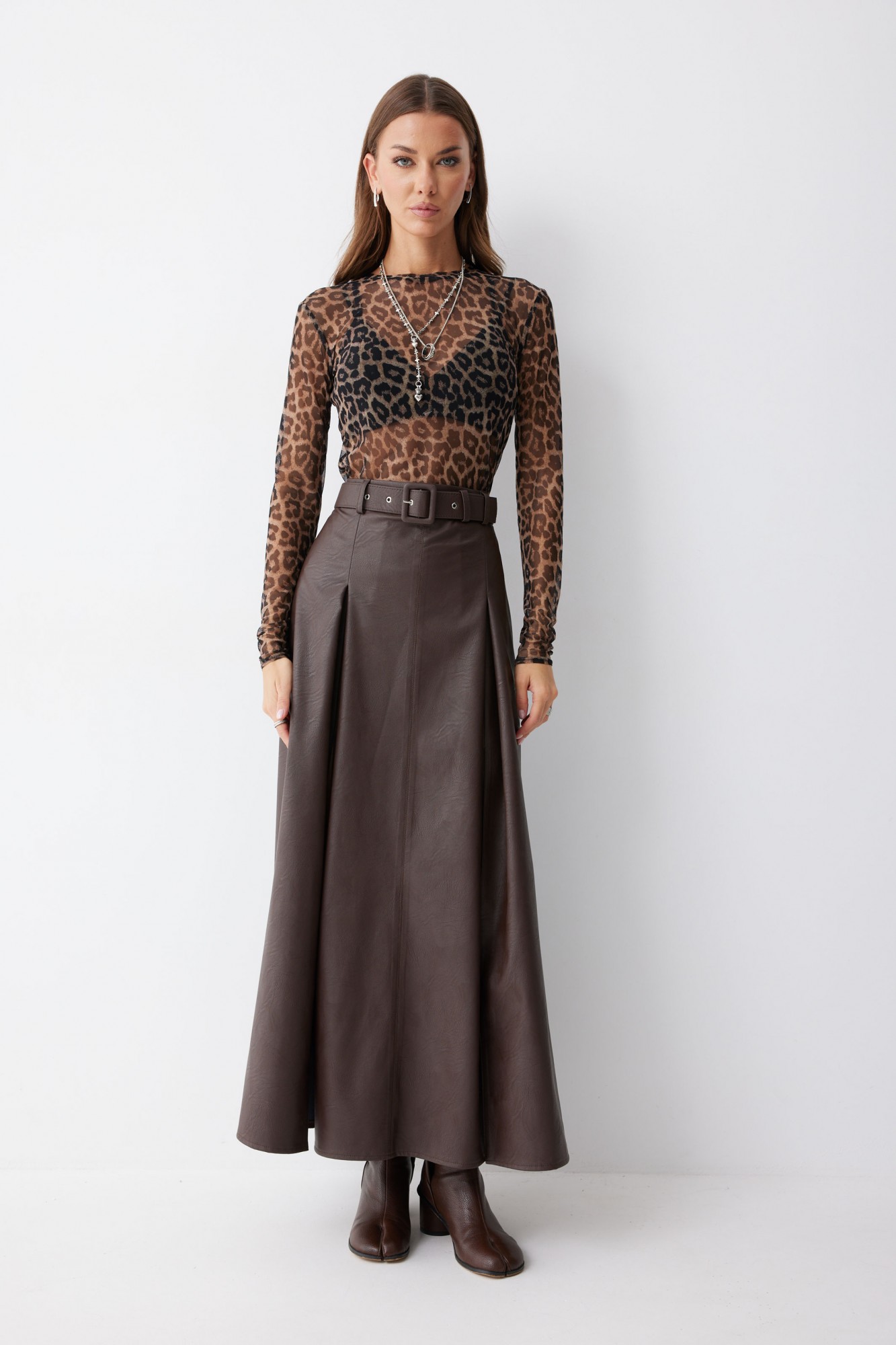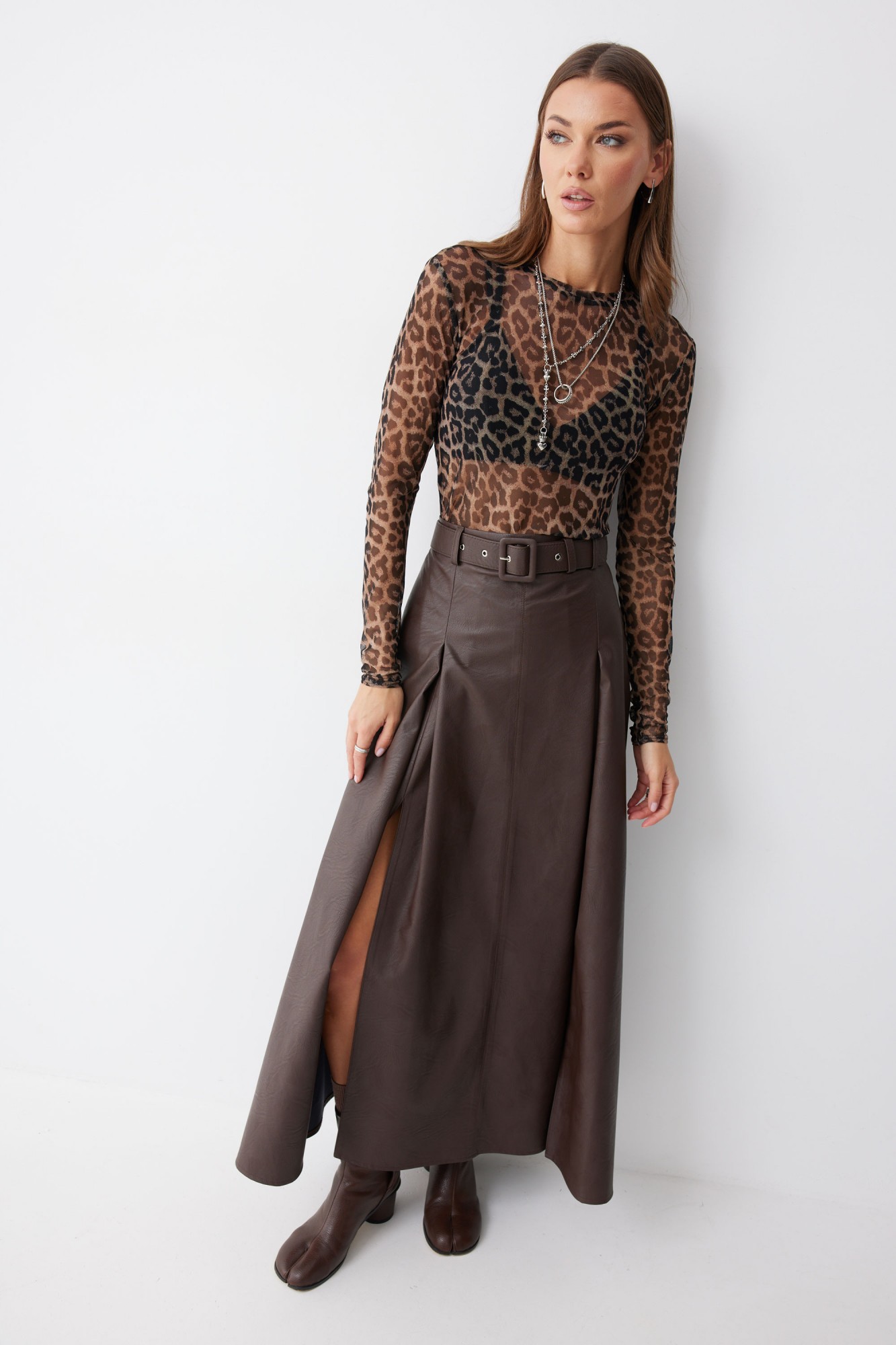Стильная юбка А-силуэта из экокожи длины макси. По верху юбки притачной пояс со шлевками для ремня. На передних половинках расположены вытачки со встречной складкой и разрезами по низу. На задних половинках расположены таллиевые вытачки. На спинке по центру потайная молния. В комплект входит ремень.