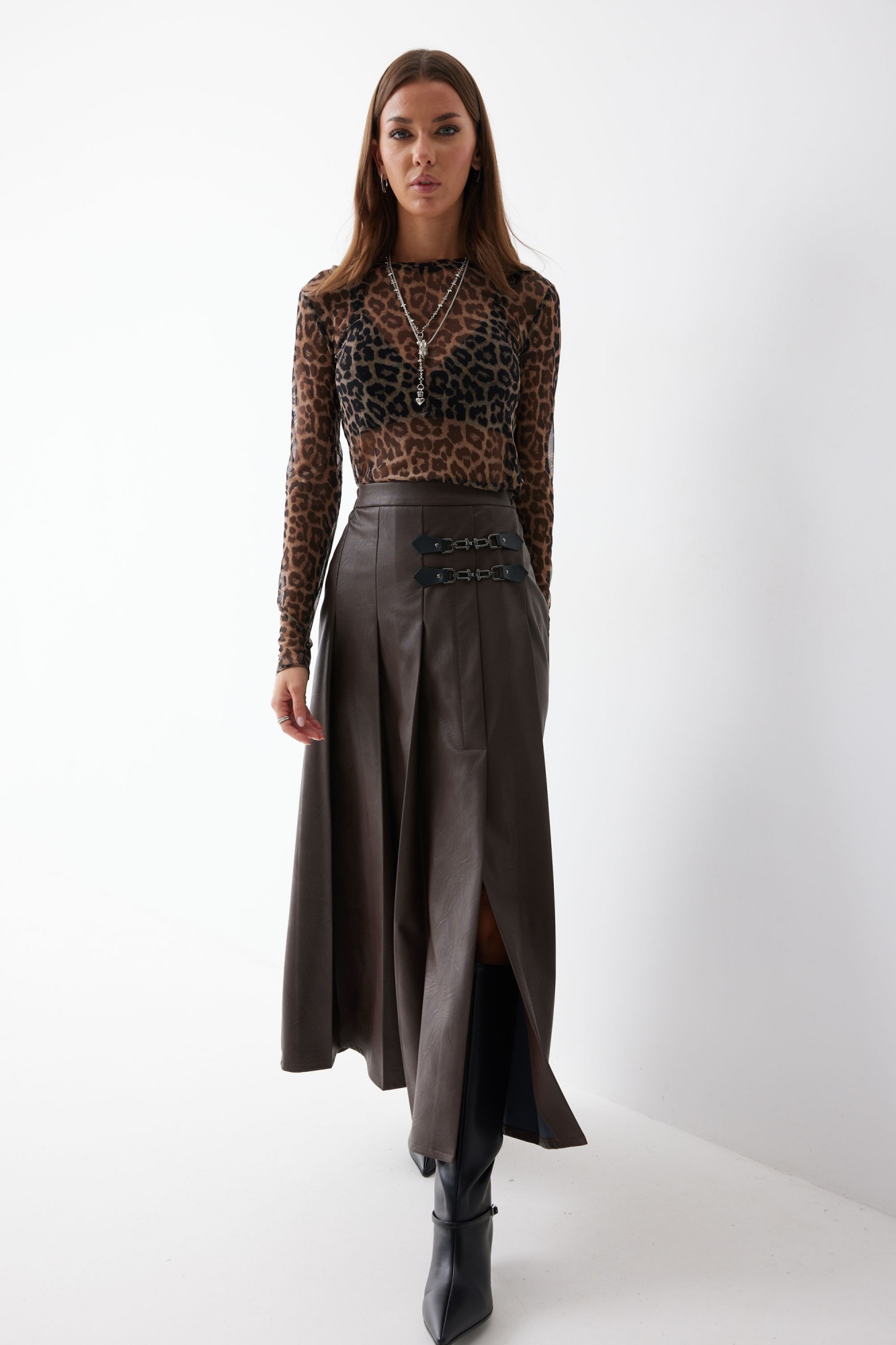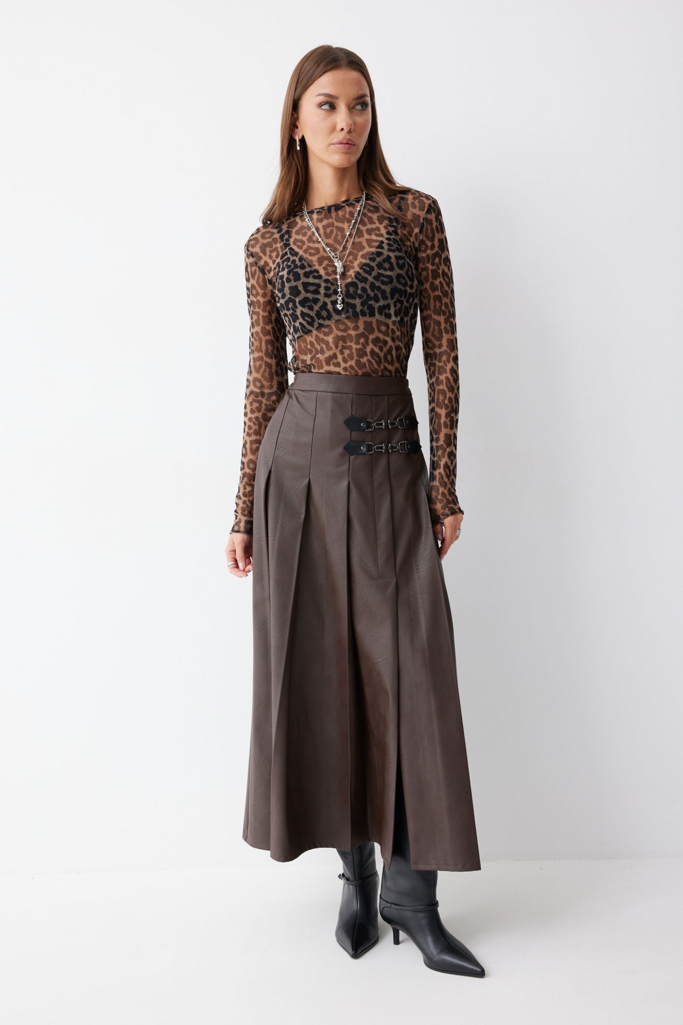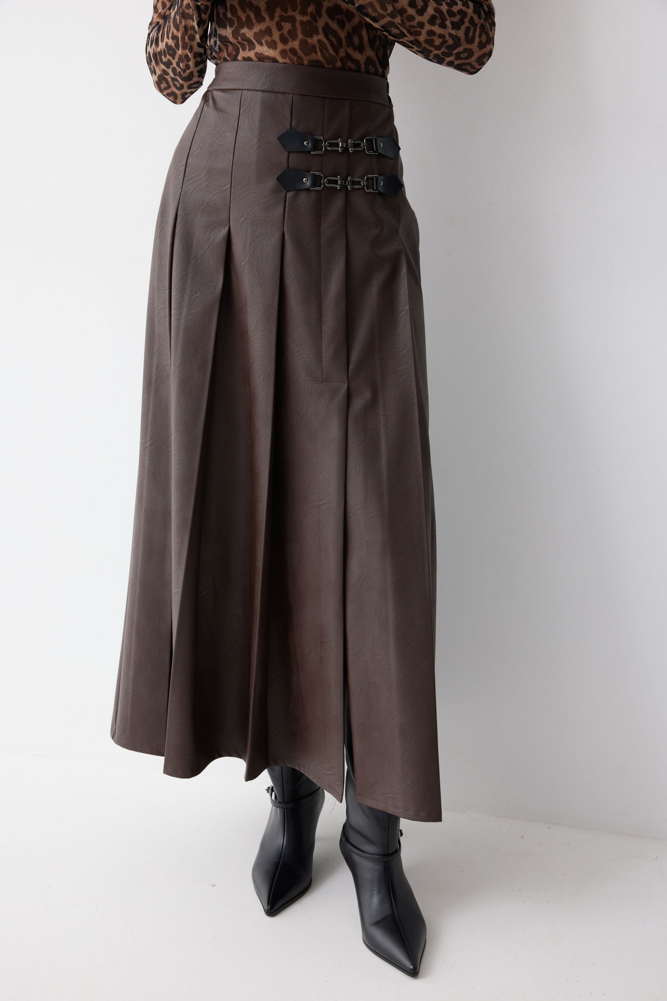 Юбка А-силуэта из экокожи на хлопковой основе длины макси. По верху юбки притачной пояс со шлевками для ремня. Переднее полотнище юбки со складками и шпицей и декоративной фурнитурой. На задних половинках расположены таллиевое вытачки. На спинке в центральном шве потайная молния. По бокам в поясе вставлена резинка от складки до вытачки.