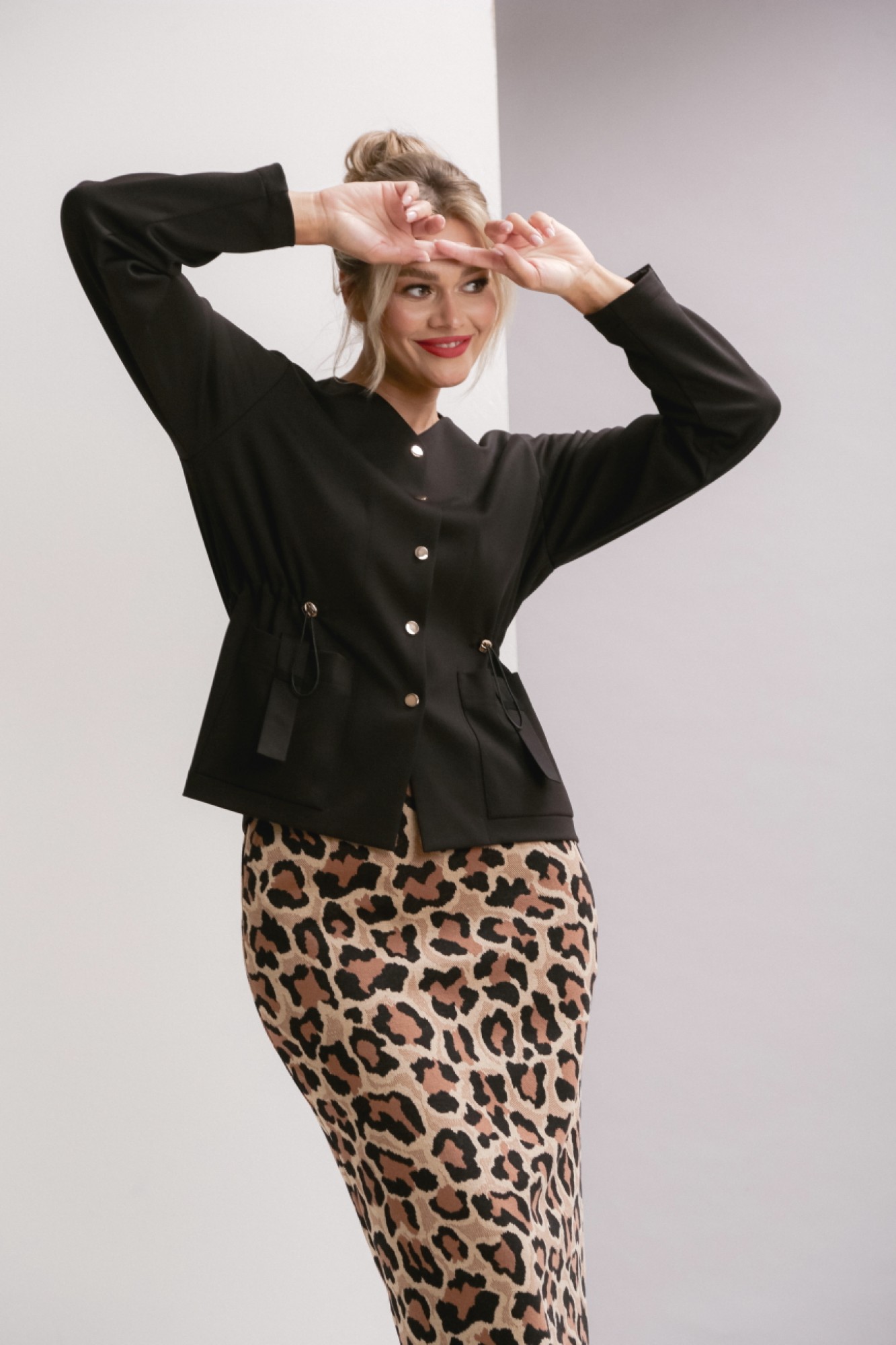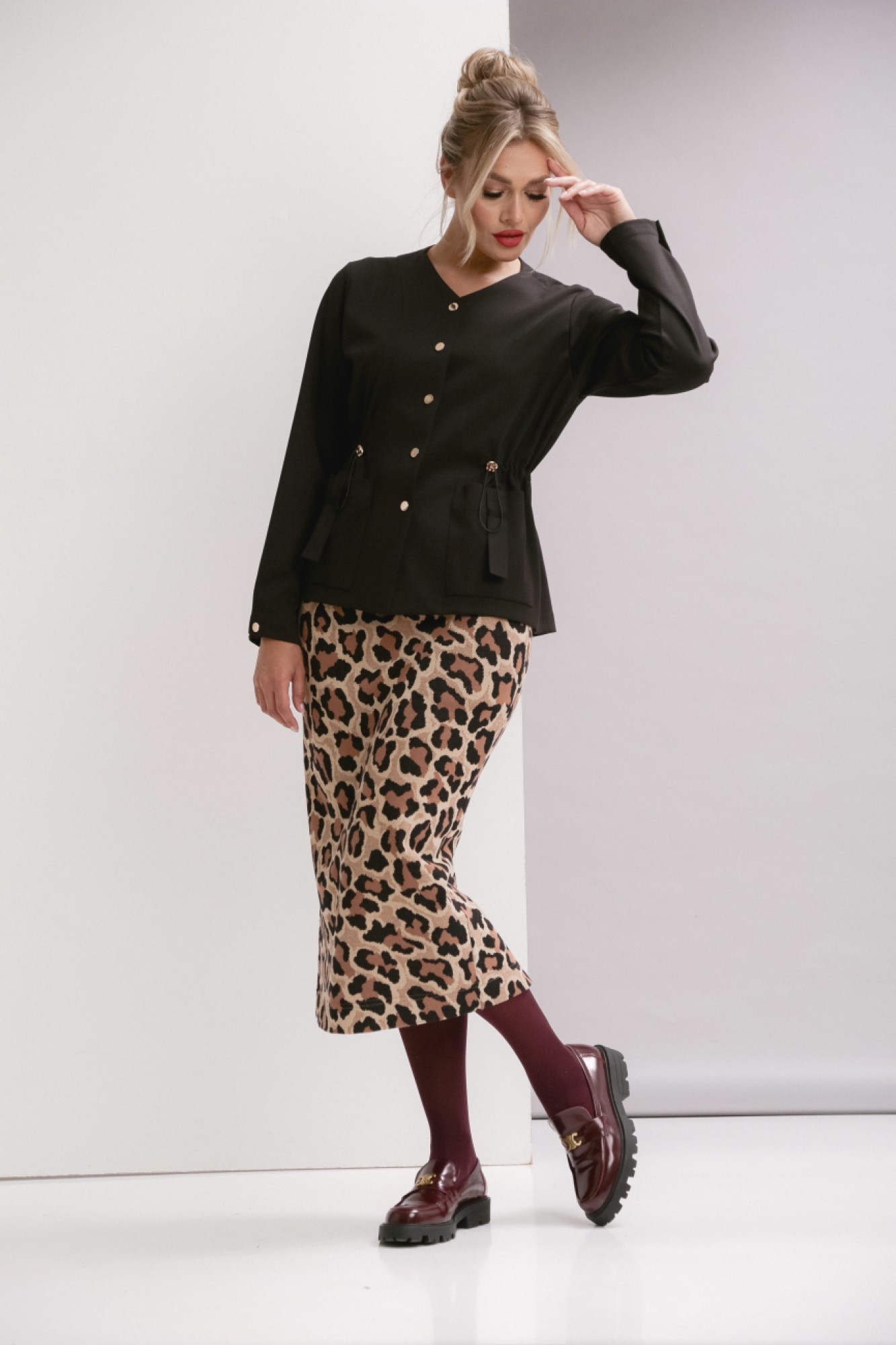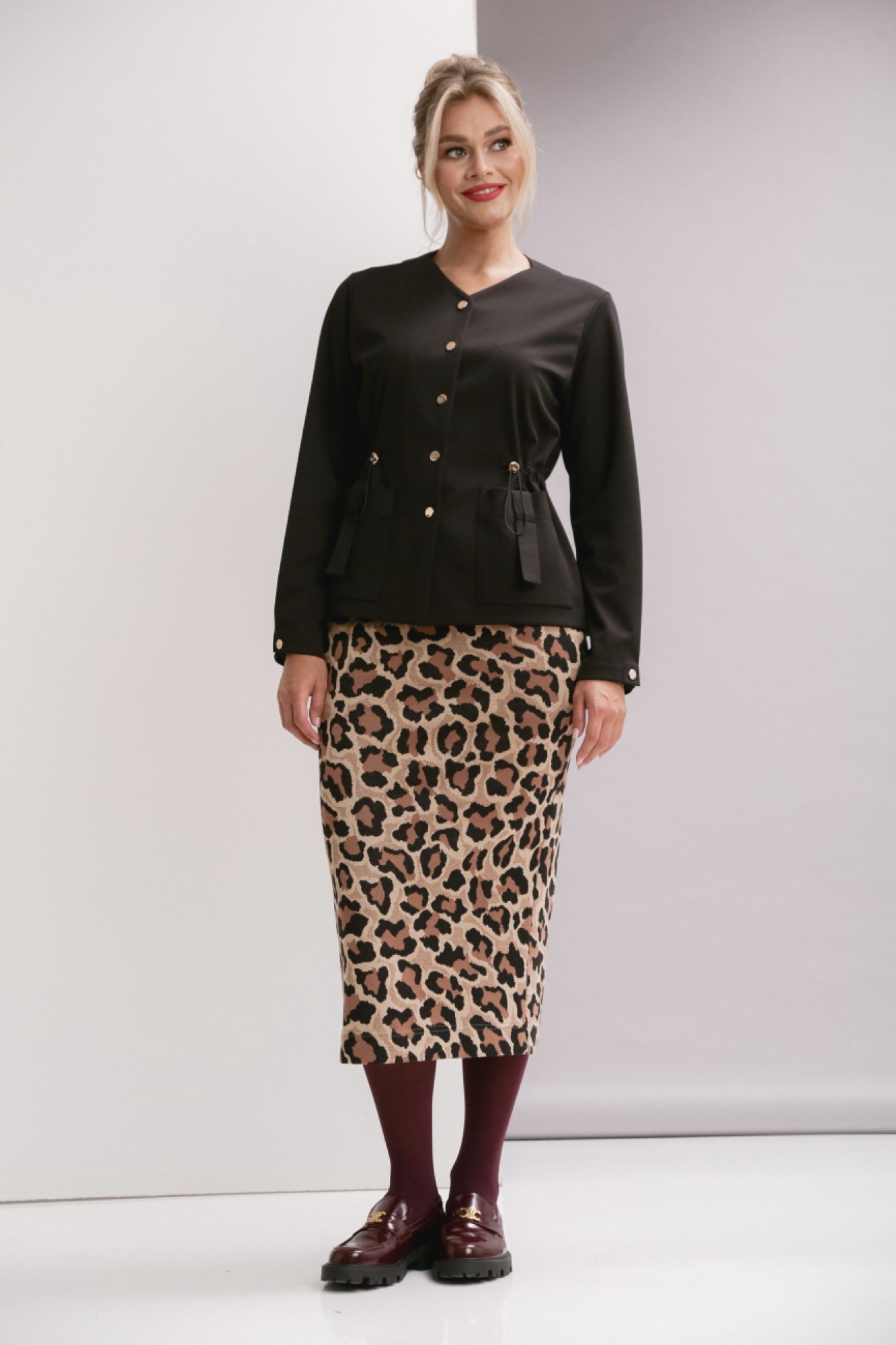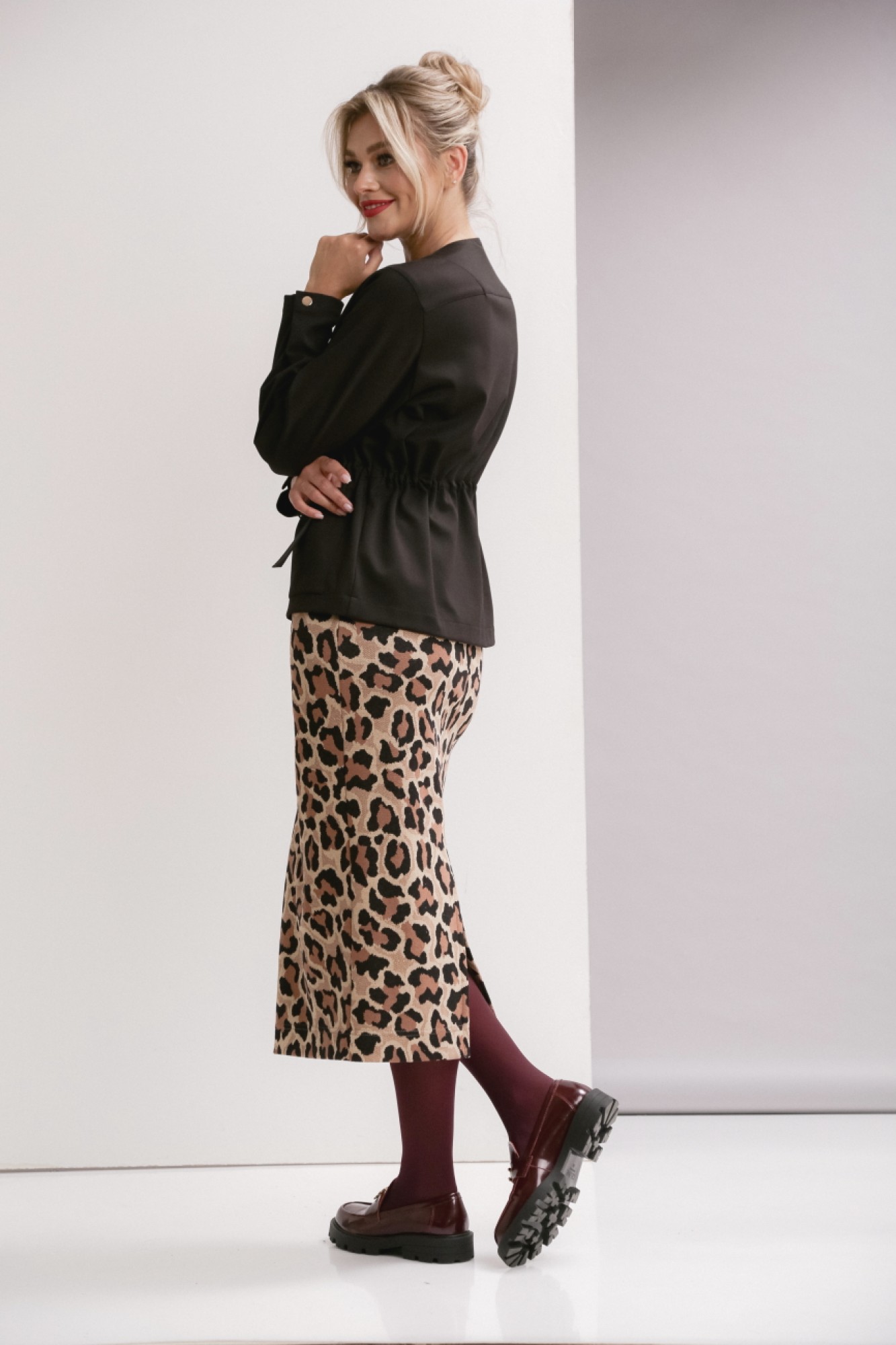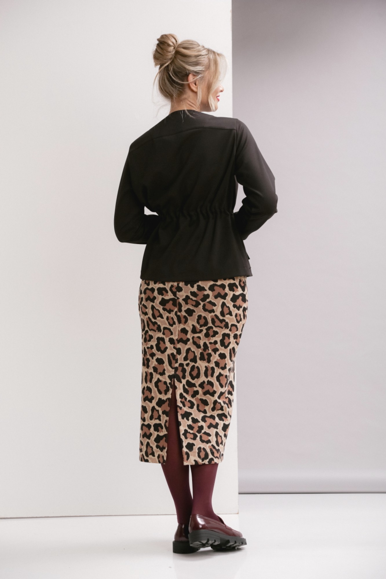 Юбка-карандаш без застежки. Ширина по линии талии регулируется резинкой и декоративным шнуром. В боковых швах карманы, по спинке в среднем шве разрез.