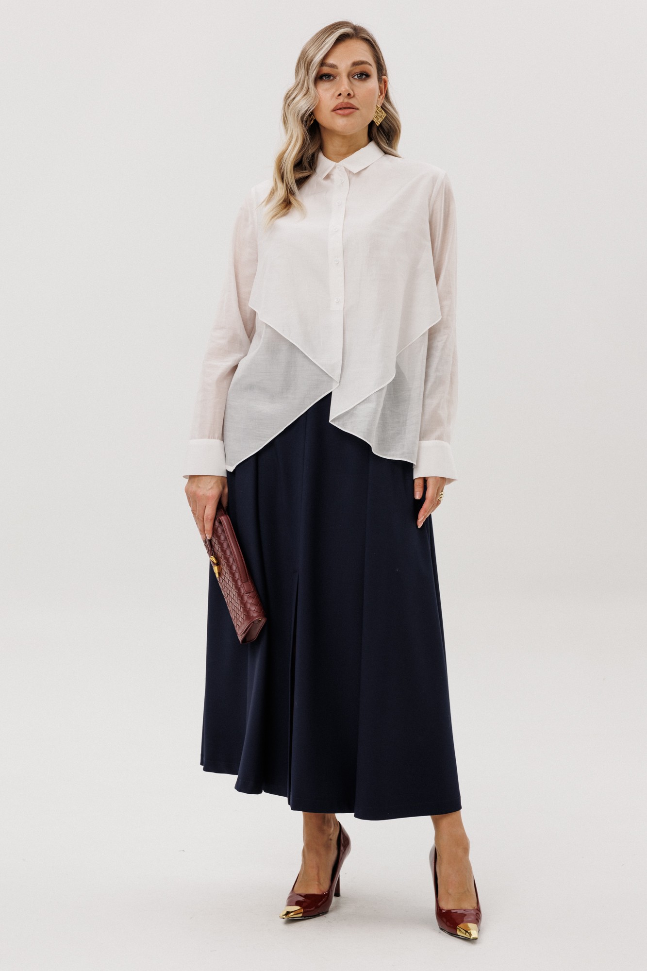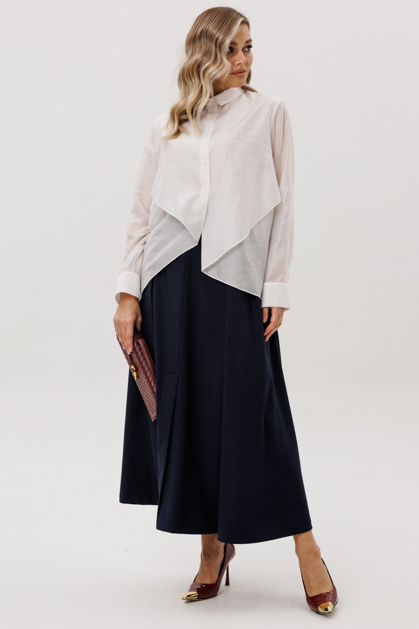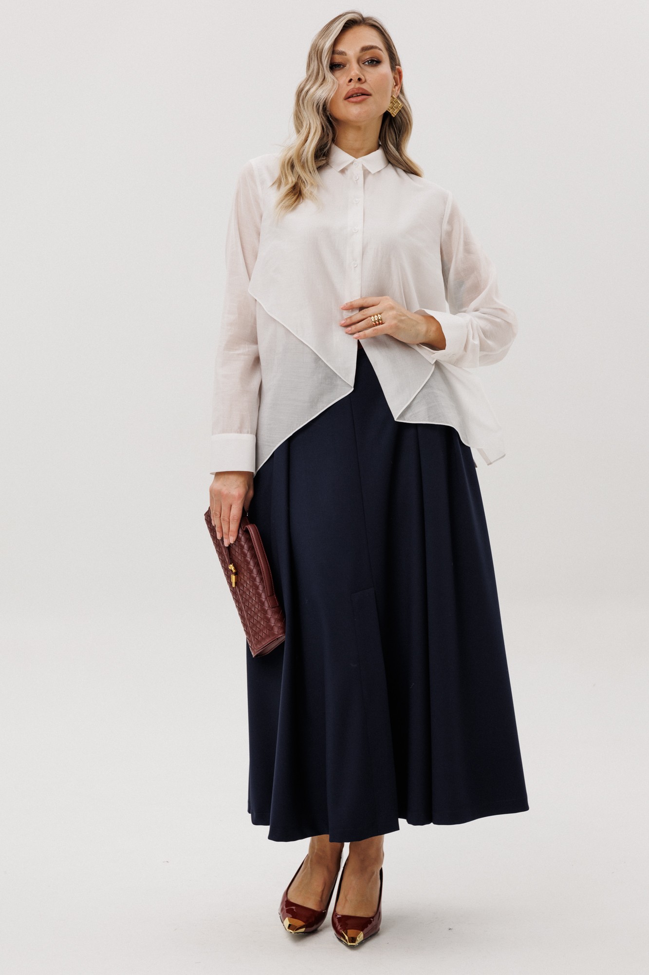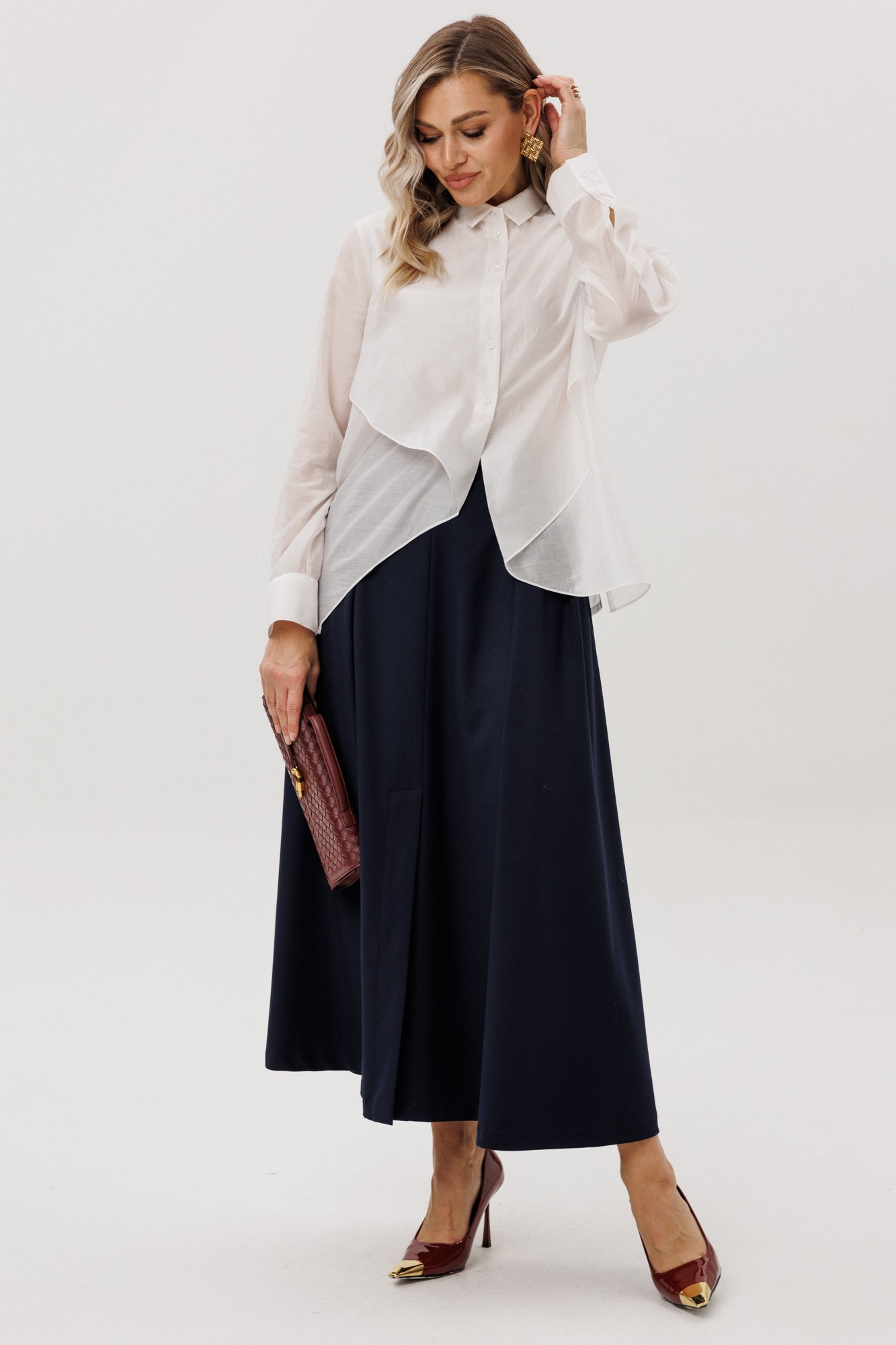 Юбка расклешенная на подкладке. По передней половинке по линии талии складки. По среднему шву передней половинки шлица. В боковых швах карманы. По среднему шву задней половинки по линии талии застежка на потайную тесьму-молнию. Ширина по линии талии регулируется резинкой.