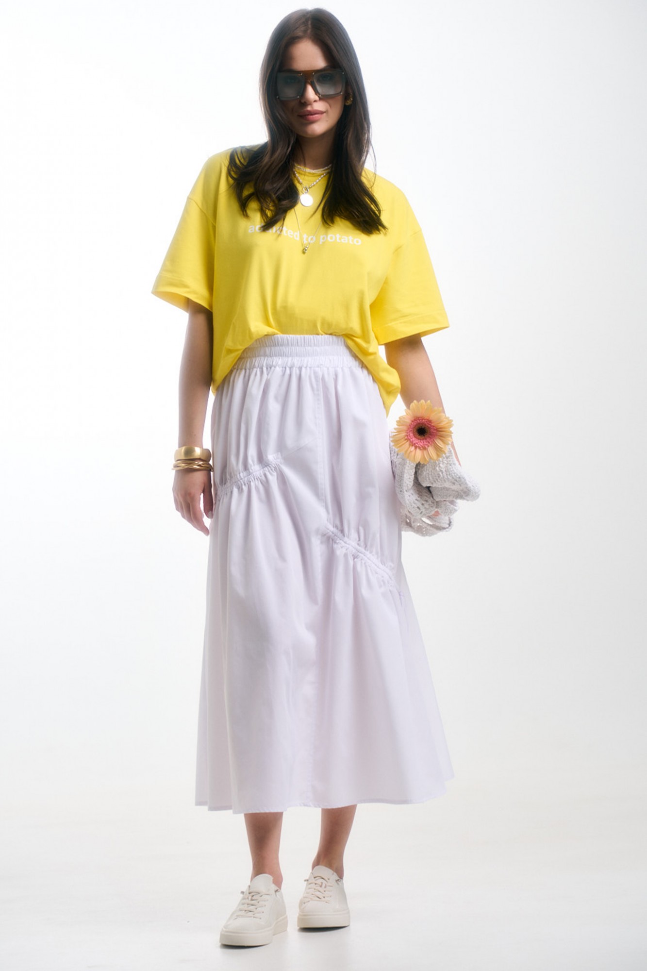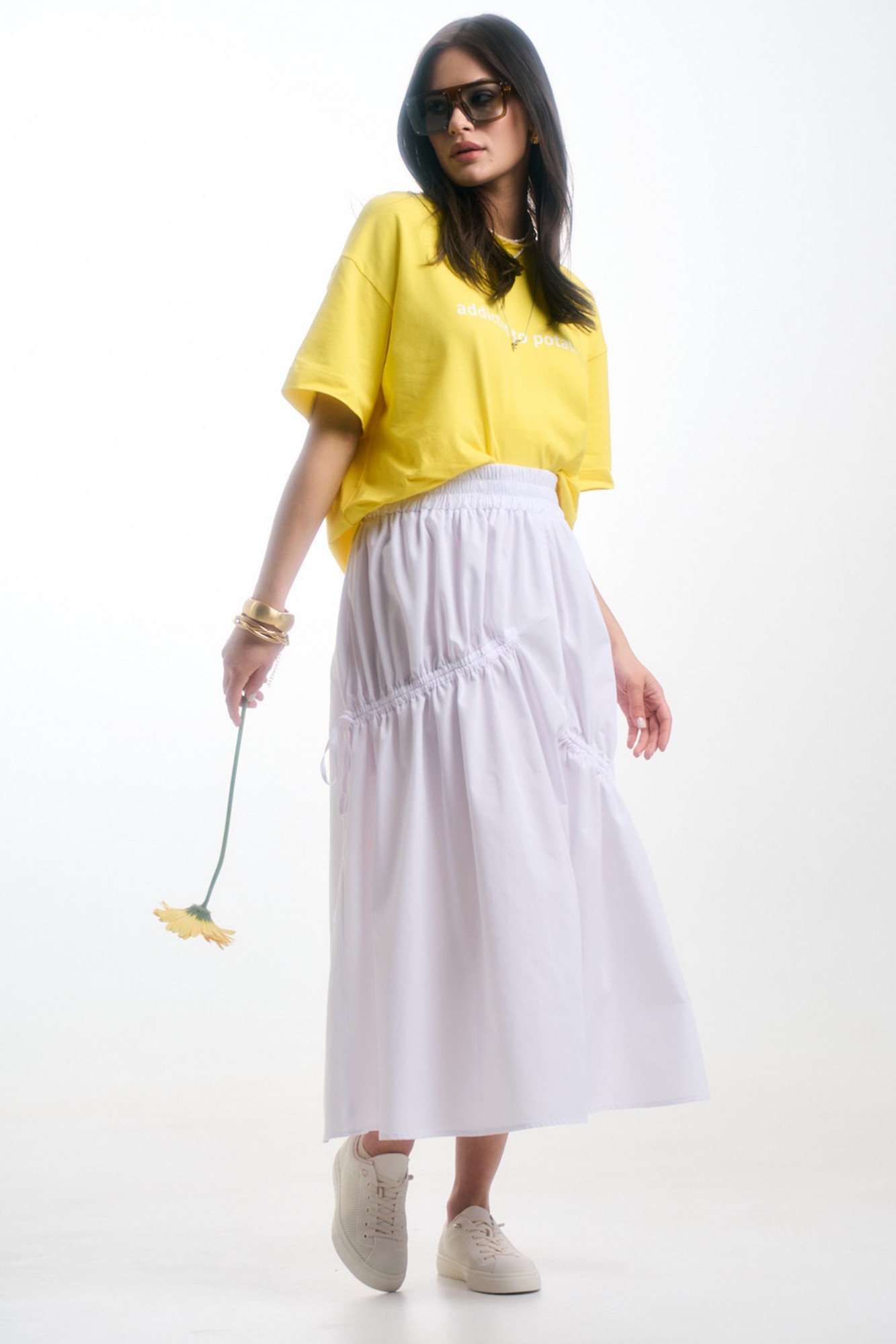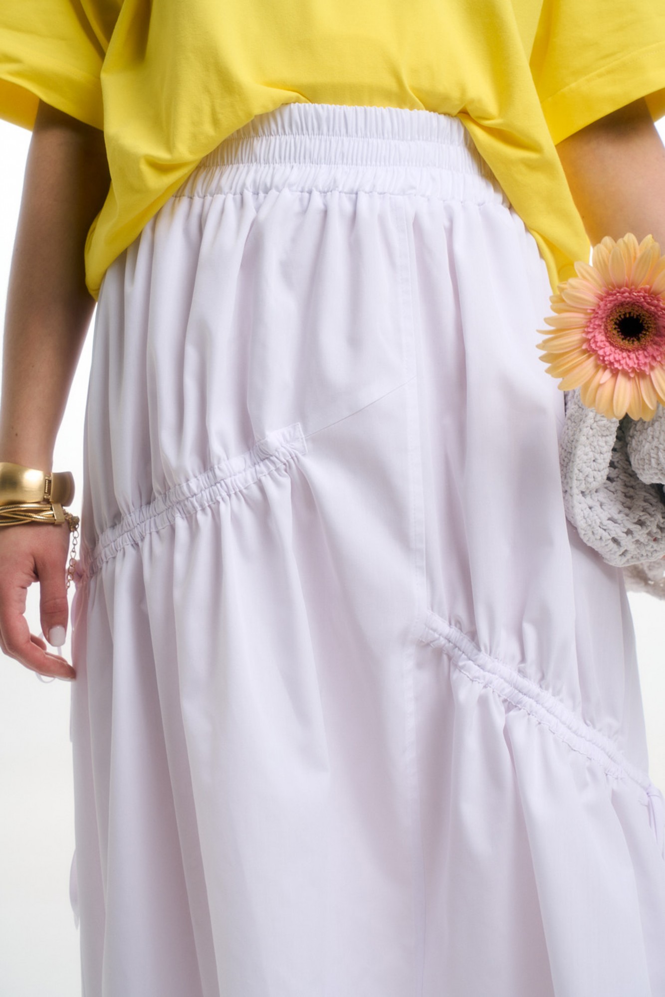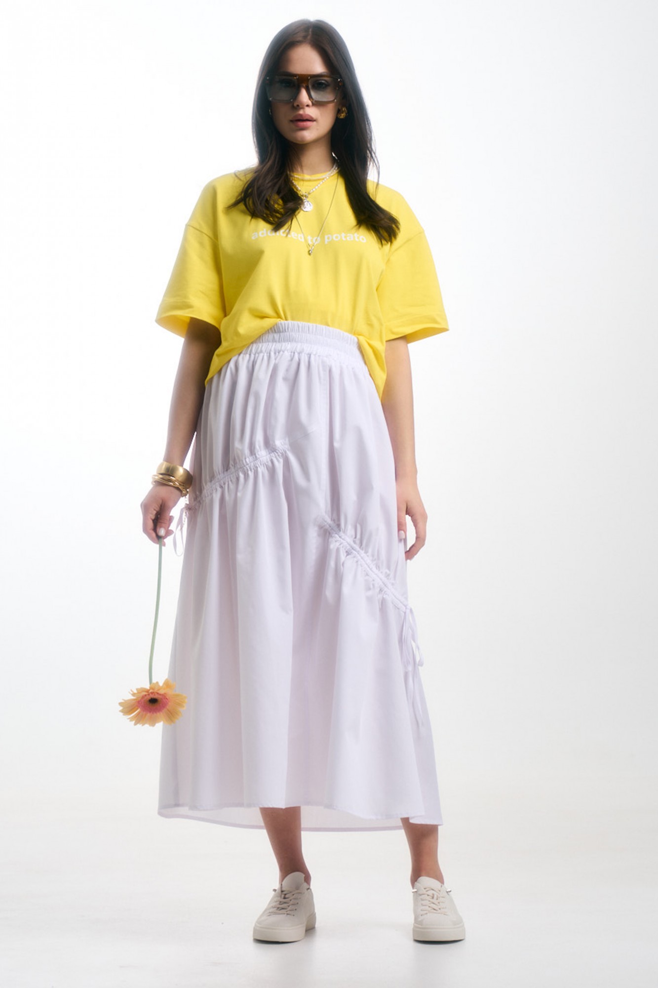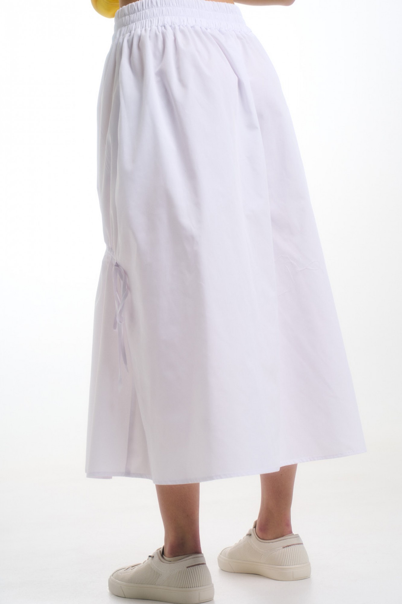 Юбка-полусолнце с декоративными кулисами и шнурками-завязками. Пояс на широкой резинке. Для светлых тонов предусмотрена подкладка.