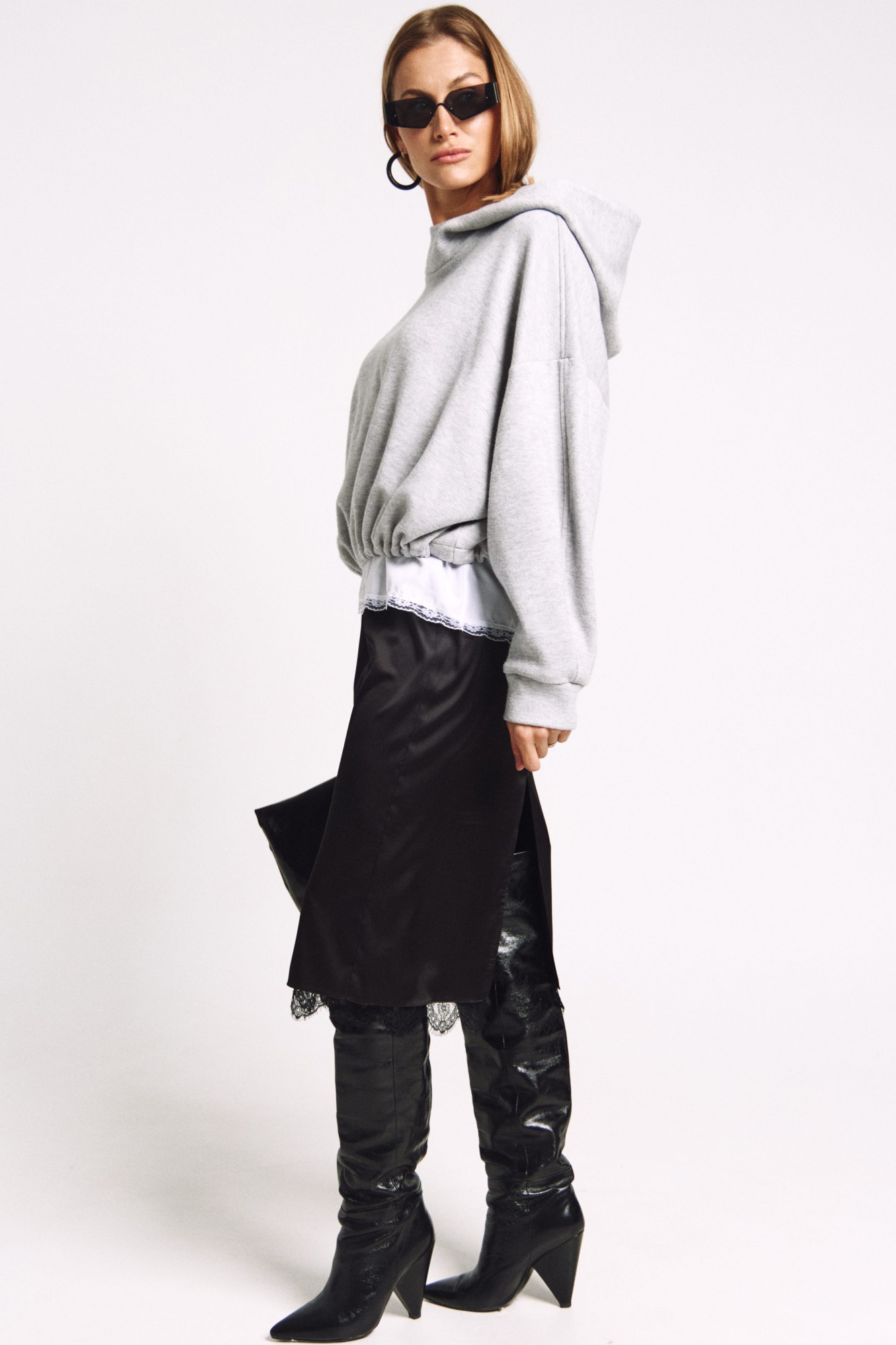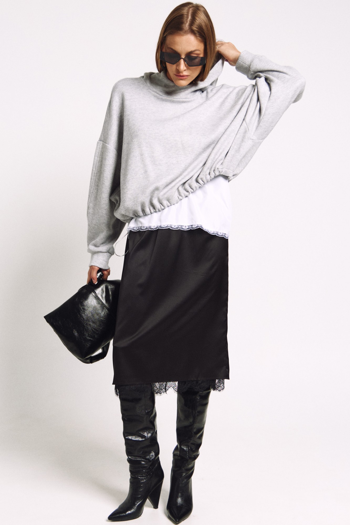 Юбка прямого силуэта на подкладке, к низу подкладки притачано французское кружево черного цвета. Сзади юбки - высокий разрез. Два универсальных размера - S (соответствует 42-44-46), L (соответствует 48-50-52).