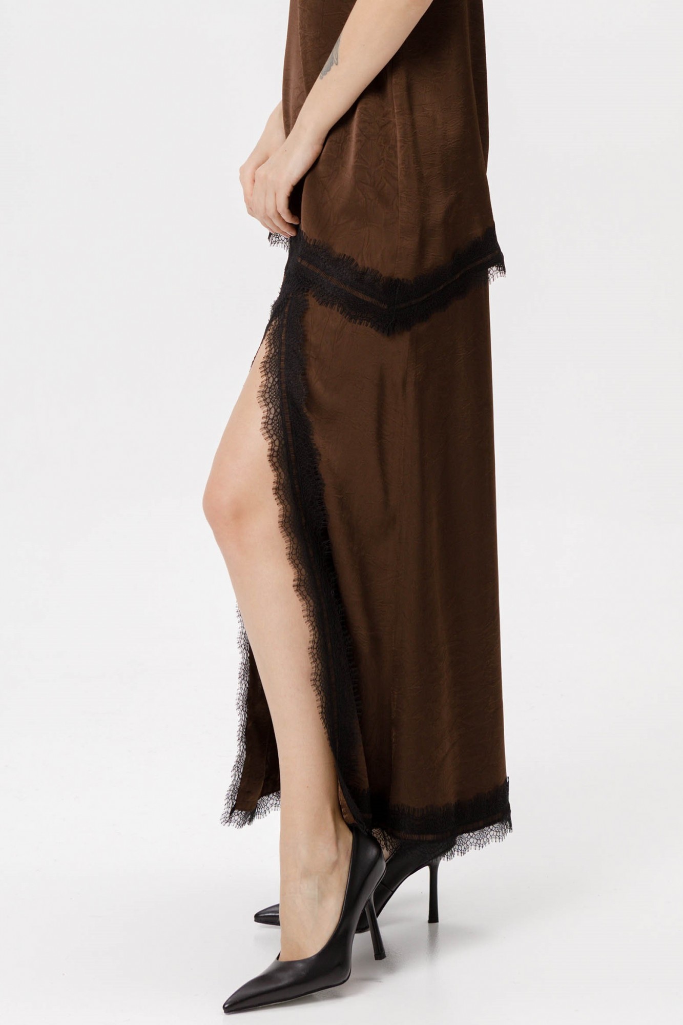 Асимметричная юбка-макси в бельевом стиле с кружевом. Детали: А-силуэт, асимметричная кокетка по переду, разрез с кружевной отделкой, юбка на обтачке с молнией в боковом шве.