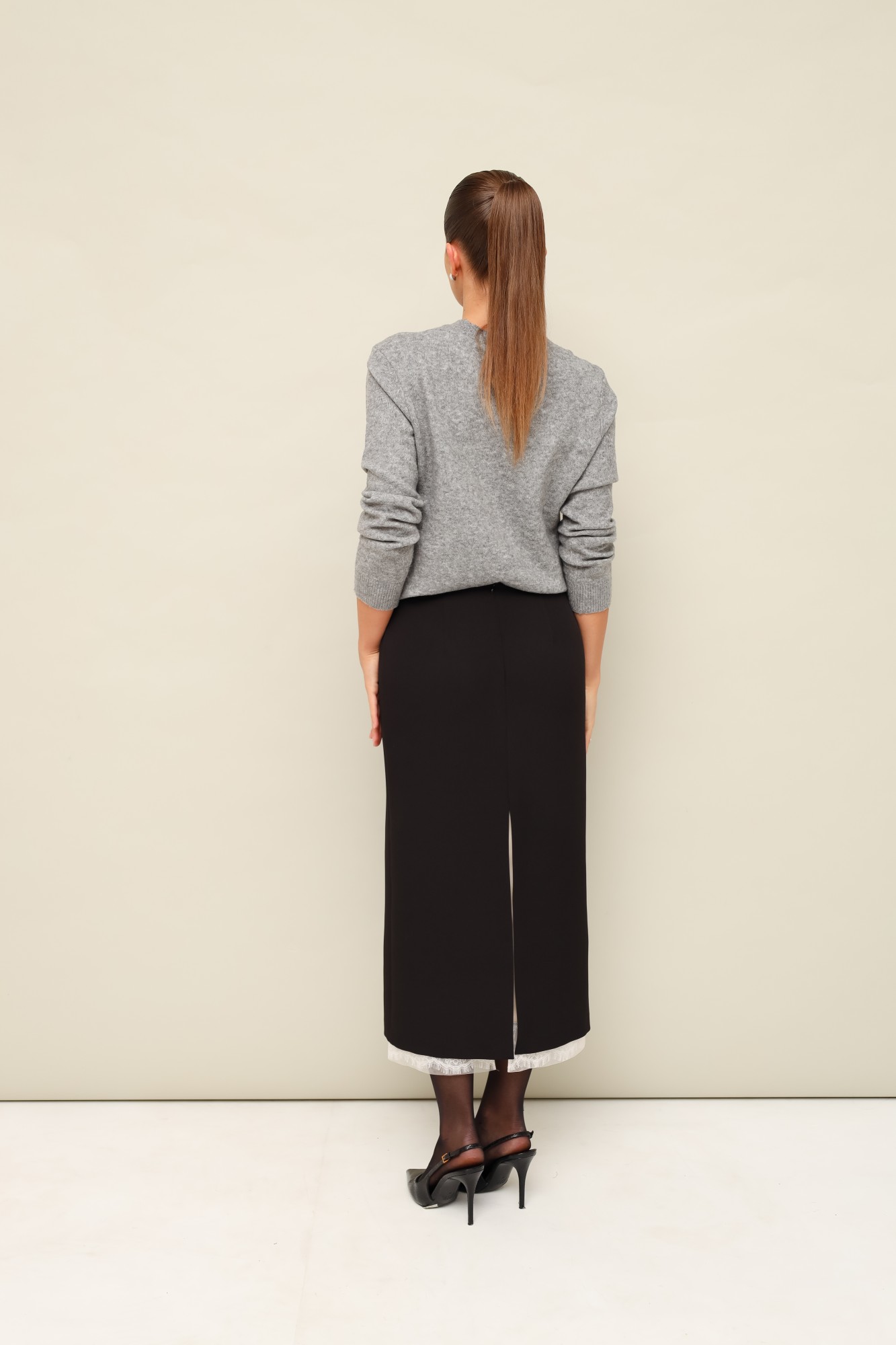 Юбка-карандаш прямого силуэта в длине миди. Верхняя юбка выполнена из костюмно-плательной ткани, пояс на обтачке, застёжка на потайную молнию в среднем шве по спинке. Нижняя юбка на резинке по поясу, низ обработан кружевной отделкой с сеткой. Для удобства движения сзади по юбкам обработаны разрезы.