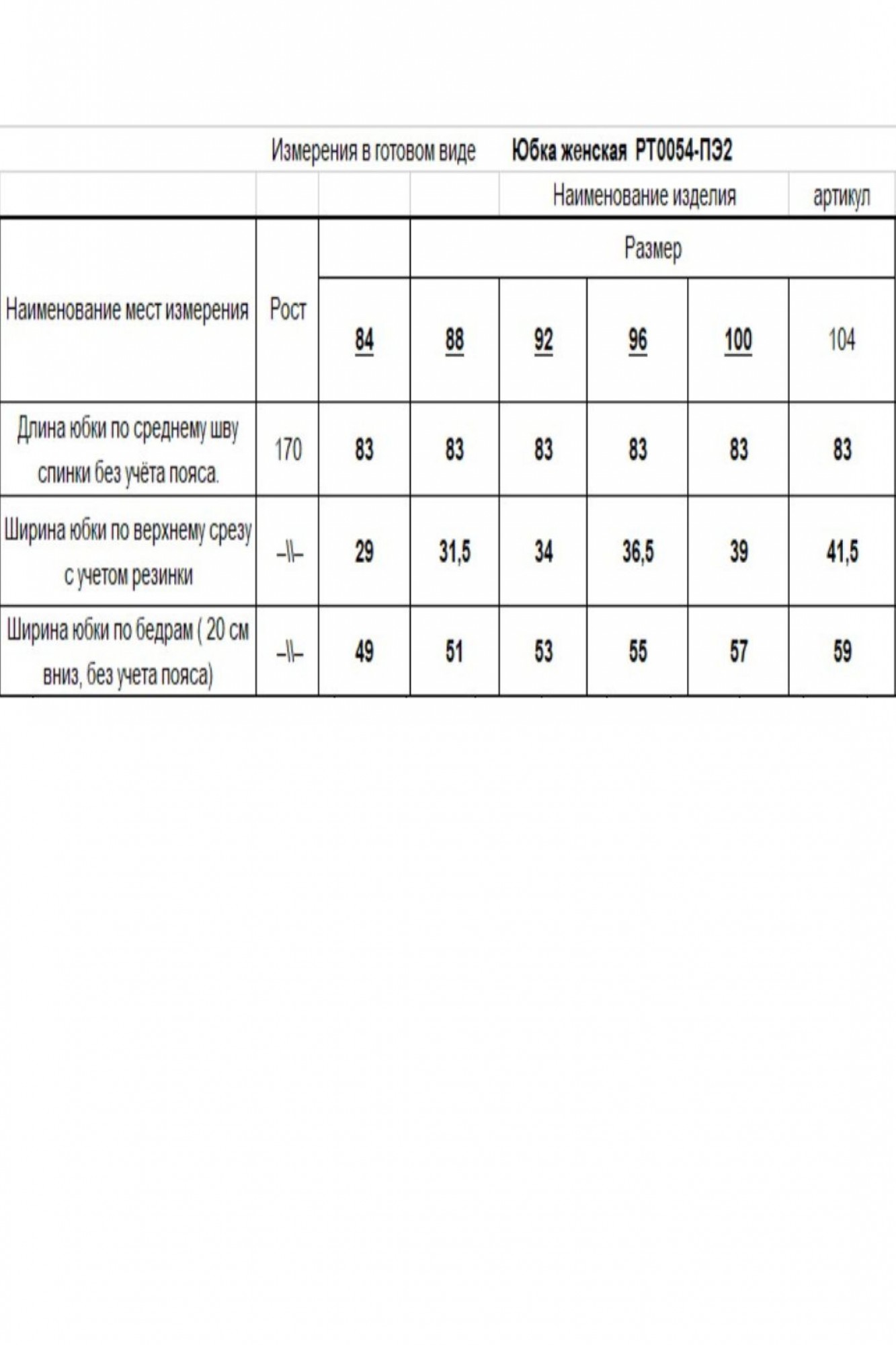Таблица размеров