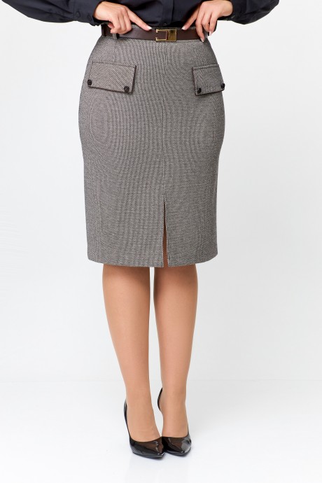 Юбка полуприлегающего силуэта на подкладке. Выполнена из мягкого трикотажного полотна. Юбка со средним швом по переду и спинке. В средний шве спинки обработана потайная молния. По низу среднего шва переда находится разрез. По переду в области бёдер расположены настрочные клапаны с кантом, на которые пришиты декоративные пуговицы. По переднему и заднему полотнищу юбки - талиевые вытачки. Верх юбки обработан притачным поясом, в который закреплены шлёвки для декоративного ремня, который входит в комплект.