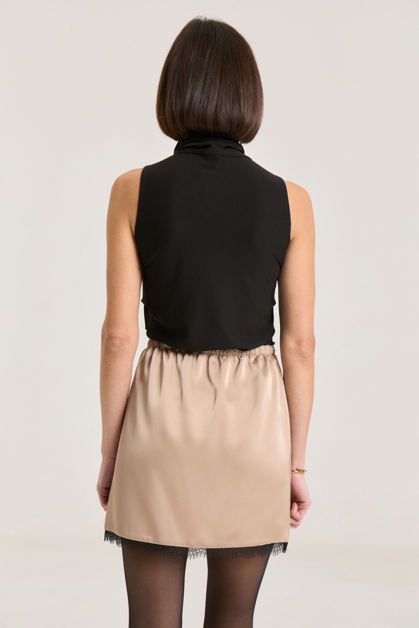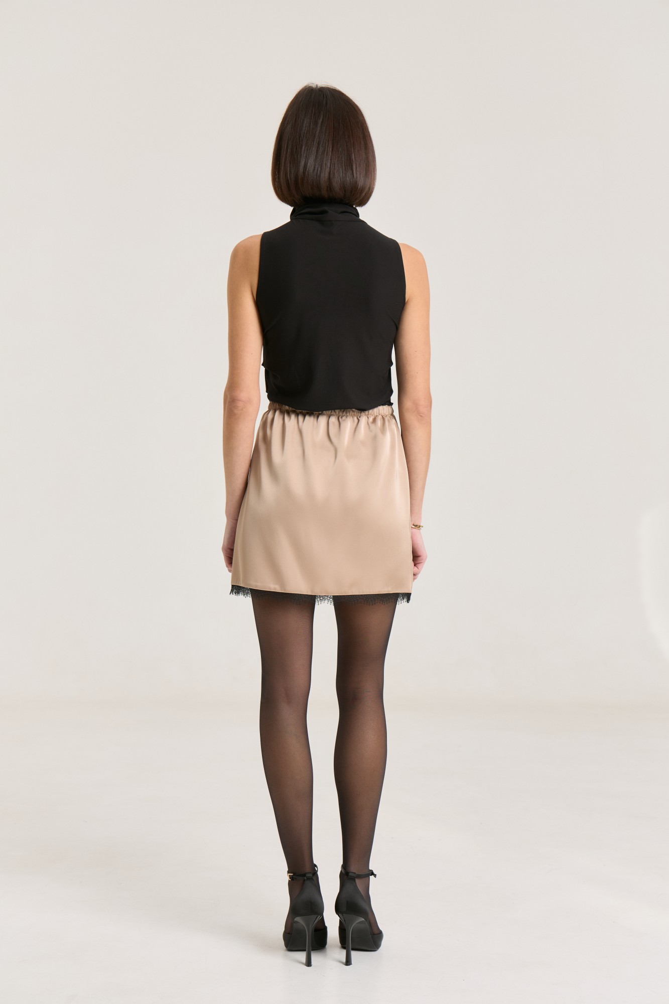 Атласная мини-юбка прямого кроя, на резинке, по низу кружево, пояс обработан декоративной тесьмой. Атлас плотный, не просвечивает. Юбку можно носить с топами, свитерами, жакетами, рубашками в любое время года.